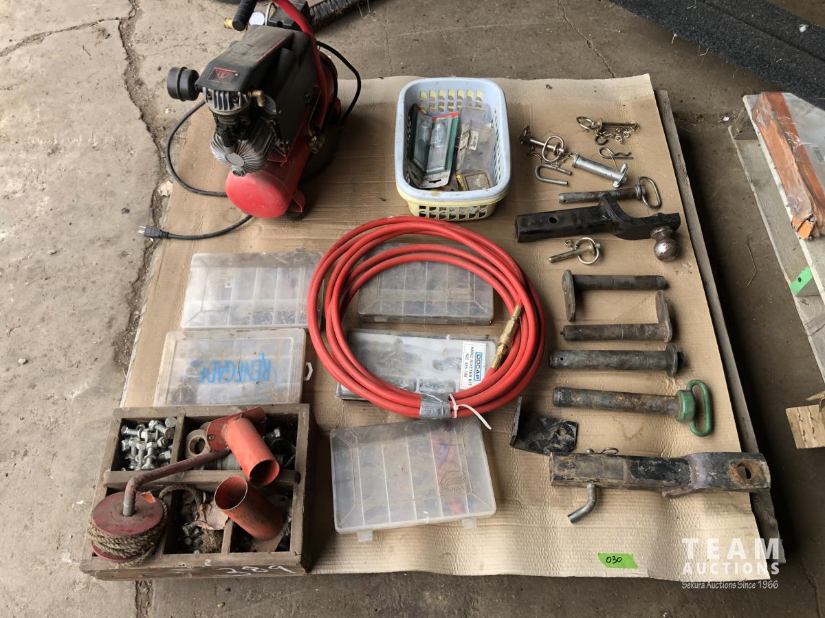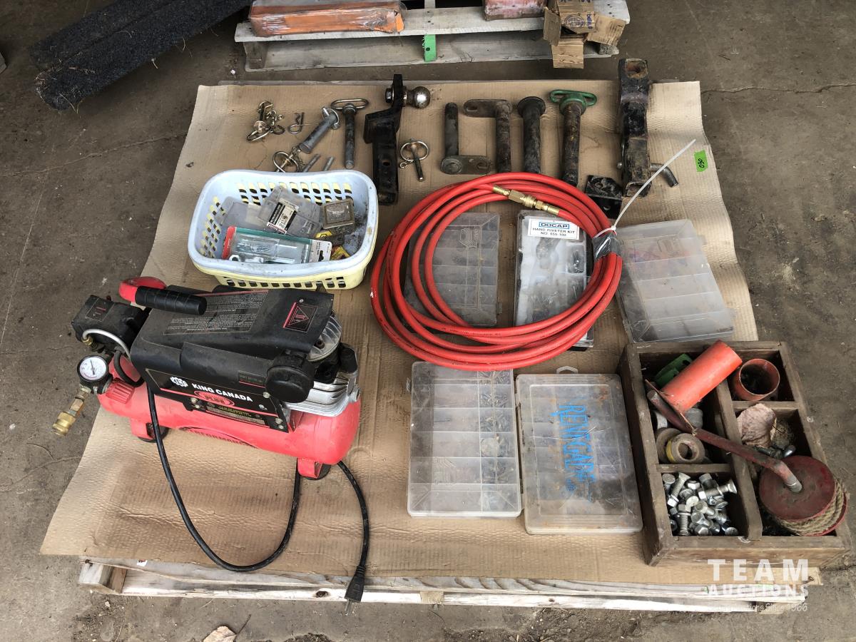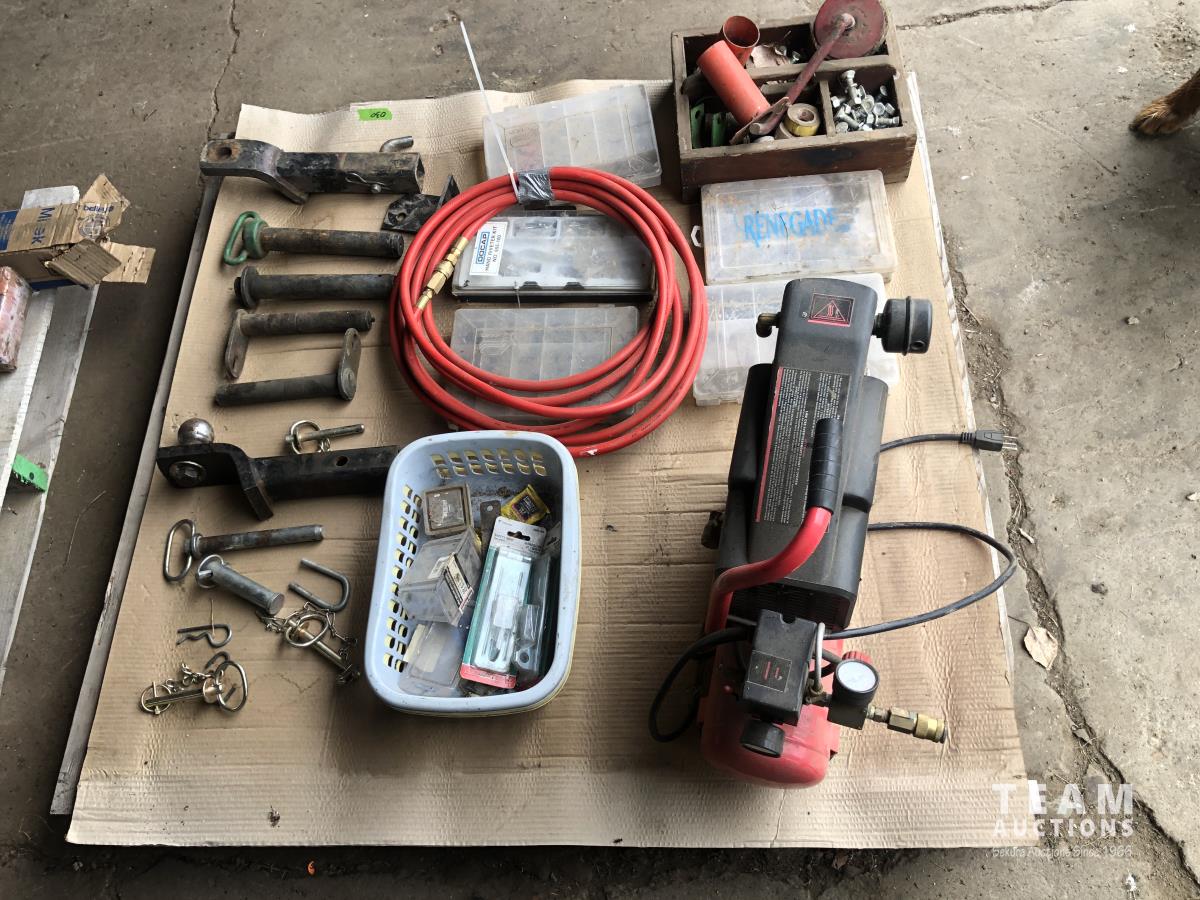 32 (2) Tow Hitches, King 1.5 HP Air Compressor, Qty of Hitch Pins, Misc Hardware