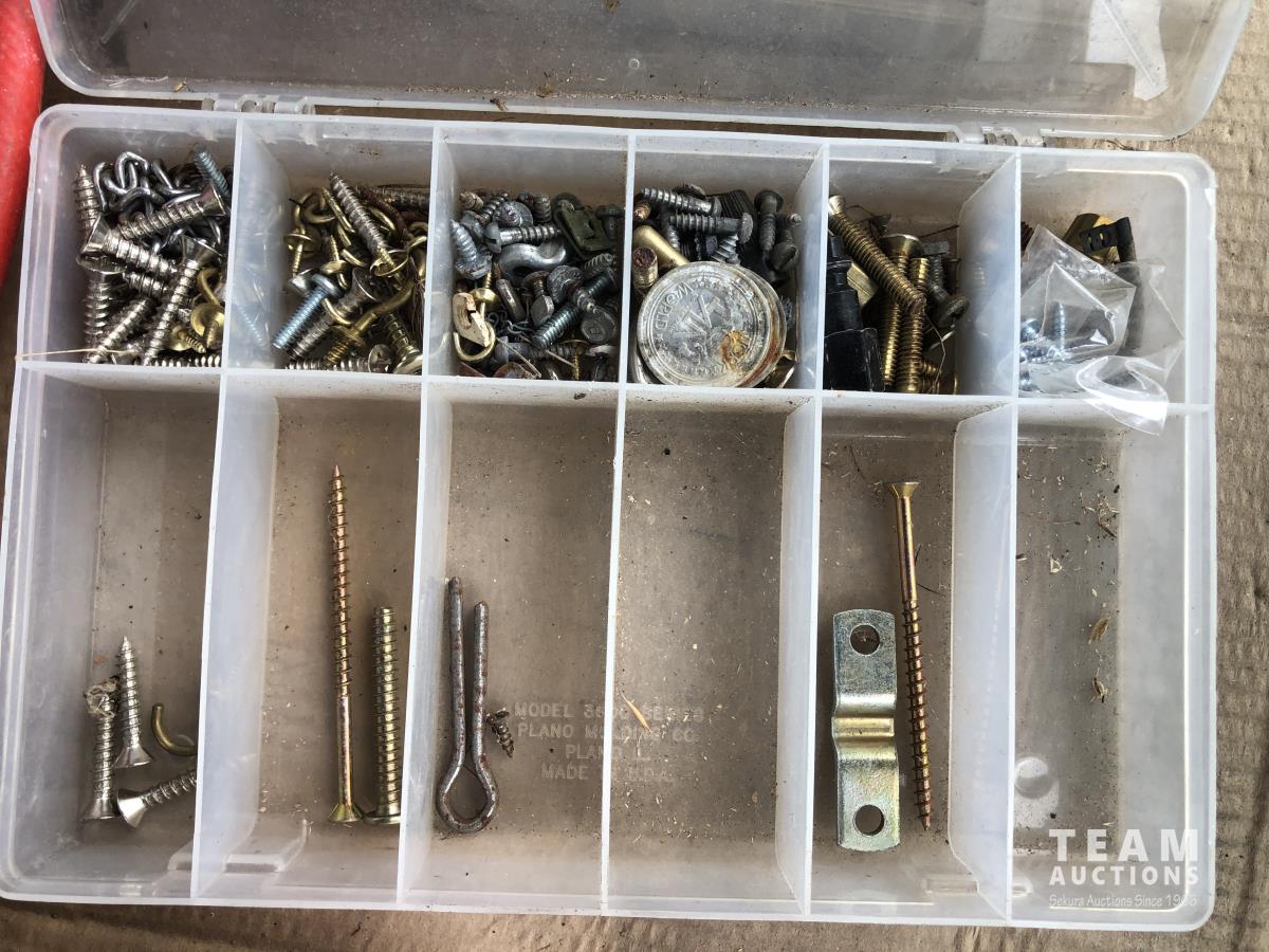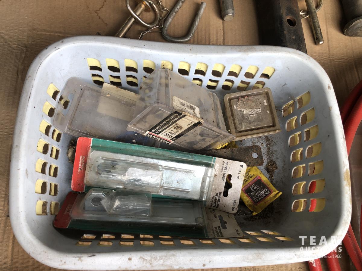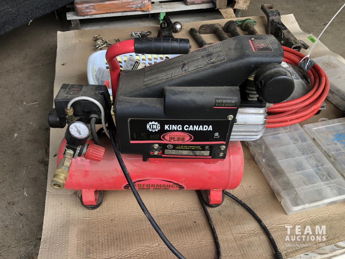 32 (2) Tow Hitches, King 1.5 HP Air Compressor, Qty of Hitch Pins, Misc Hardware