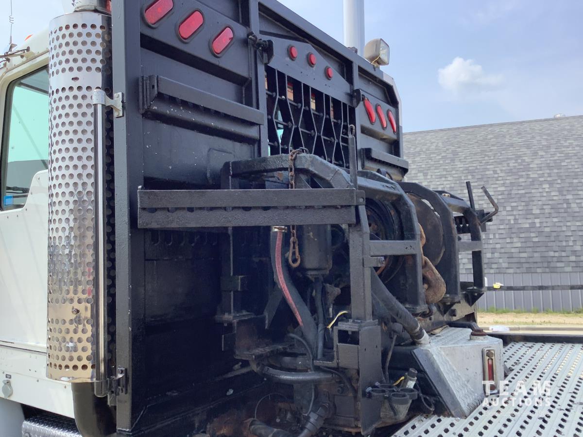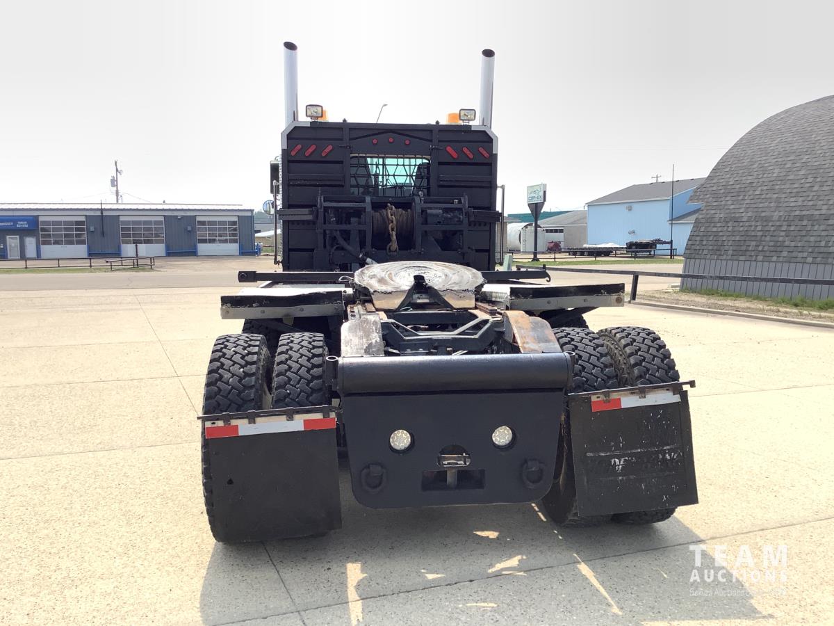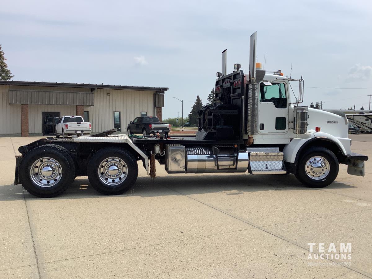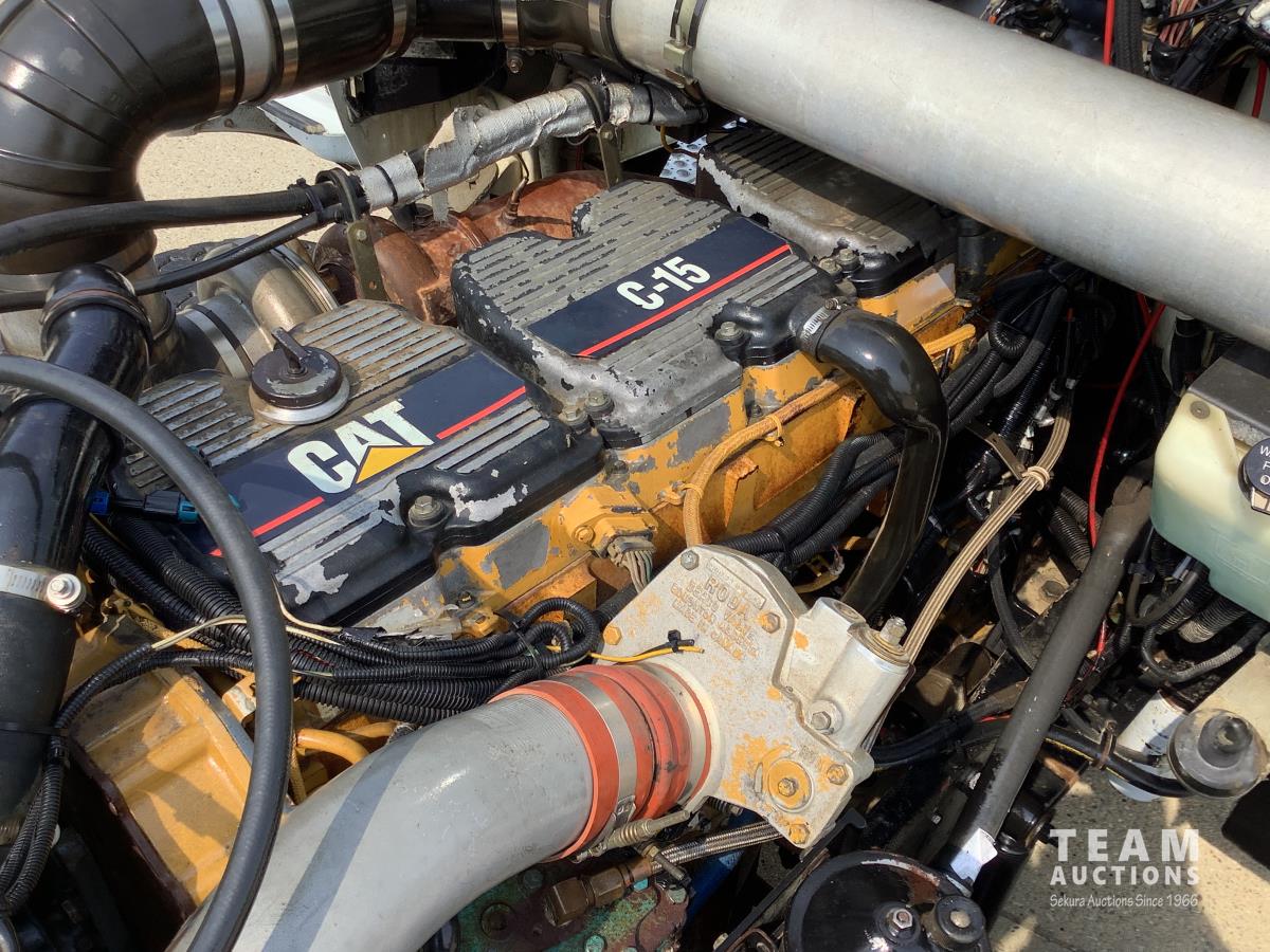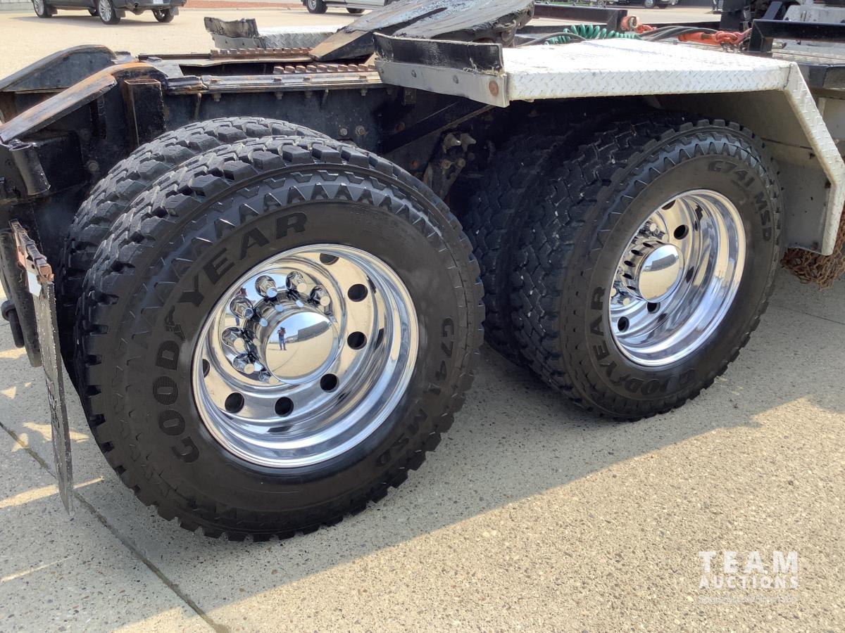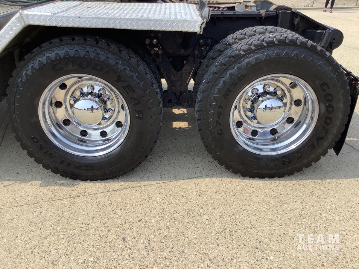Caterpillar C15 6NZ 6 cylinder single turbo 500 HP engine, engine brake, Eaton Fuller 18 speed manual transmission, 30 T hydraulic winch, front air assist suspension, air ride suspension, 13,200 lb front axle, 46,000 lb rear axles, 4 way lockers, air sliding 5th wheel, headache rack, aluminum decking, 2 tool boxes, tire chains, rear live roll, rear tow hitch, beacon lights, all aluminum wheels, 385/65R22.5 front tires, 11R24.5 rear tires