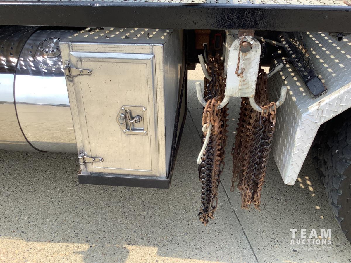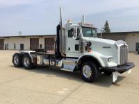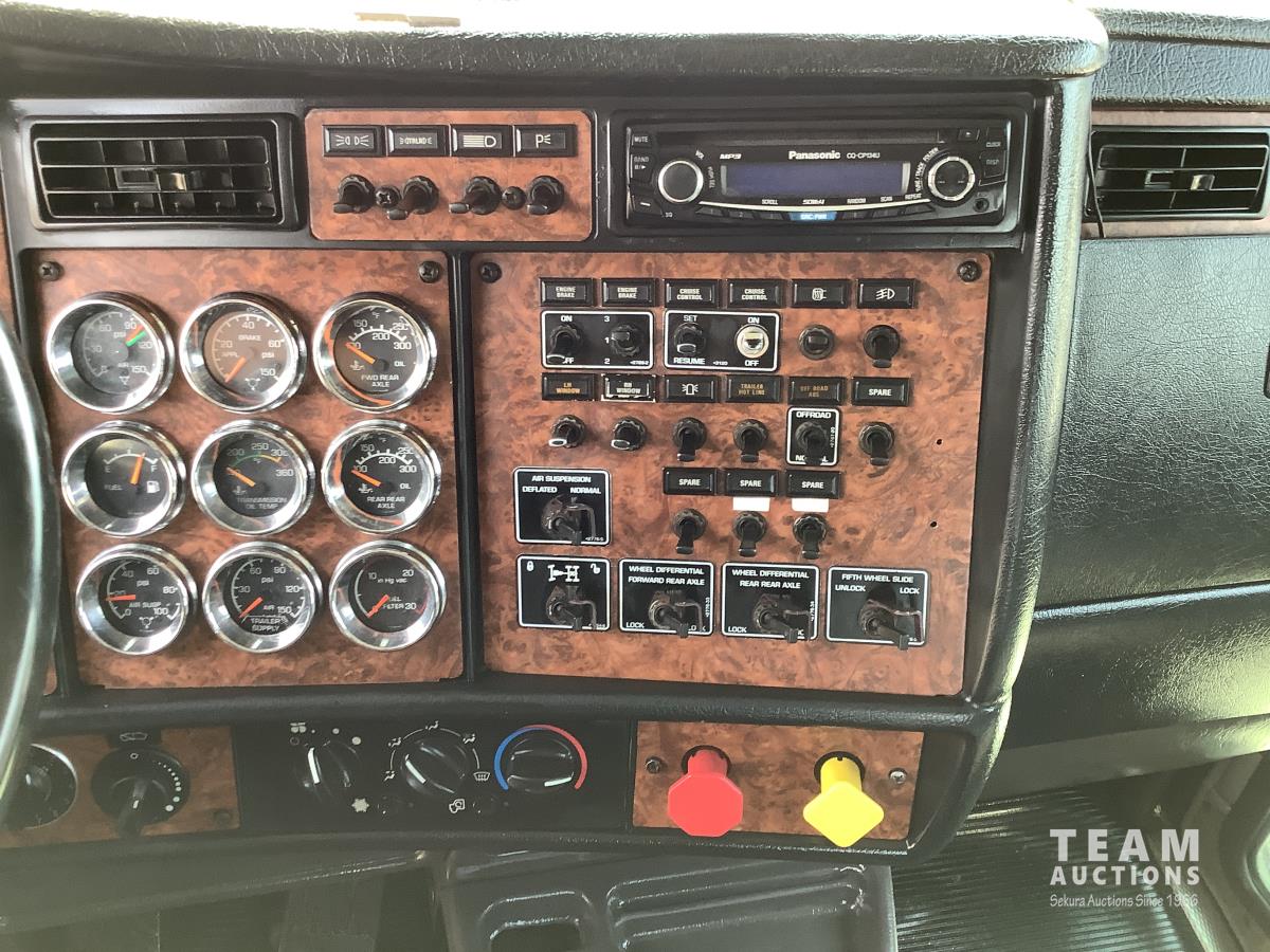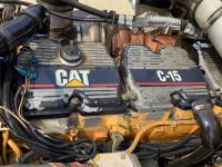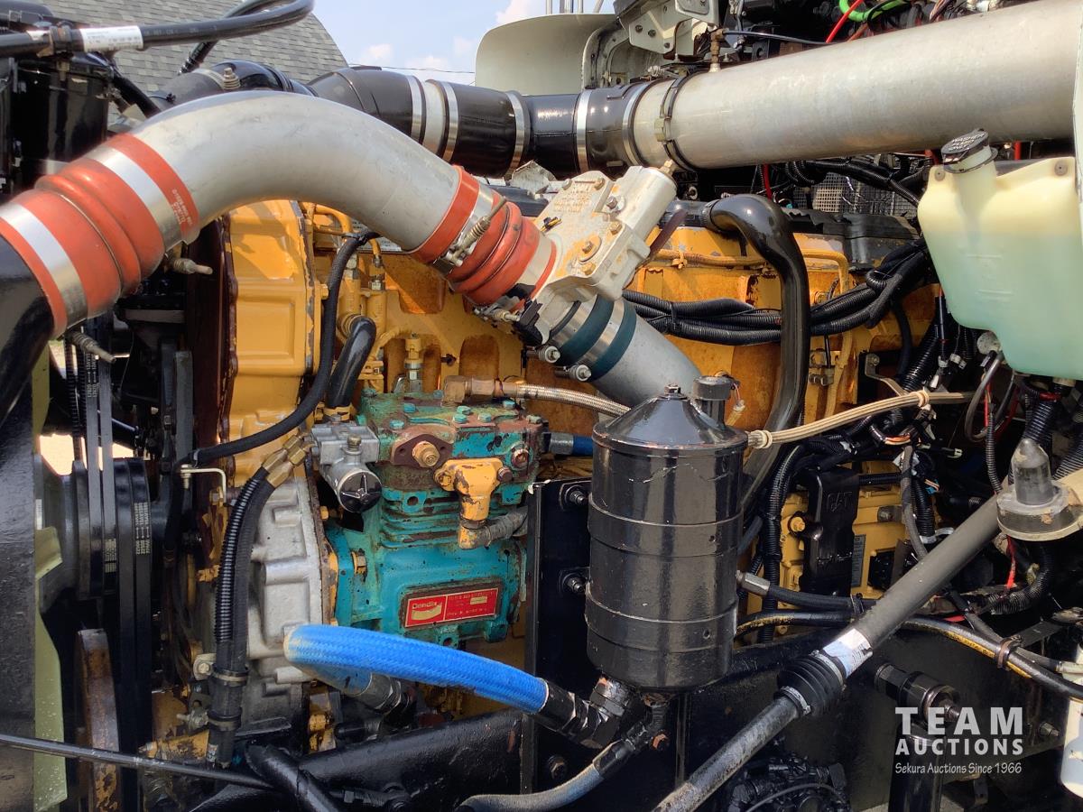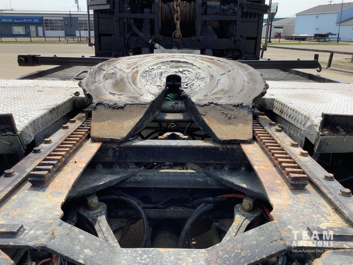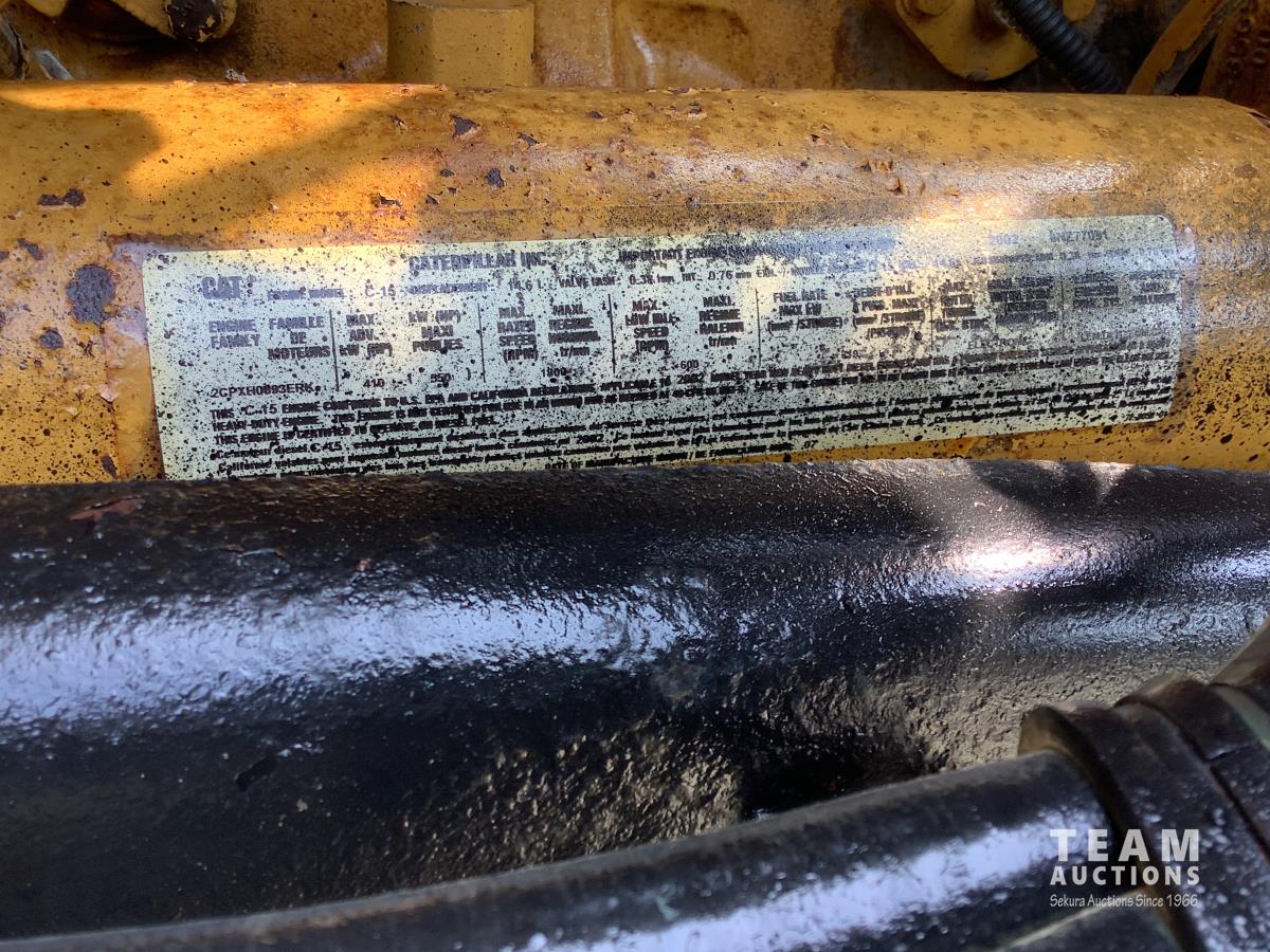 Caterpillar C15 6NZ 6 cylinder single turbo 500 HP engine, engine brake, Eaton Fuller 18 speed manual transmission, 30 T hydraulic winch, front air assist suspension, air ride suspension, 13,200 lb front axle, 46,000 lb rear axles, 4 way lockers, air sliding 5th wheel, headache rack, aluminum decking, 2 tool boxes, tire chains, rear live roll, rear tow hitch, beacon lights, all aluminum wheels, 385/65R22.5 front tires, 11R24.5 rear tires