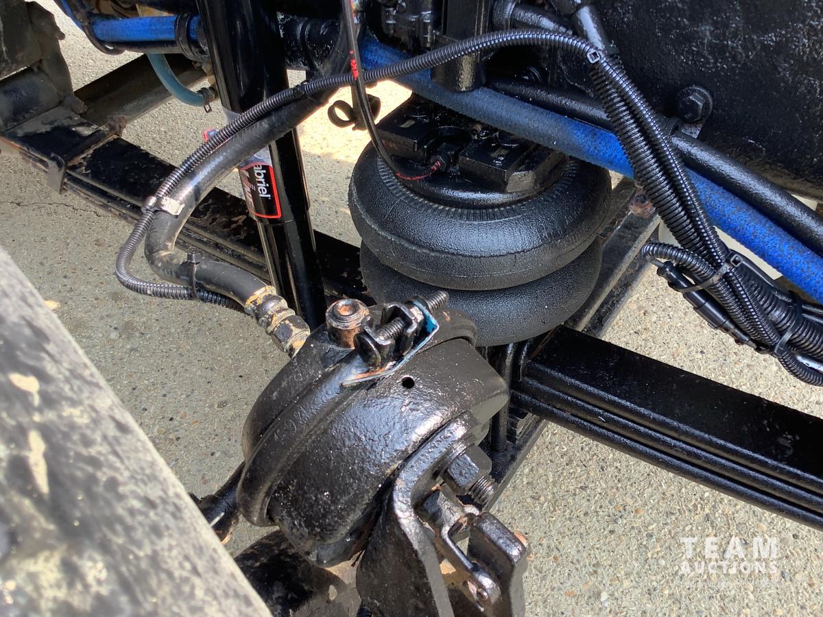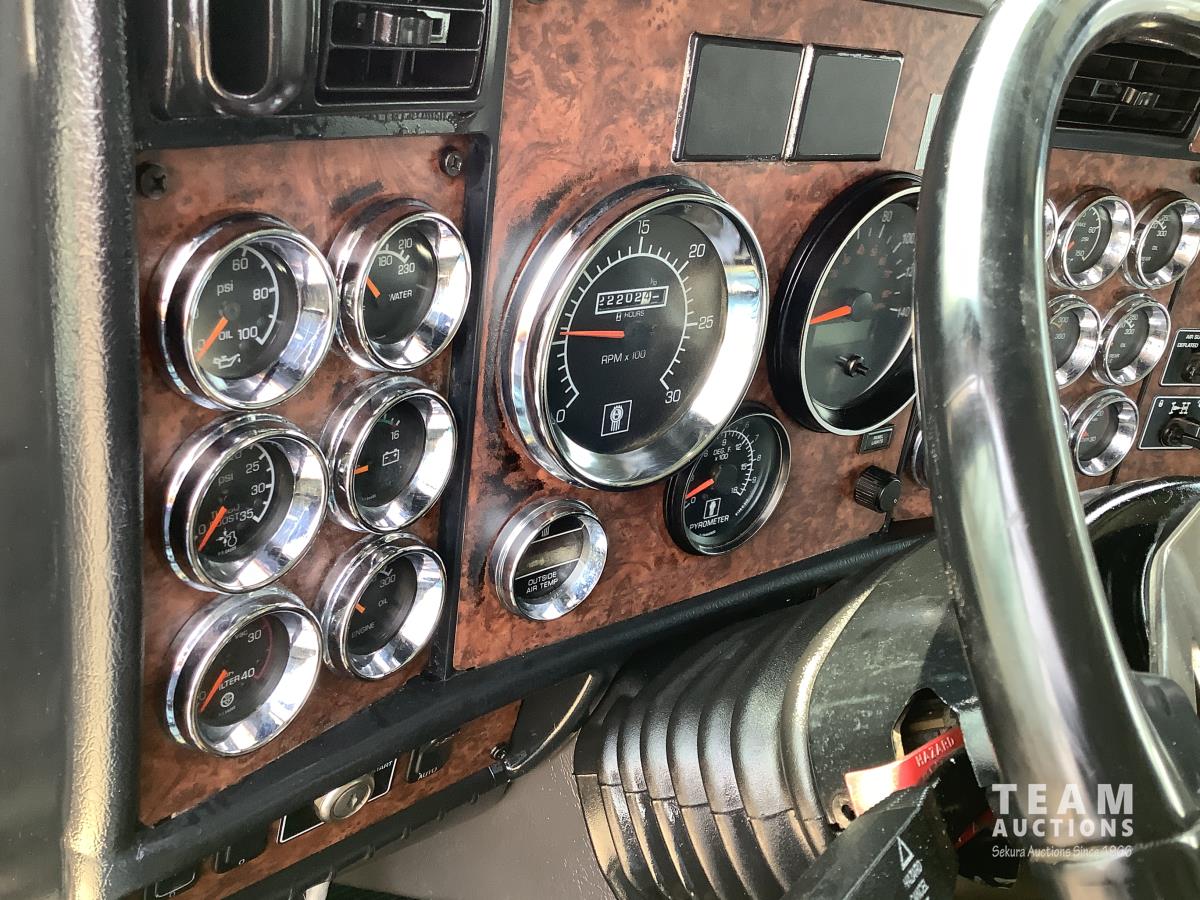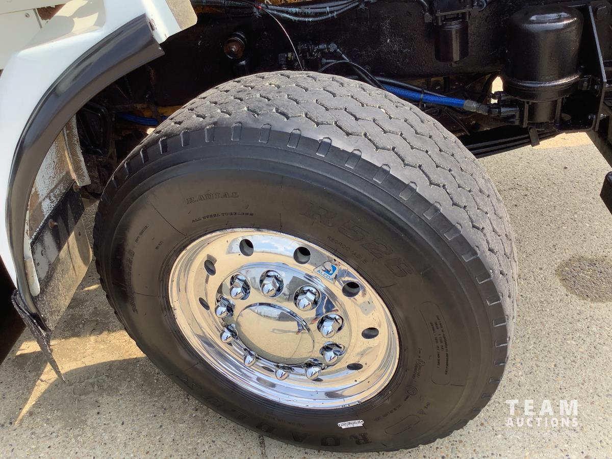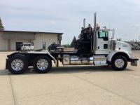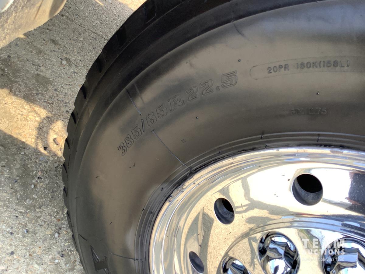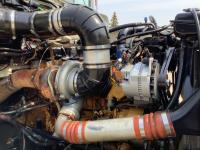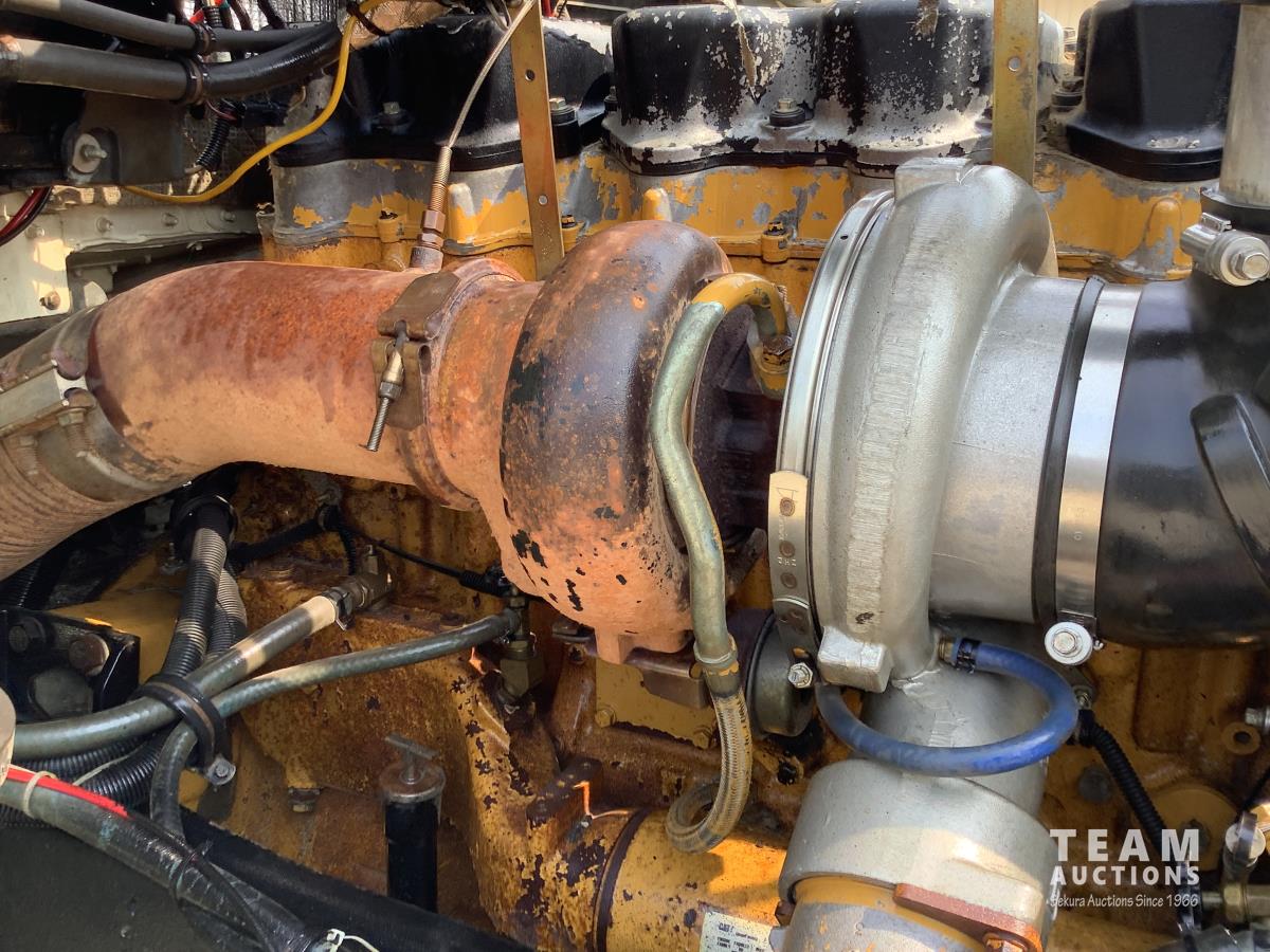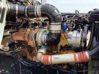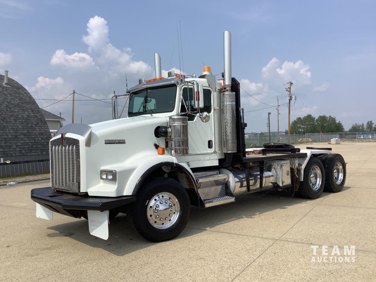 Caterpillar C15 6NZ 6 cylinder single turbo 500 HP engine, engine brake, Eaton Fuller 18 speed manual transmission, 30 T hydraulic winch, front air assist suspension, air ride suspension, 13,200 lb front axle, 46,000 lb rear axles, 4 way lockers, air sliding 5th wheel, headache rack, aluminum decking, 2 tool boxes, tire chains, rear live roll, rear tow hitch, beacon lights, all aluminum wheels, 385/65R22.5 front tires, 11R24.5 rear tires