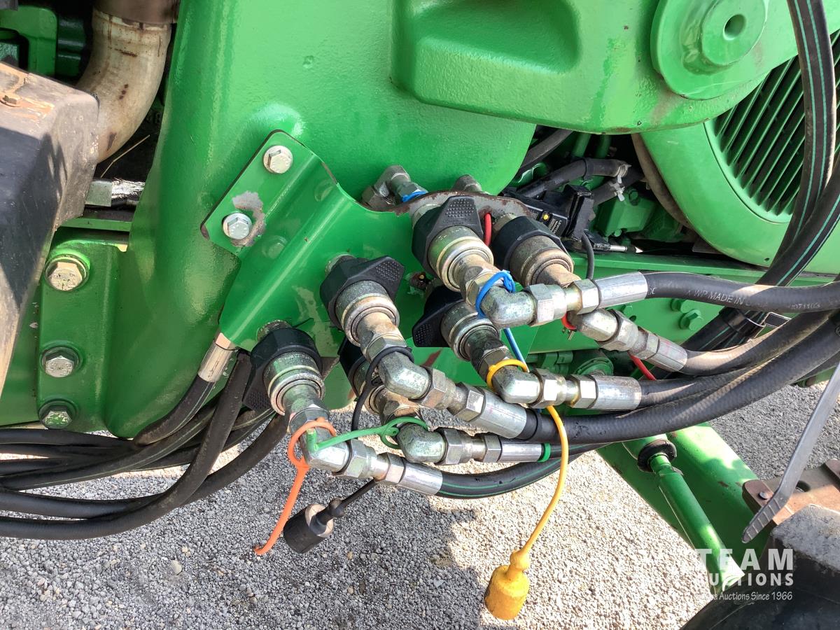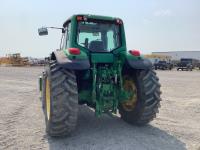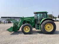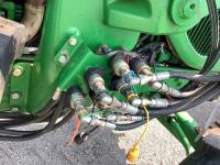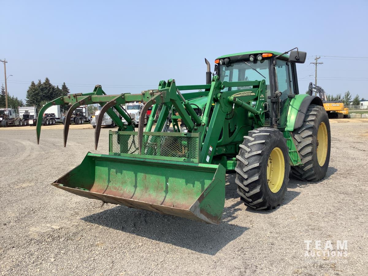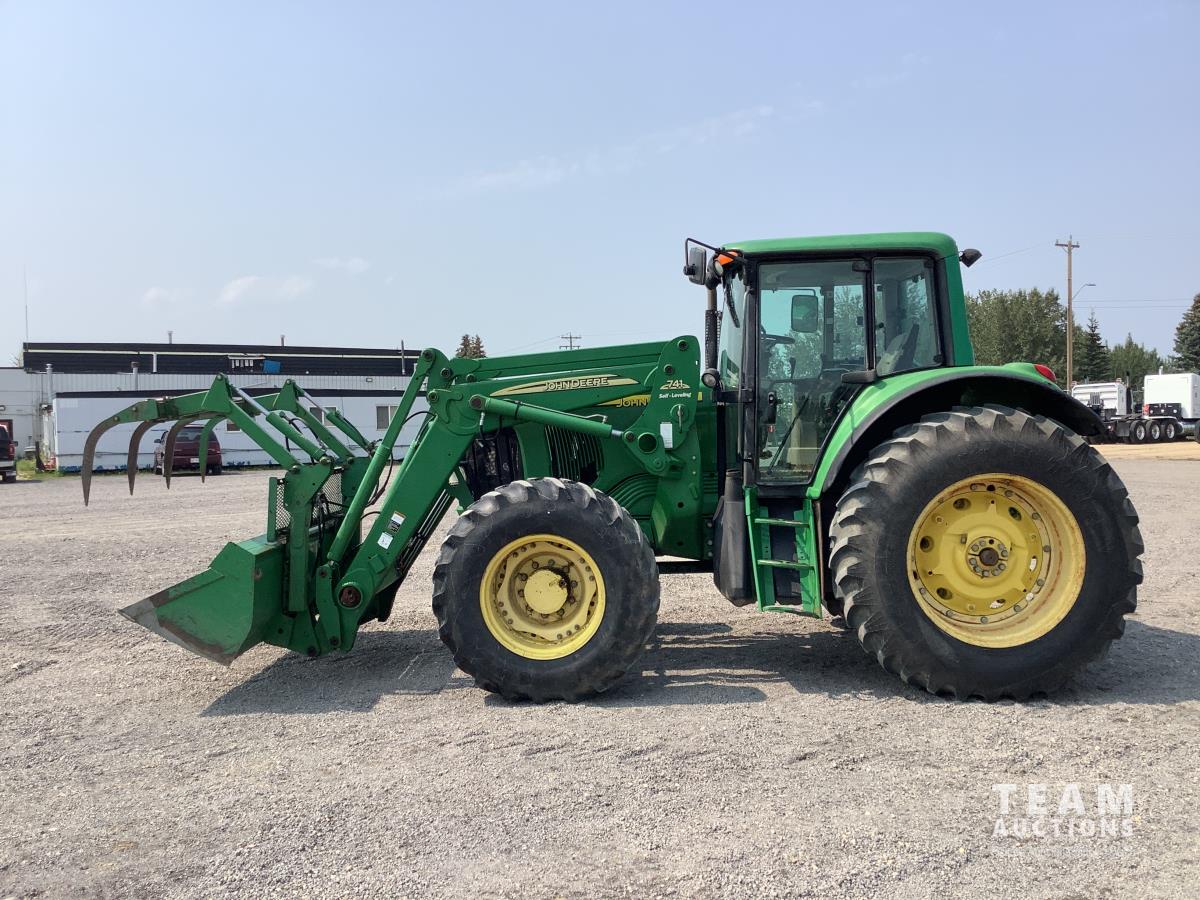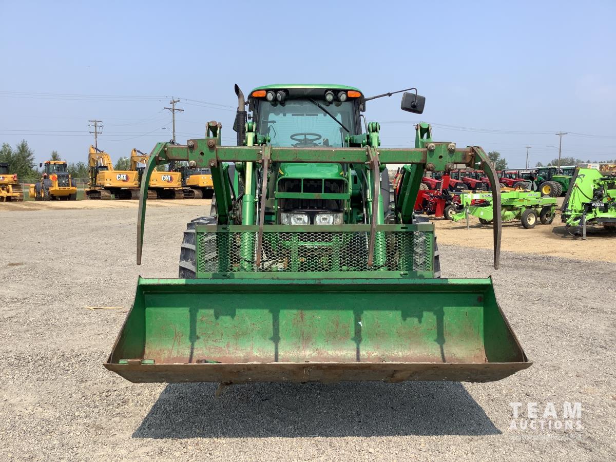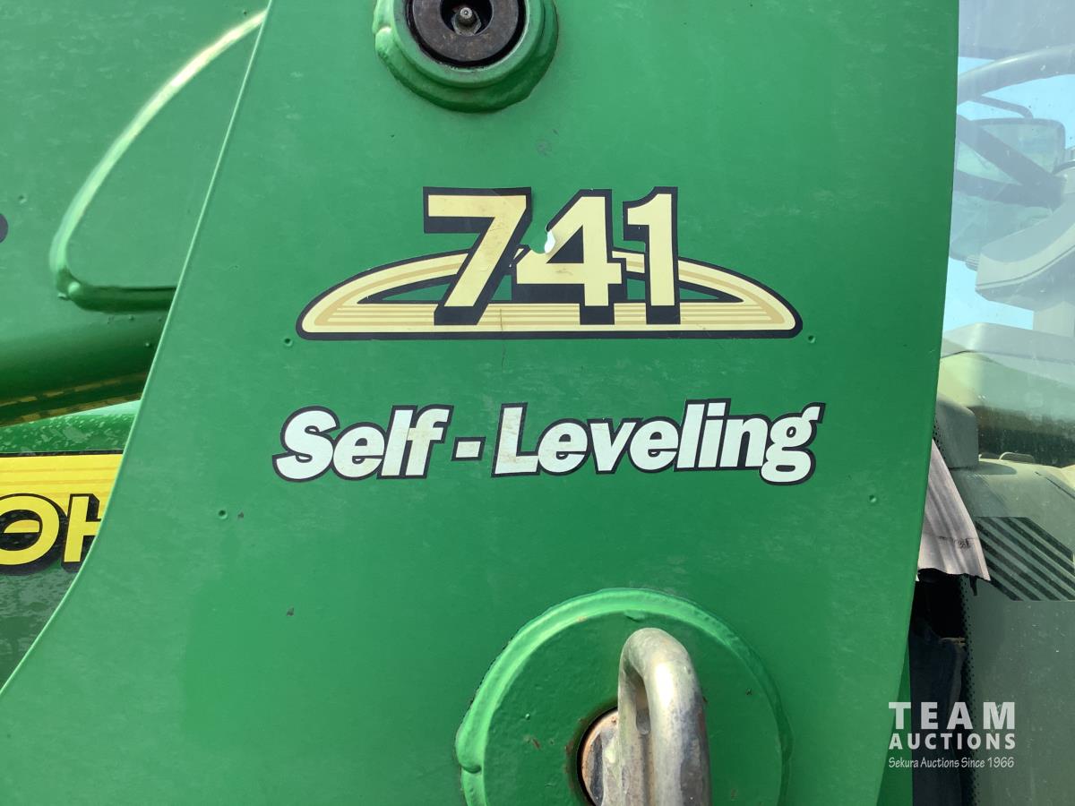 John Deere 741 loader, Q/A, grapple, mid mount hydraulic connection, John Deere 6.8 L 6 cylinder engine, 20 speed Auto Quad partial power shift transmission, cab, left hand reverser, rear differential lock, joystick, A/C, radio, buddy seat, 540/1000 PTO, 3 point hitch, 3 rear hydraulic outlets, rear wheel weights, 16.9-28 front tires, 20.8-38 rear tires