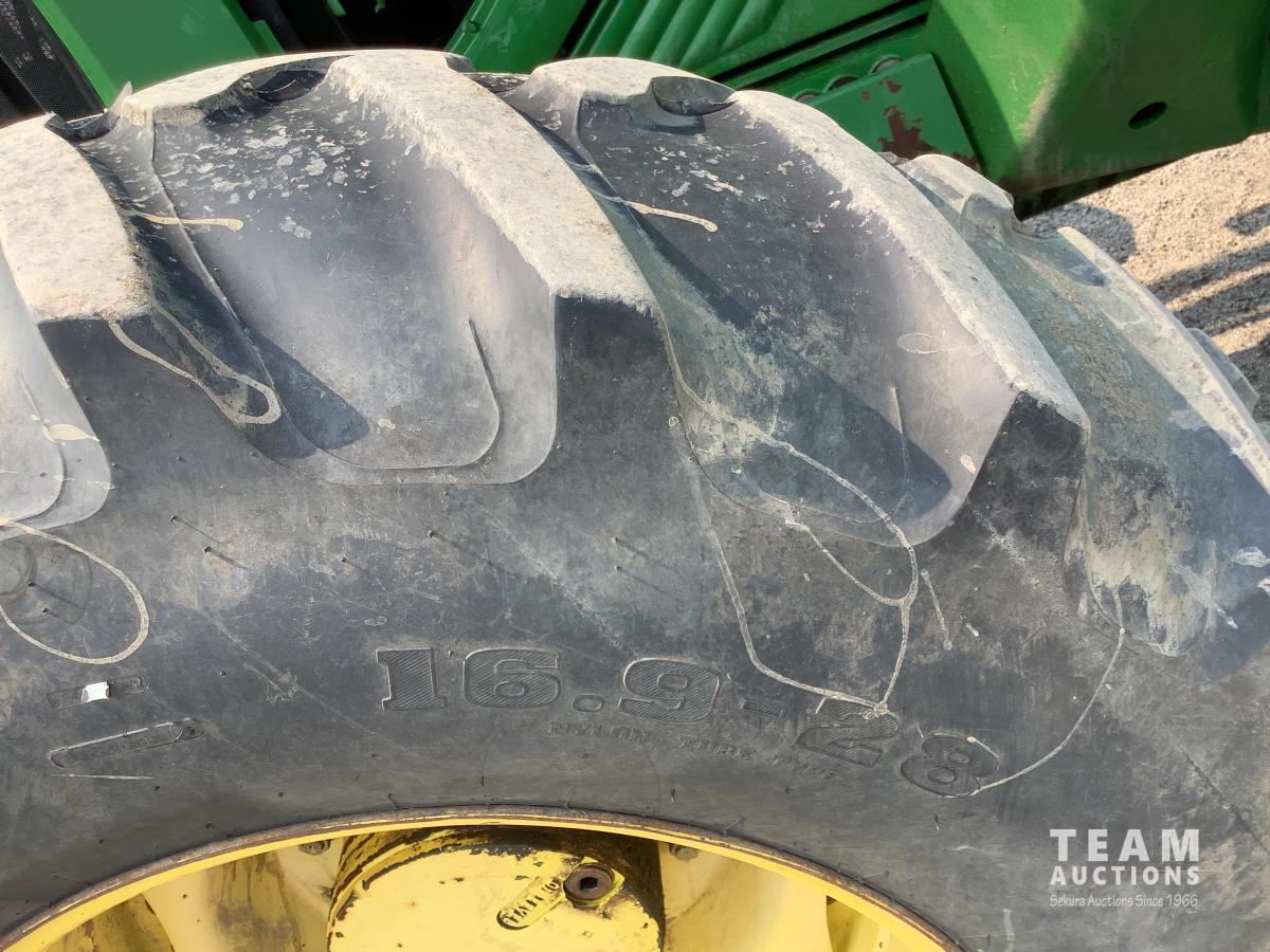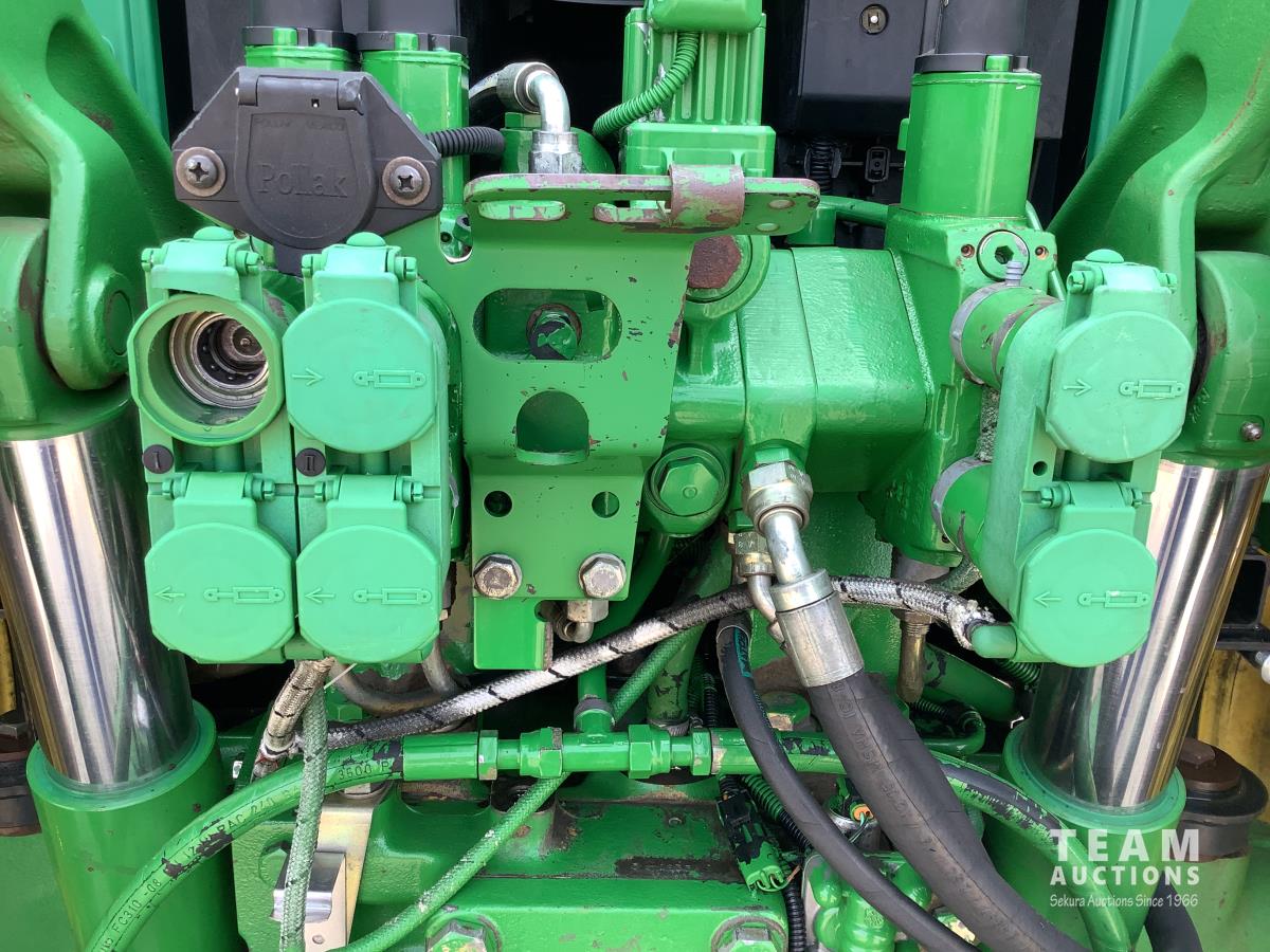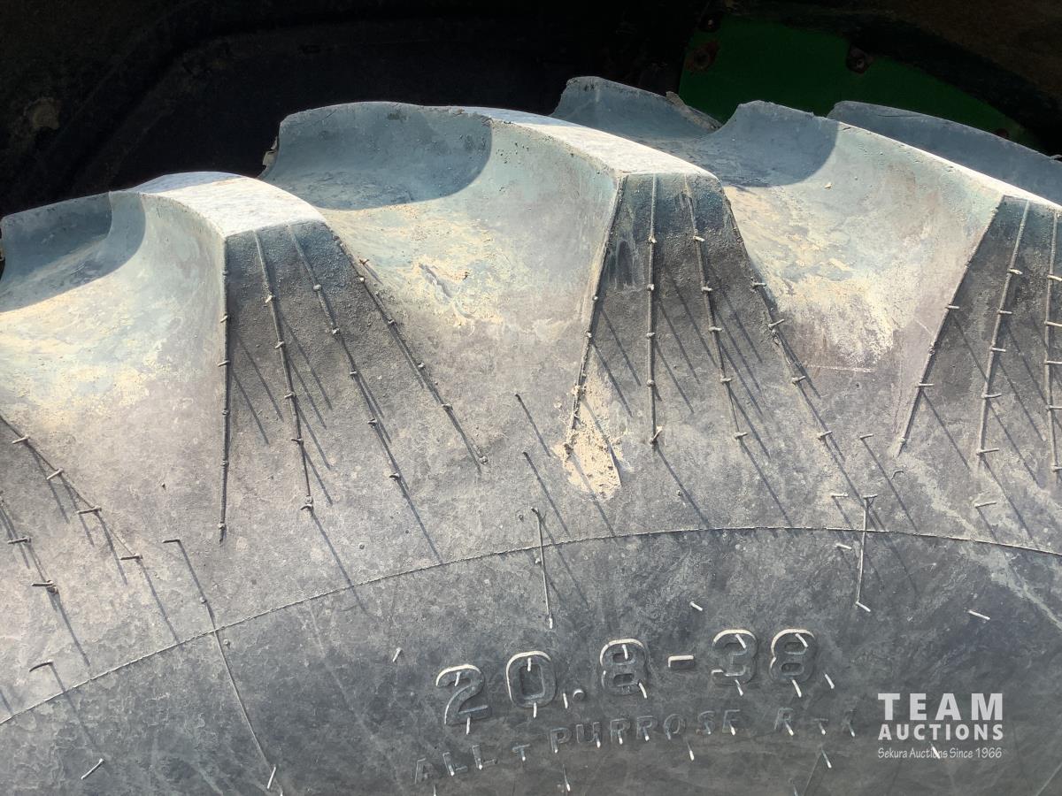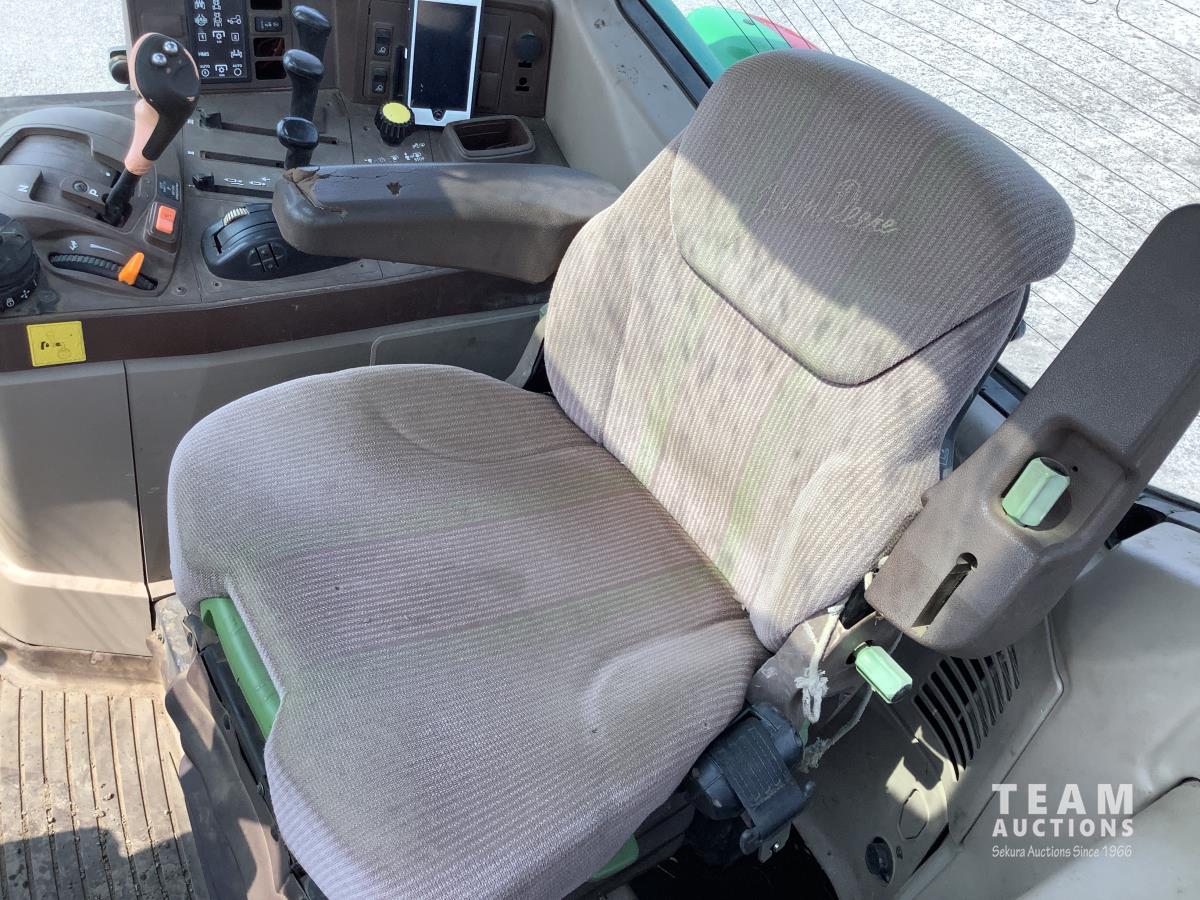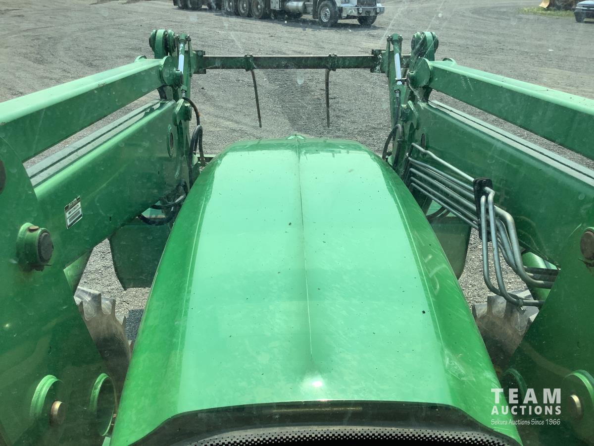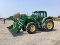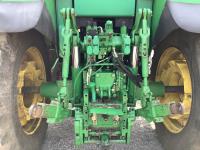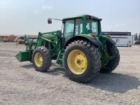 John Deere 741 loader, Q/A, grapple, mid mount hydraulic connection, John Deere 6.8 L 6 cylinder engine, 20 speed Auto Quad partial power shift transmission, cab, left hand reverser, rear differential lock, joystick, A/C, radio, buddy seat, 540/1000 PTO, 3 point hitch, 3 rear hydraulic outlets, rear wheel weights, 16.9-28 front tires, 20.8-38 rear tires