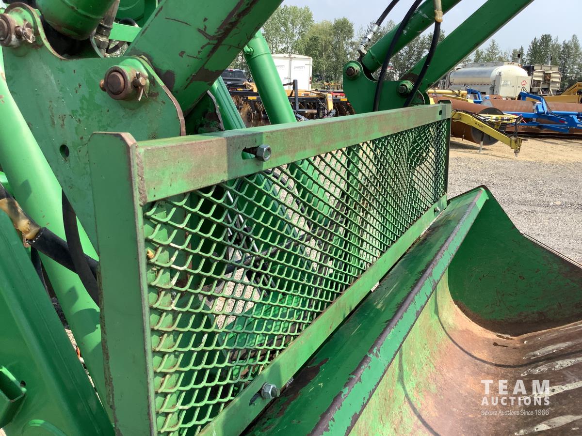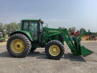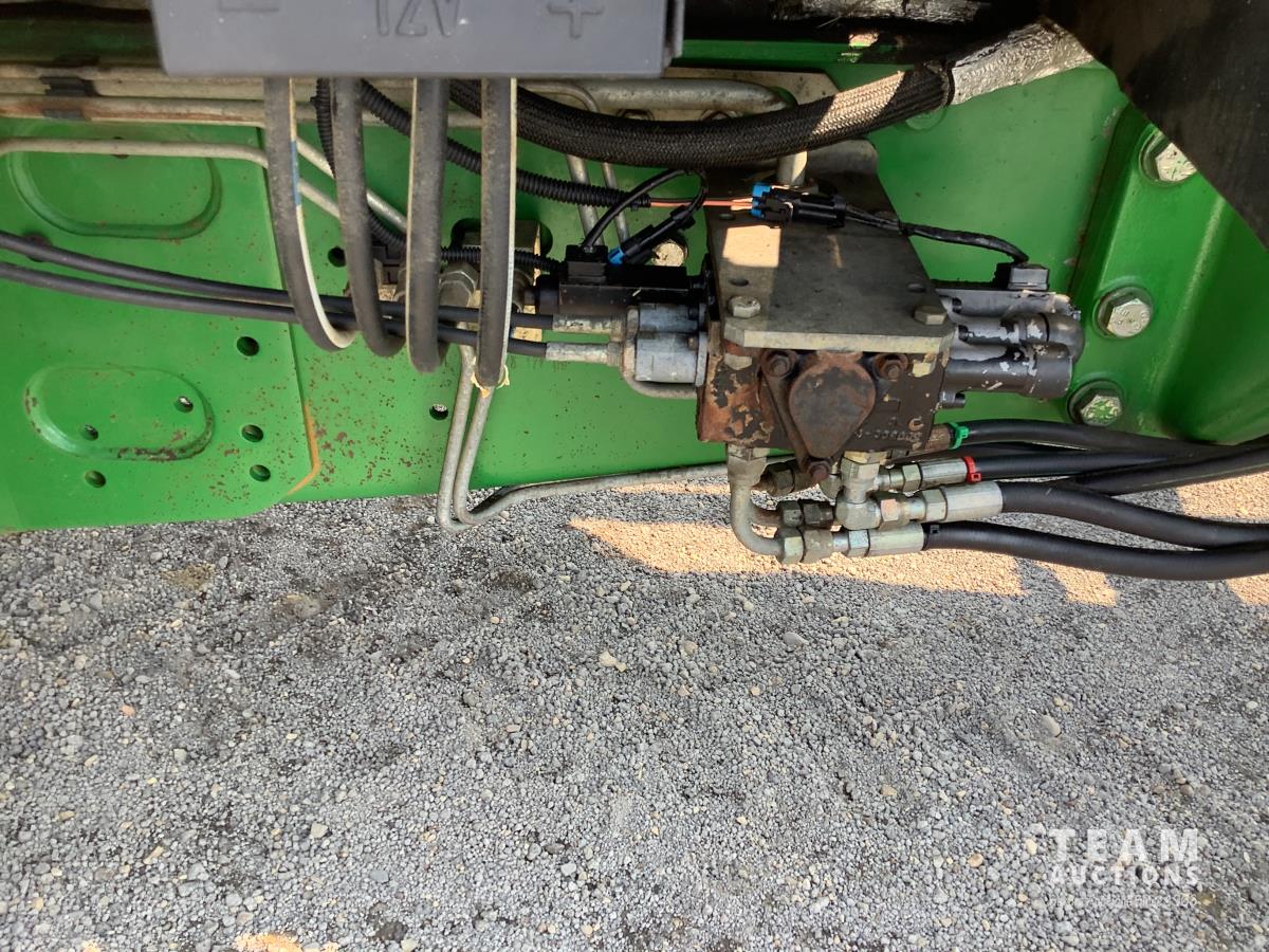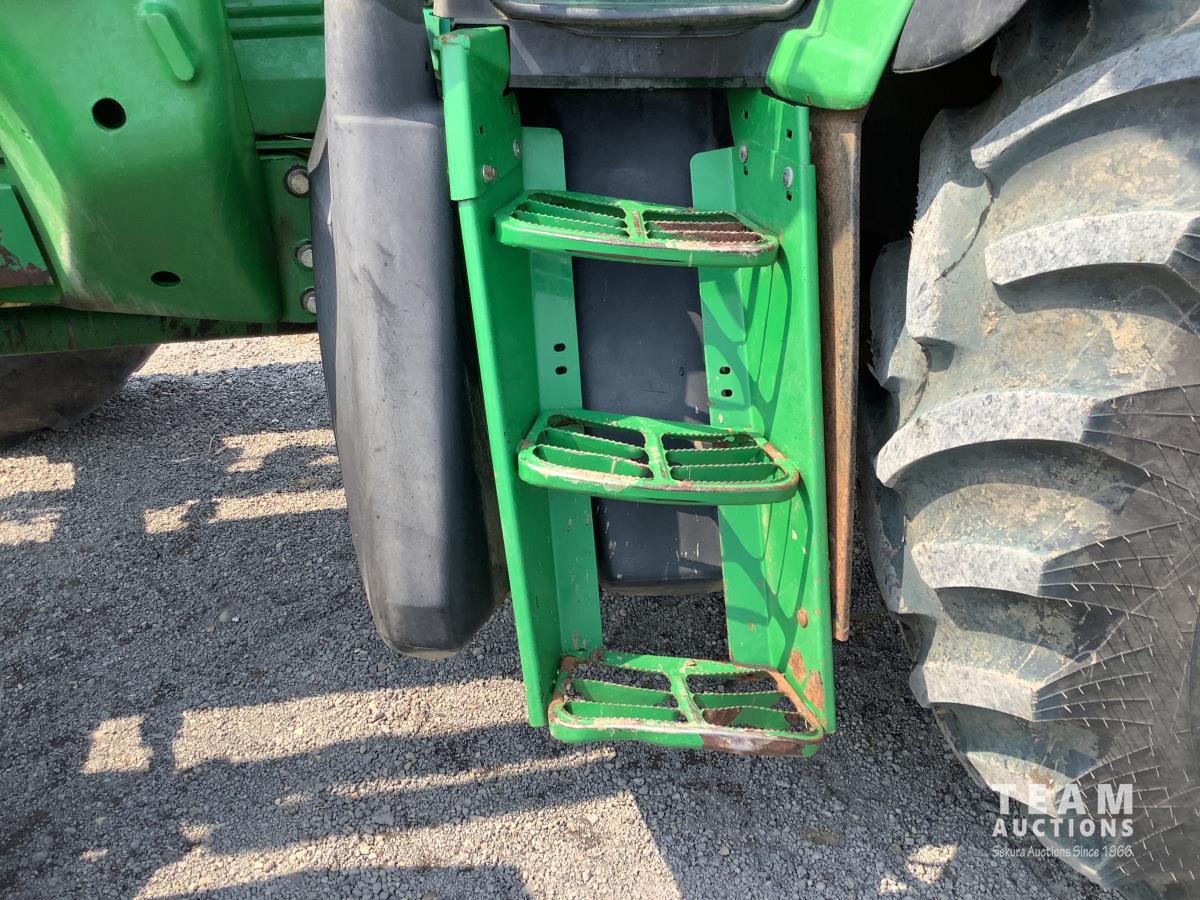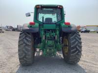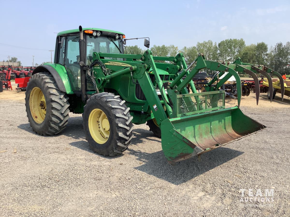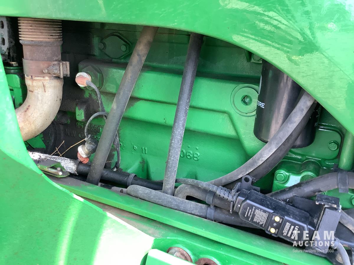 John Deere 741 loader, Q/A, grapple, mid mount hydraulic connection, John Deere 6.8 L 6 cylinder engine, 20 speed Auto Quad partial power shift transmission, cab, left hand reverser, rear differential lock, joystick, A/C, radio, buddy seat, 540/1000 PTO, 3 point hitch, 3 rear hydraulic outlets, rear wheel weights, 16.9-28 front tires, 20.8-38 rear tires