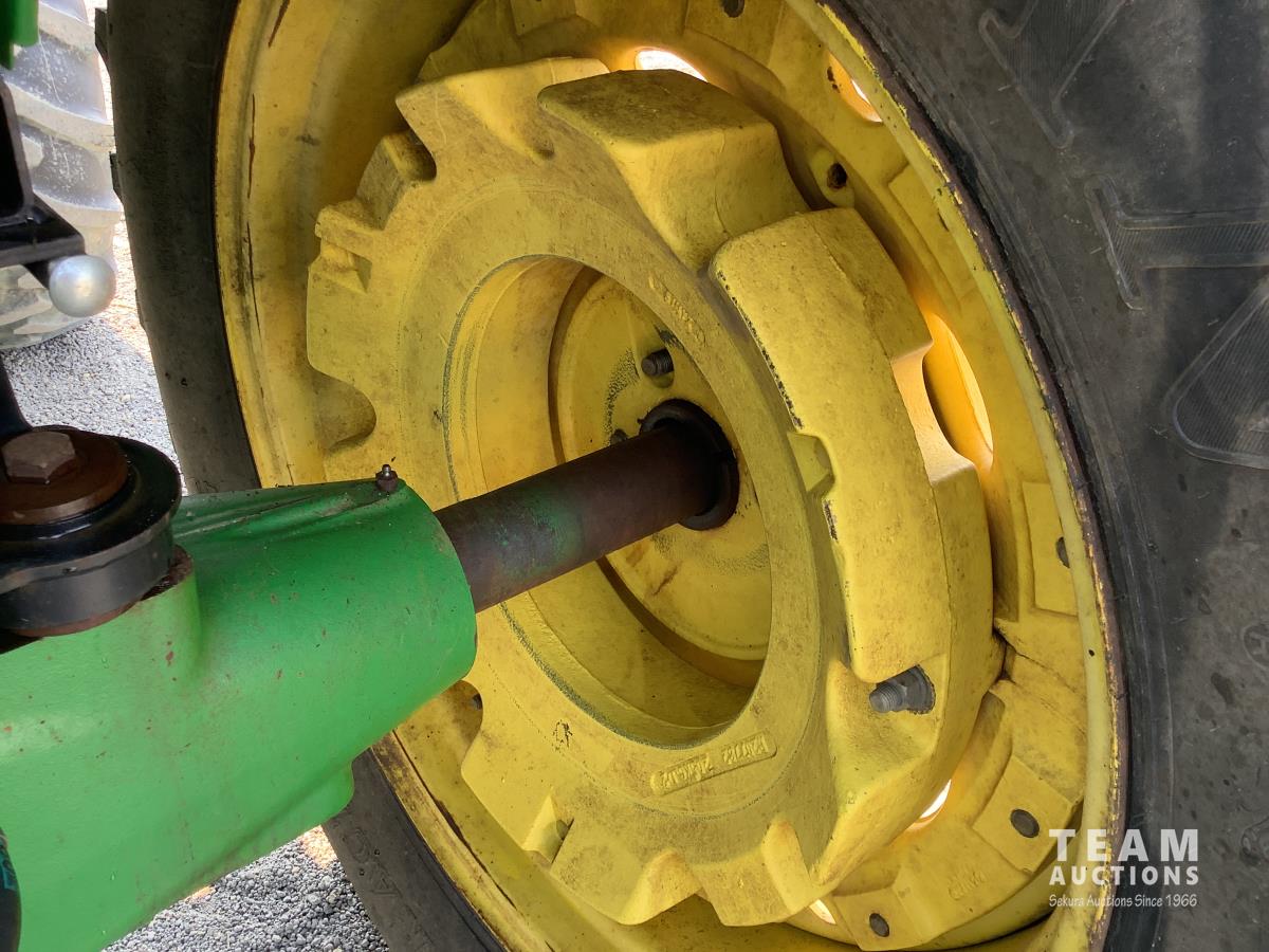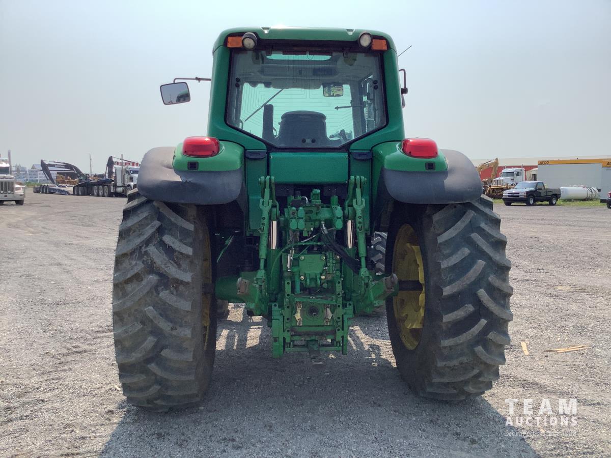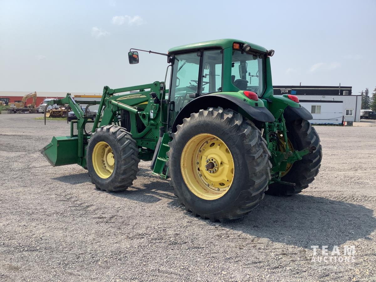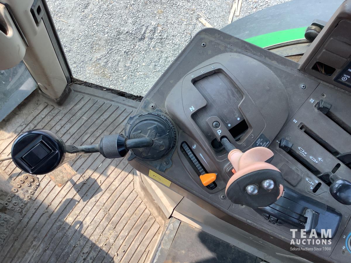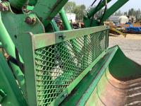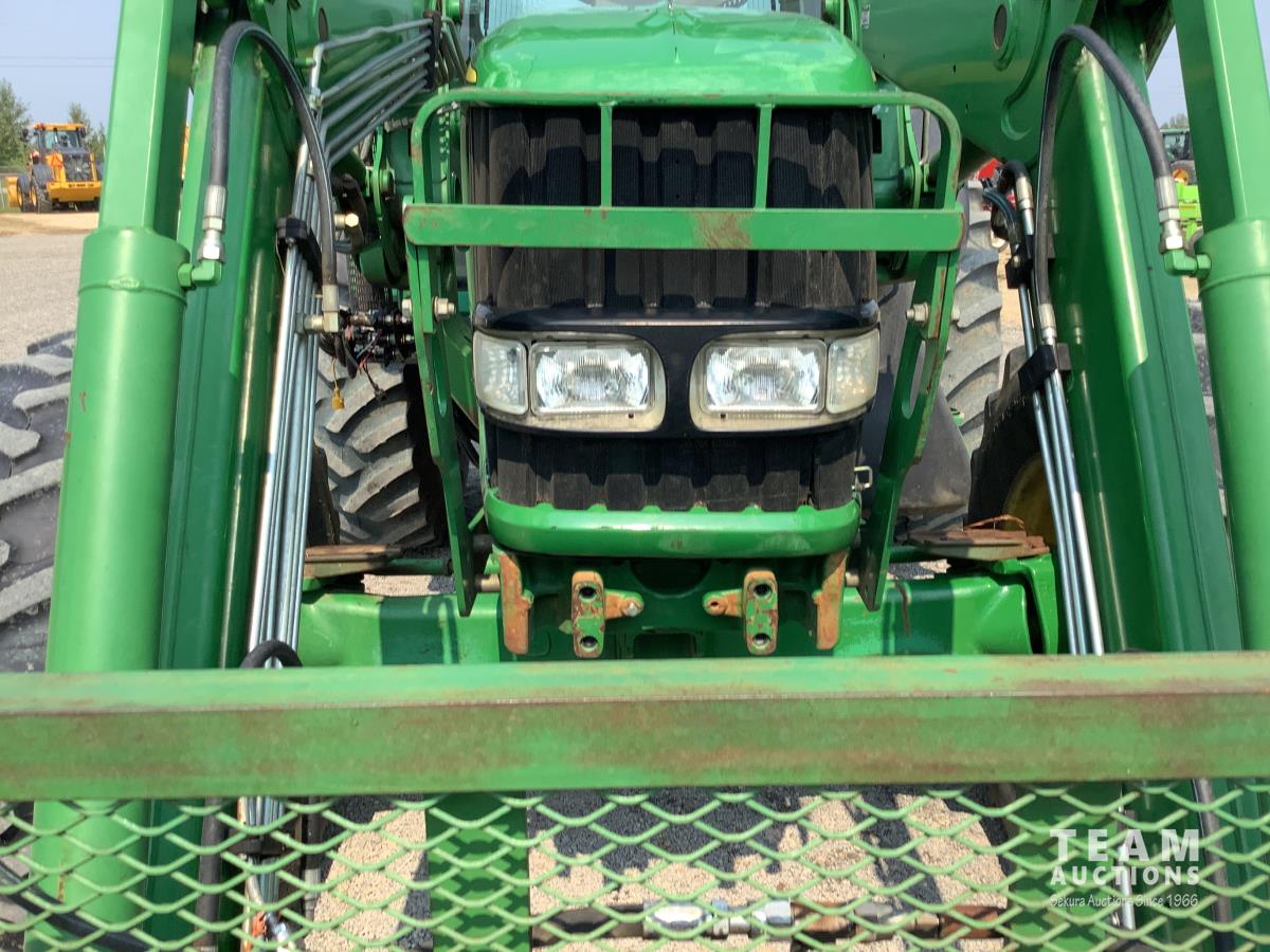John Deere 741 loader, Q/A, grapple, mid mount hydraulic connection, John Deere 6.8 L 6 cylinder engine, 20 speed Auto Quad partial power shift transmission, cab, left hand reverser, rear differential lock, joystick, A/C, radio, buddy seat, 540/1000 PTO, 3 point hitch, 3 rear hydraulic outlets, rear wheel weights, 16.9-28 front tires, 20.8-38 rear tires