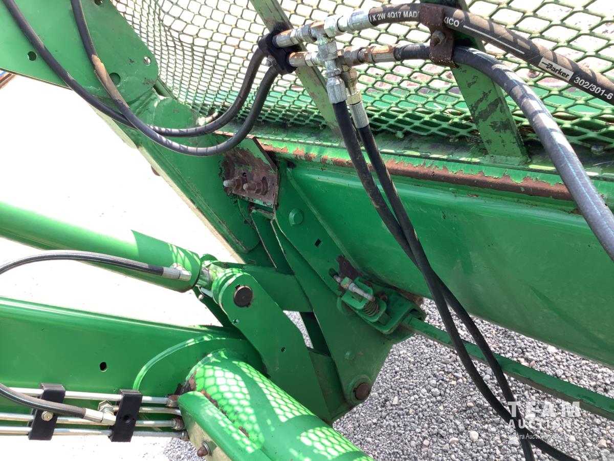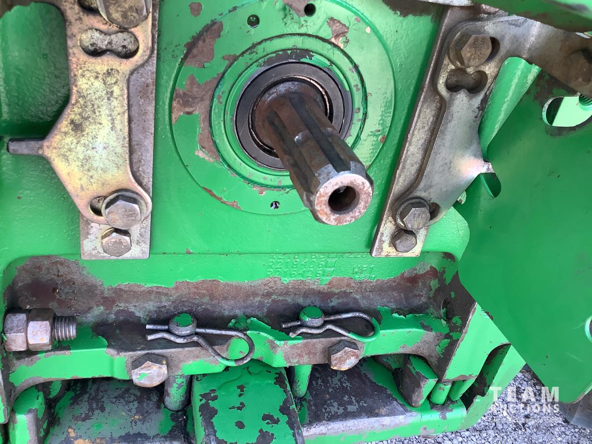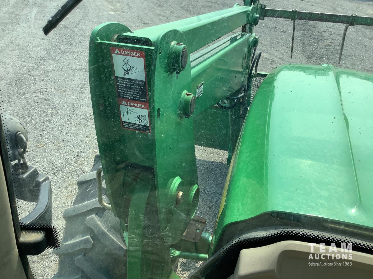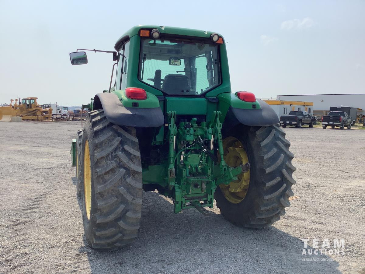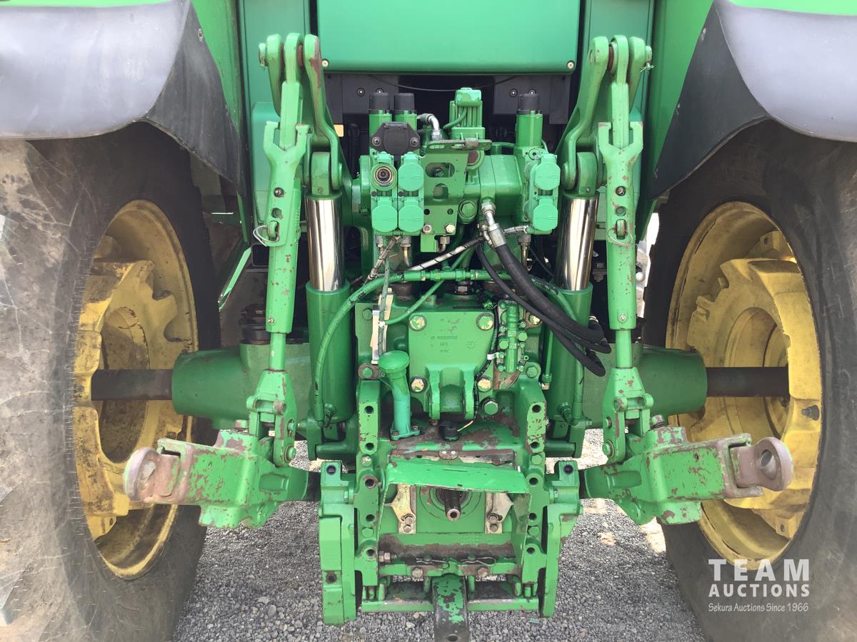 John Deere 741 loader, Q/A, grapple, mid mount hydraulic connection, John Deere 6.8 L 6 cylinder engine, 20 speed Auto Quad partial power shift transmission, cab, left hand reverser, rear differential lock, joystick, A/C, radio, buddy seat, 540/1000 PTO, 3 point hitch, 3 rear hydraulic outlets, rear wheel weights, 16.9-28 front tires, 20.8-38 rear tires