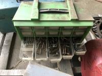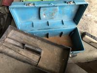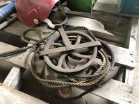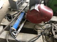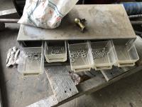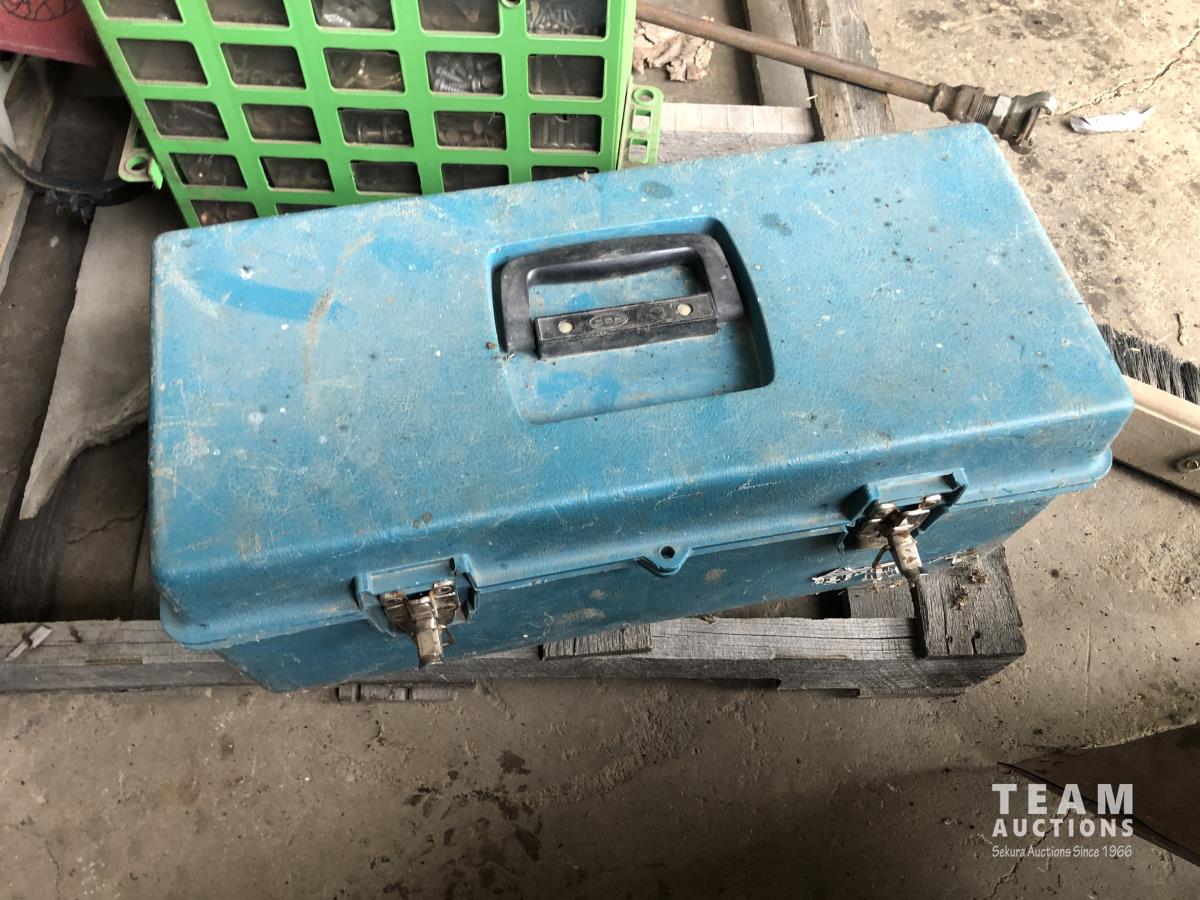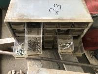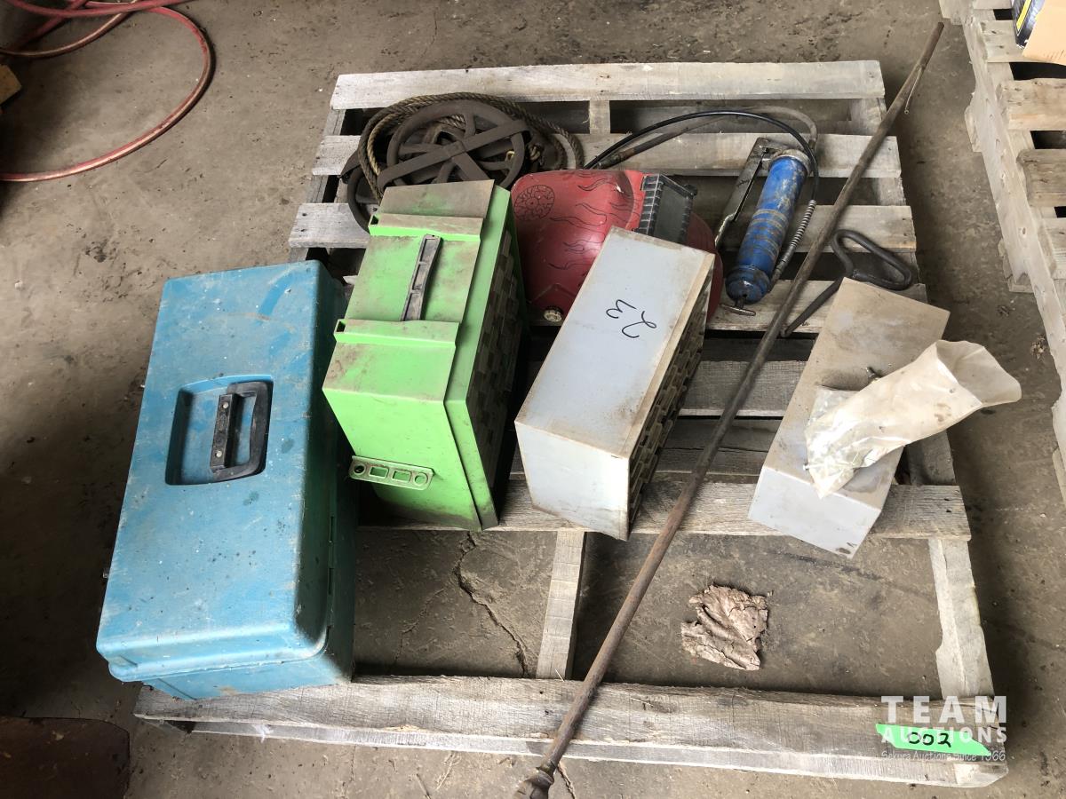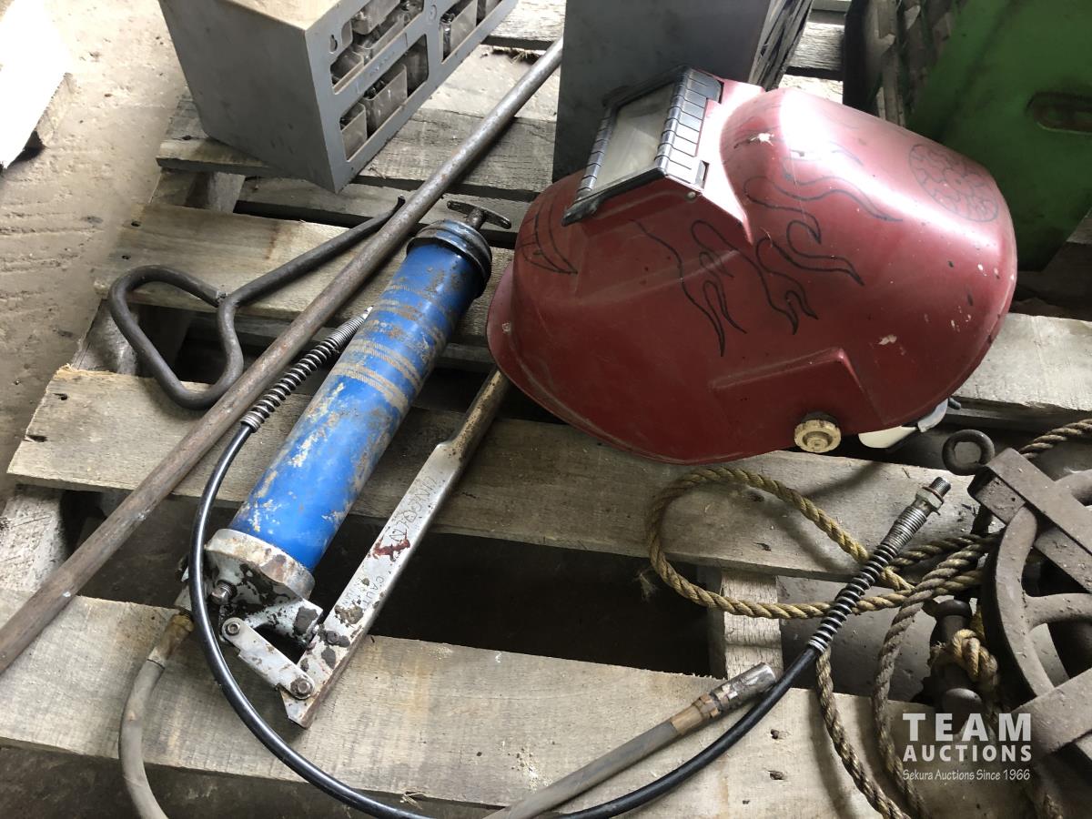 Vintage pulley, grease gun, (3) small bolt cabinets with miscellaneous hardware, welding helmet, poly tool box