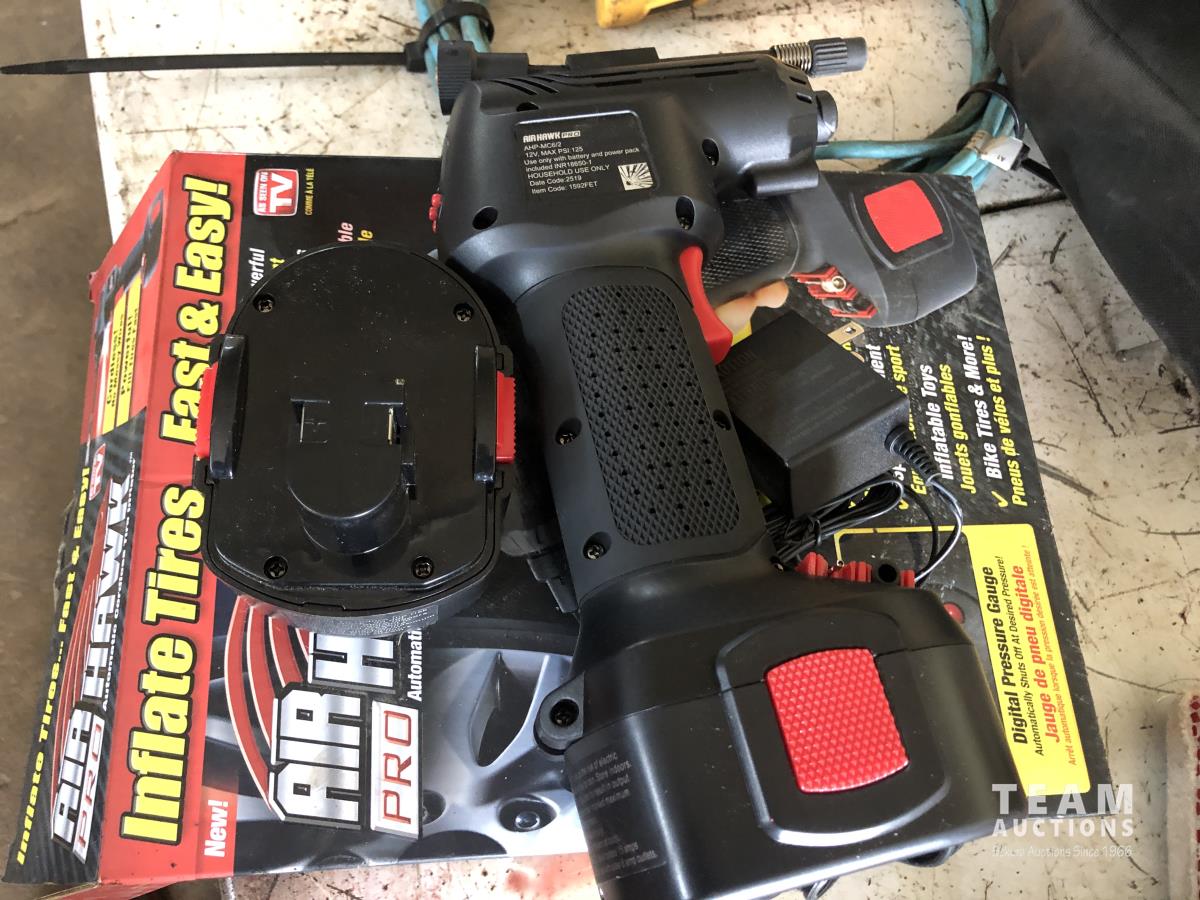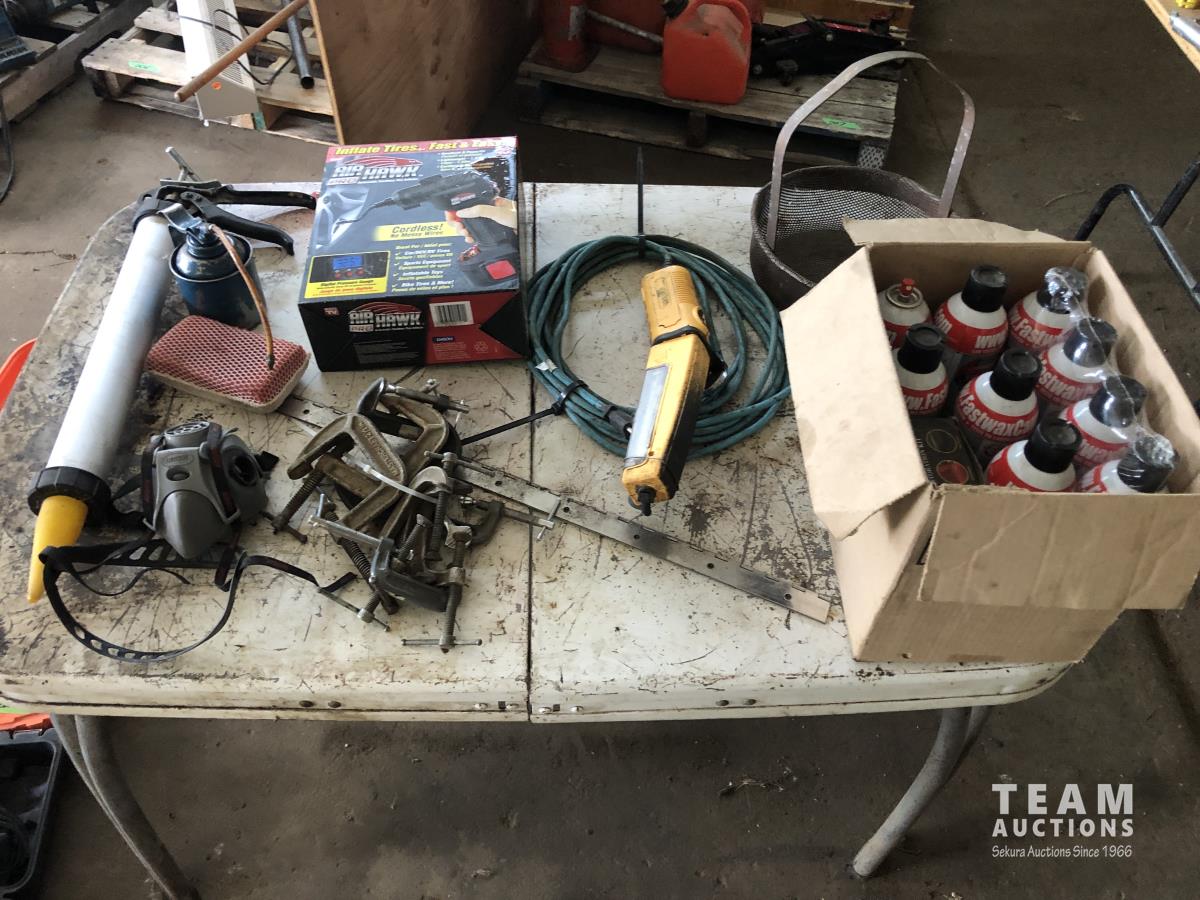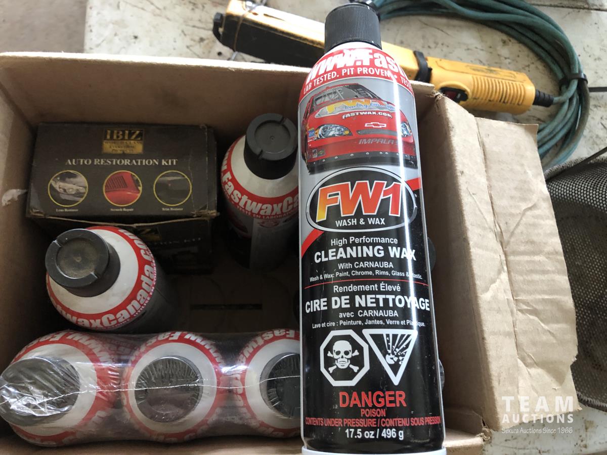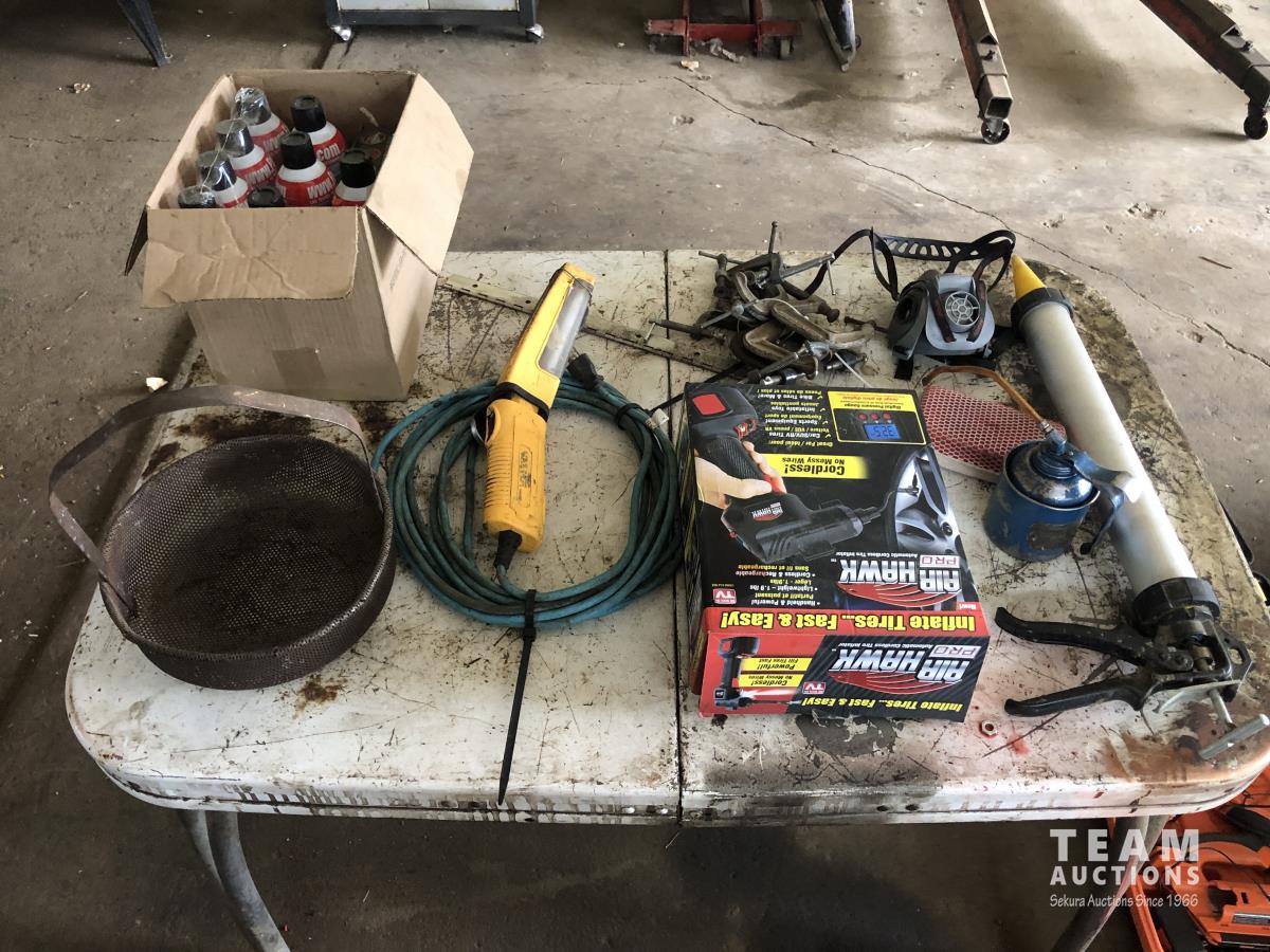 (9) cans of cleaning wax and auto restore, inspection lamp, (8) metal clamps, Air Hawk cordless tire inflator, miscellaneous hardware