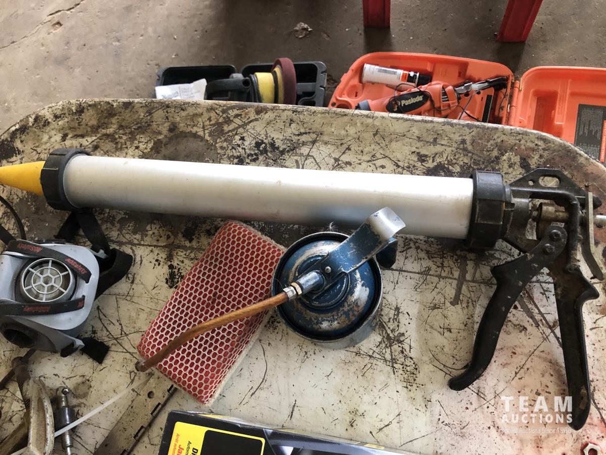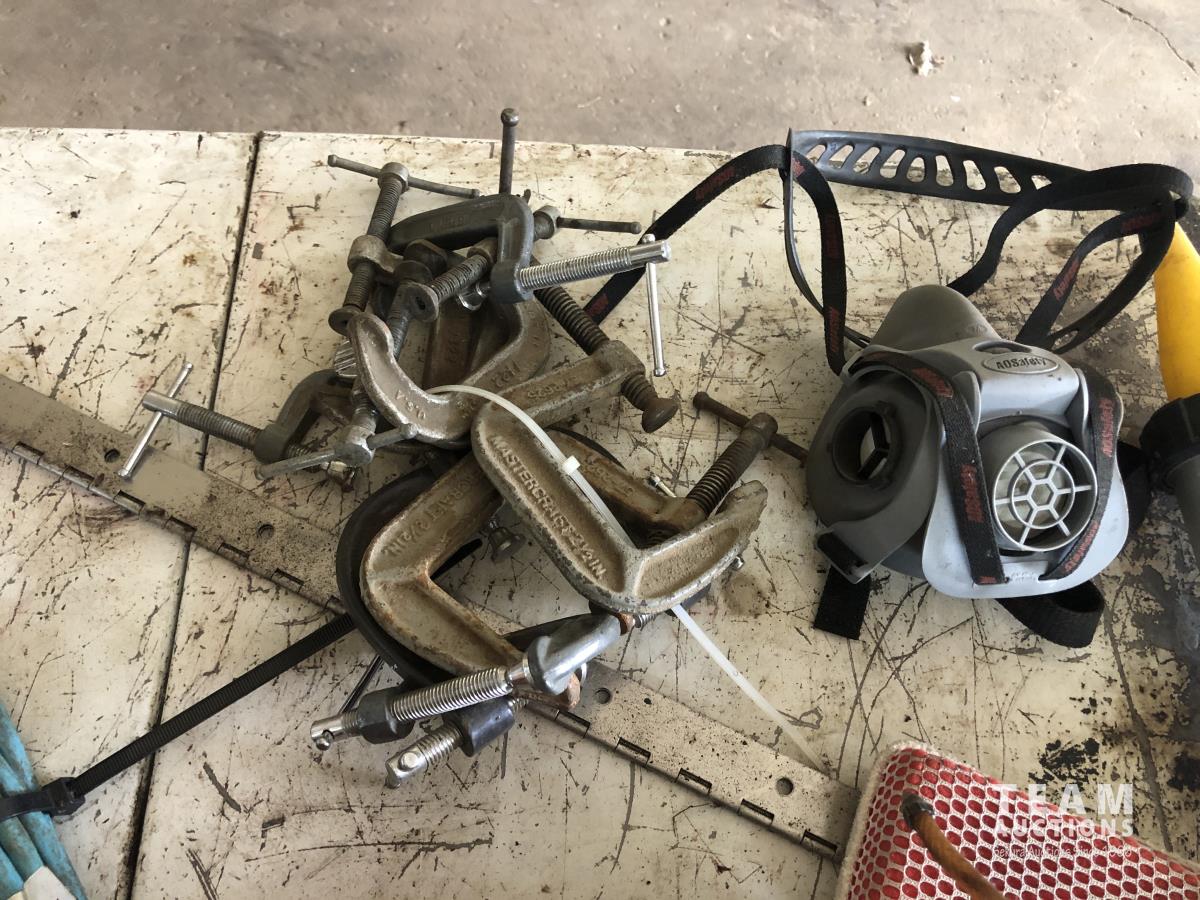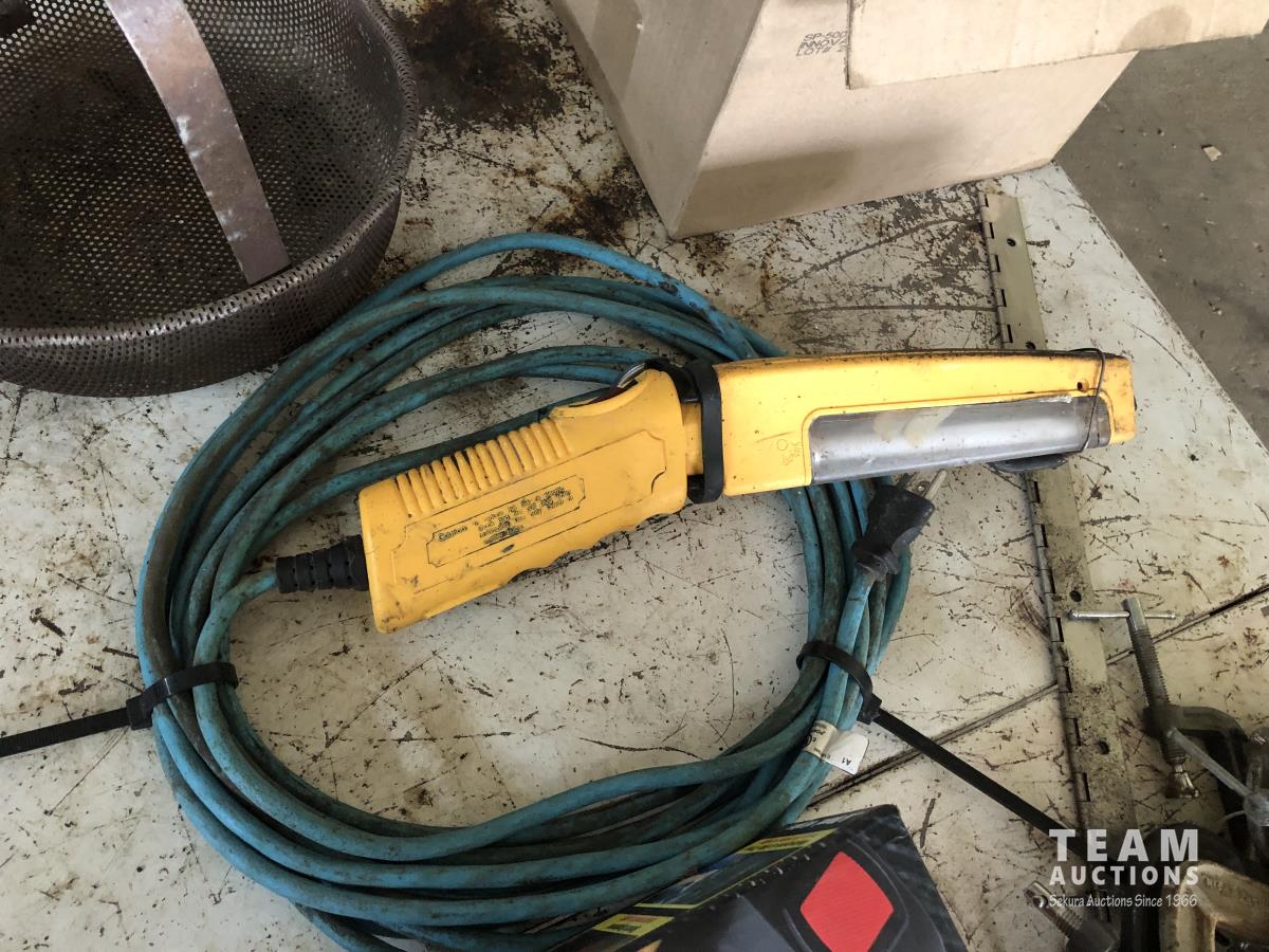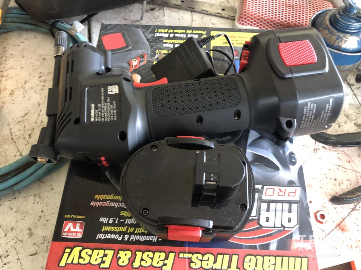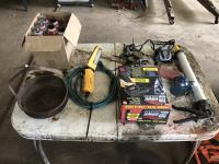 (9) cans of cleaning wax and auto restore, inspection lamp, (8) metal clamps, Air Hawk cordless tire inflator, miscellaneous hardware
