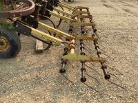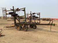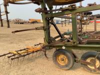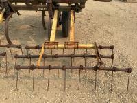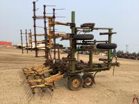 12 inch spacing, 2 inch reversible spikes, Degelman 3 bar mounted harrows, hydraulic lift cylinder, walking axles on main frame and wings. 7.60-15 tires