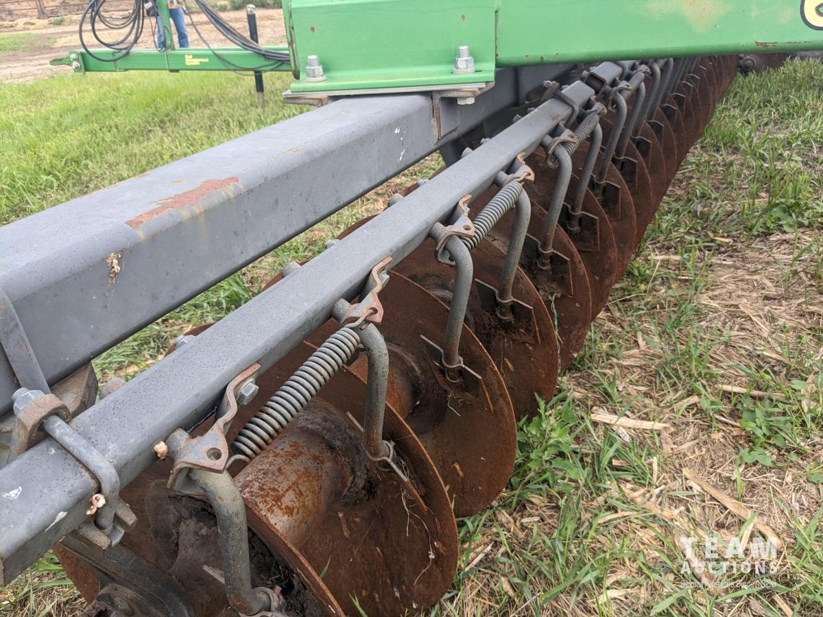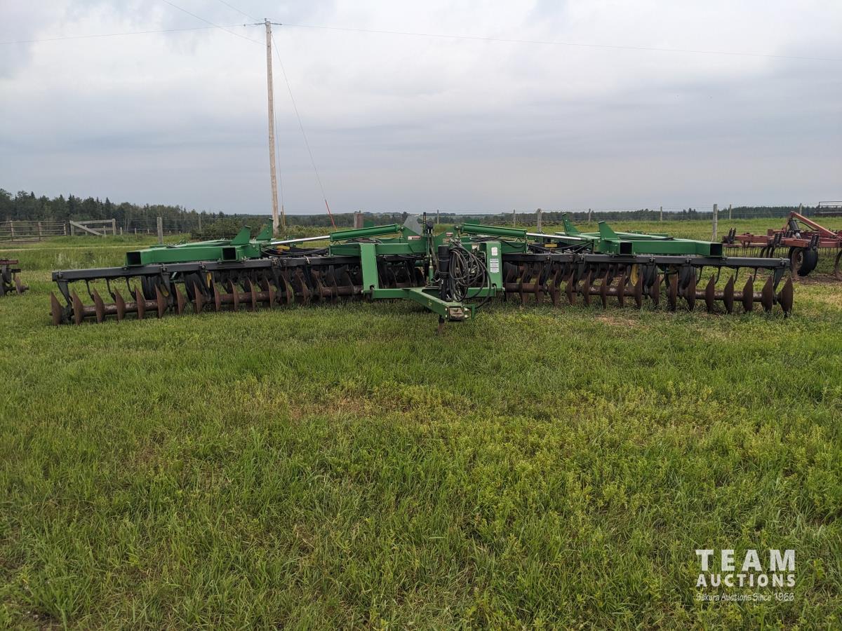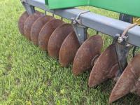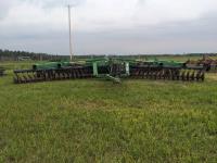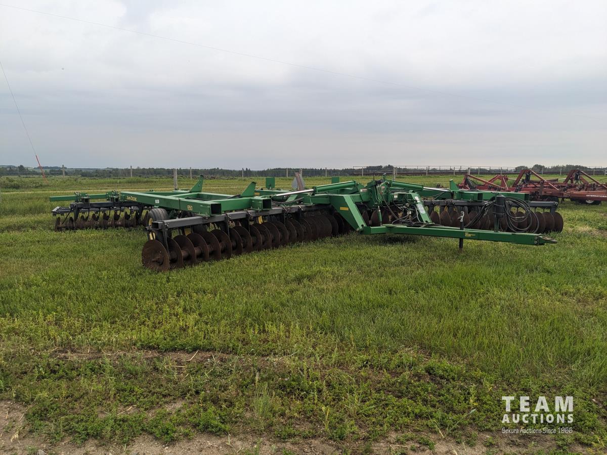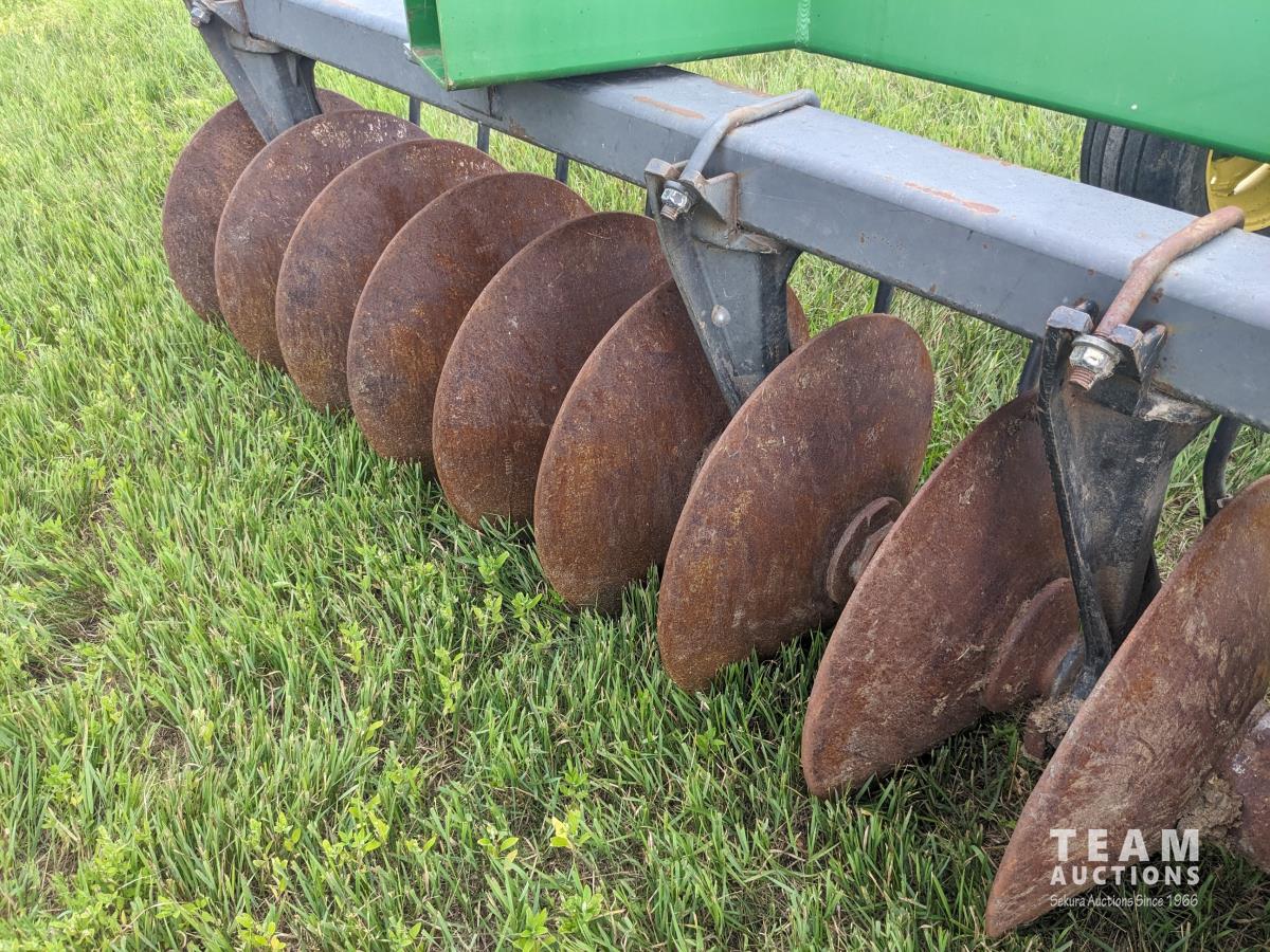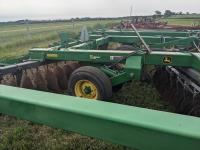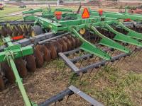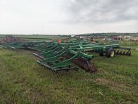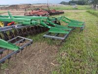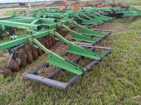 9 inch spacing, 22 ft discs front & rear, spring loaded scrapers, hydraulic leveling, 3 bar mounted harrows, 11L-15 duals on main frame and wings