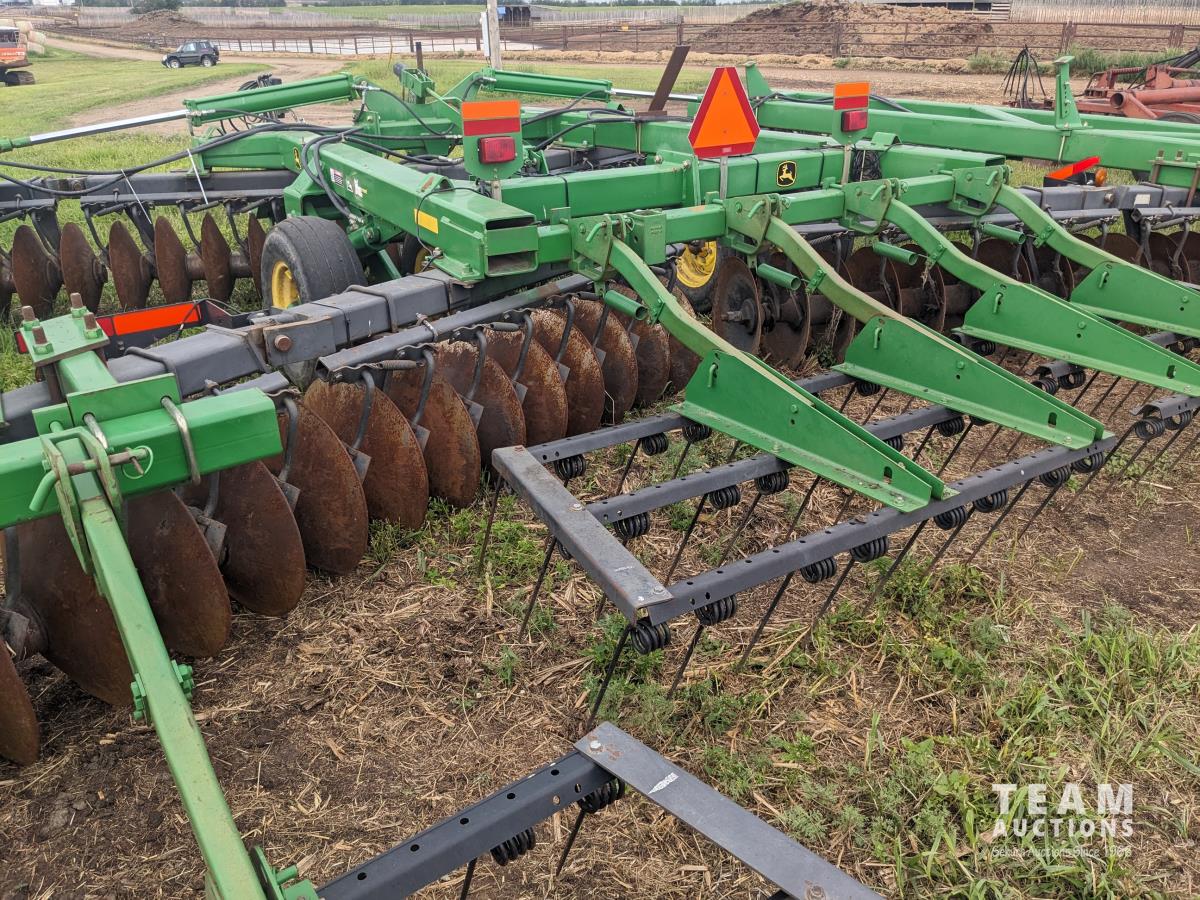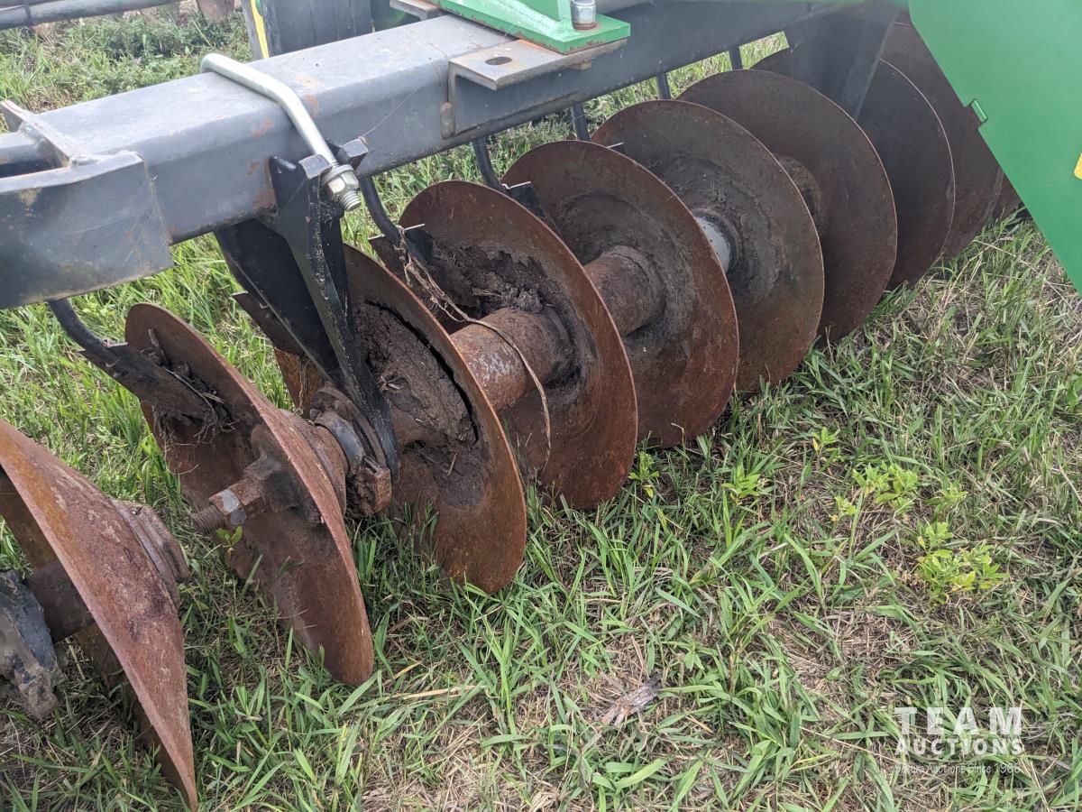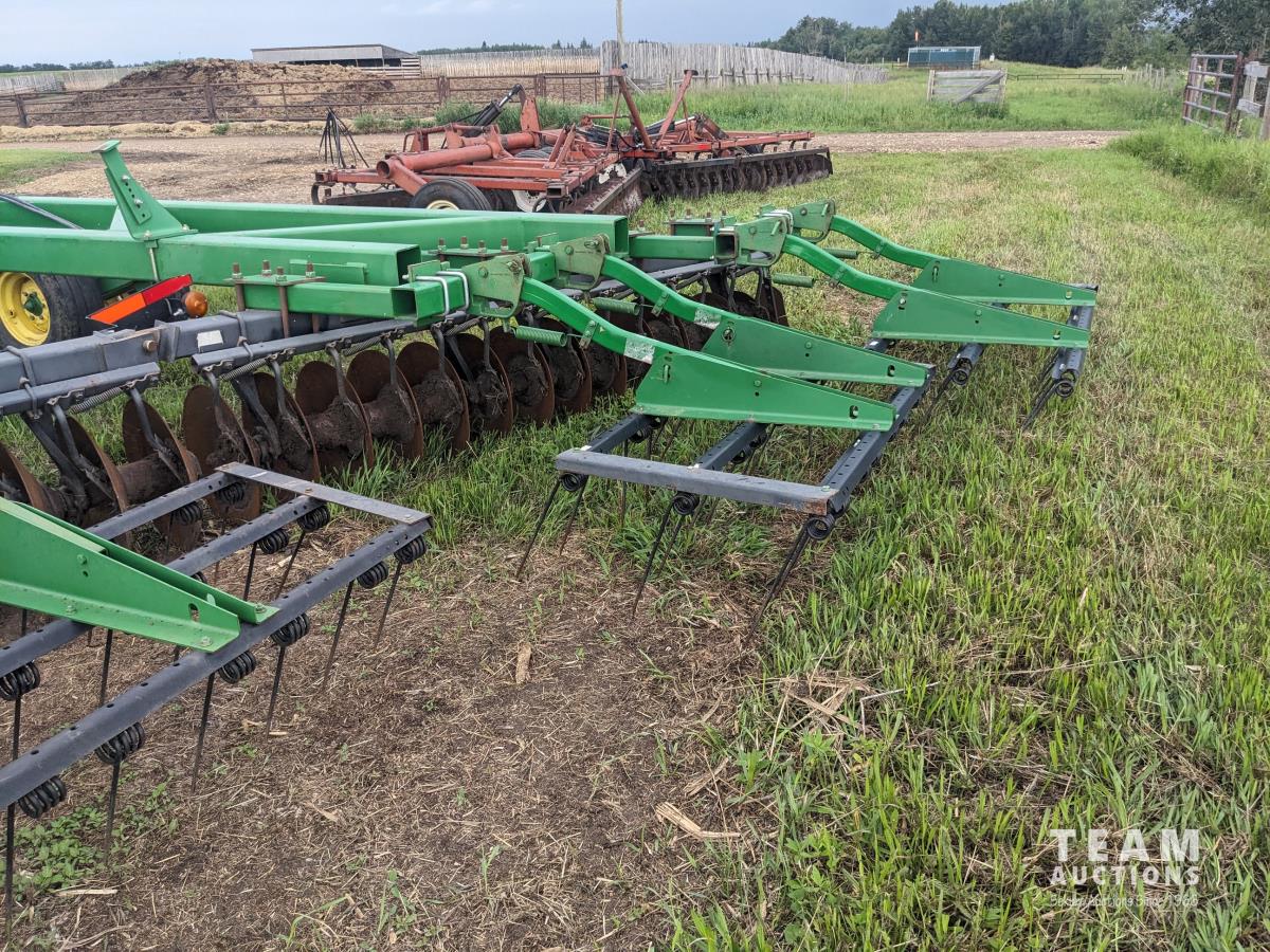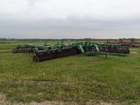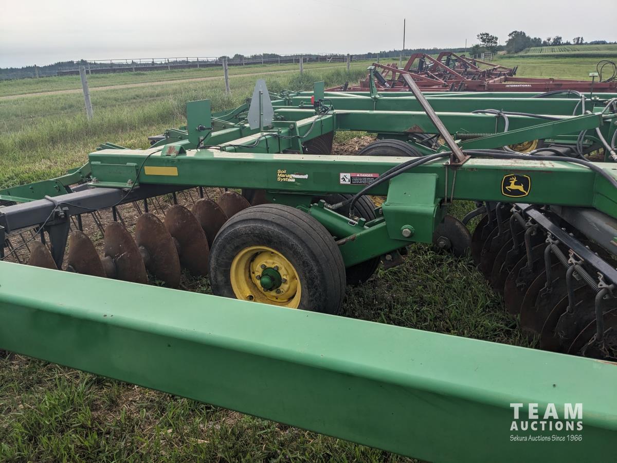 9 inch spacing, 22 ft discs front & rear, spring loaded scrapers, hydraulic leveling, 3 bar mounted harrows, 11L-15 duals on main frame and wings