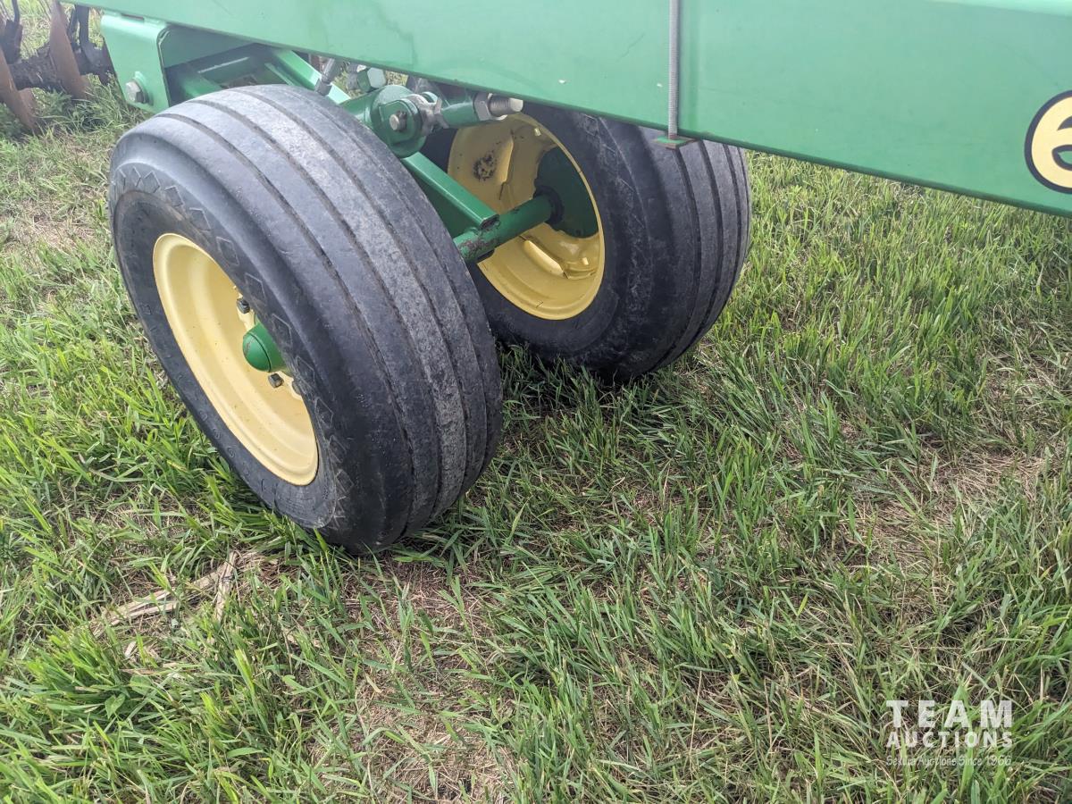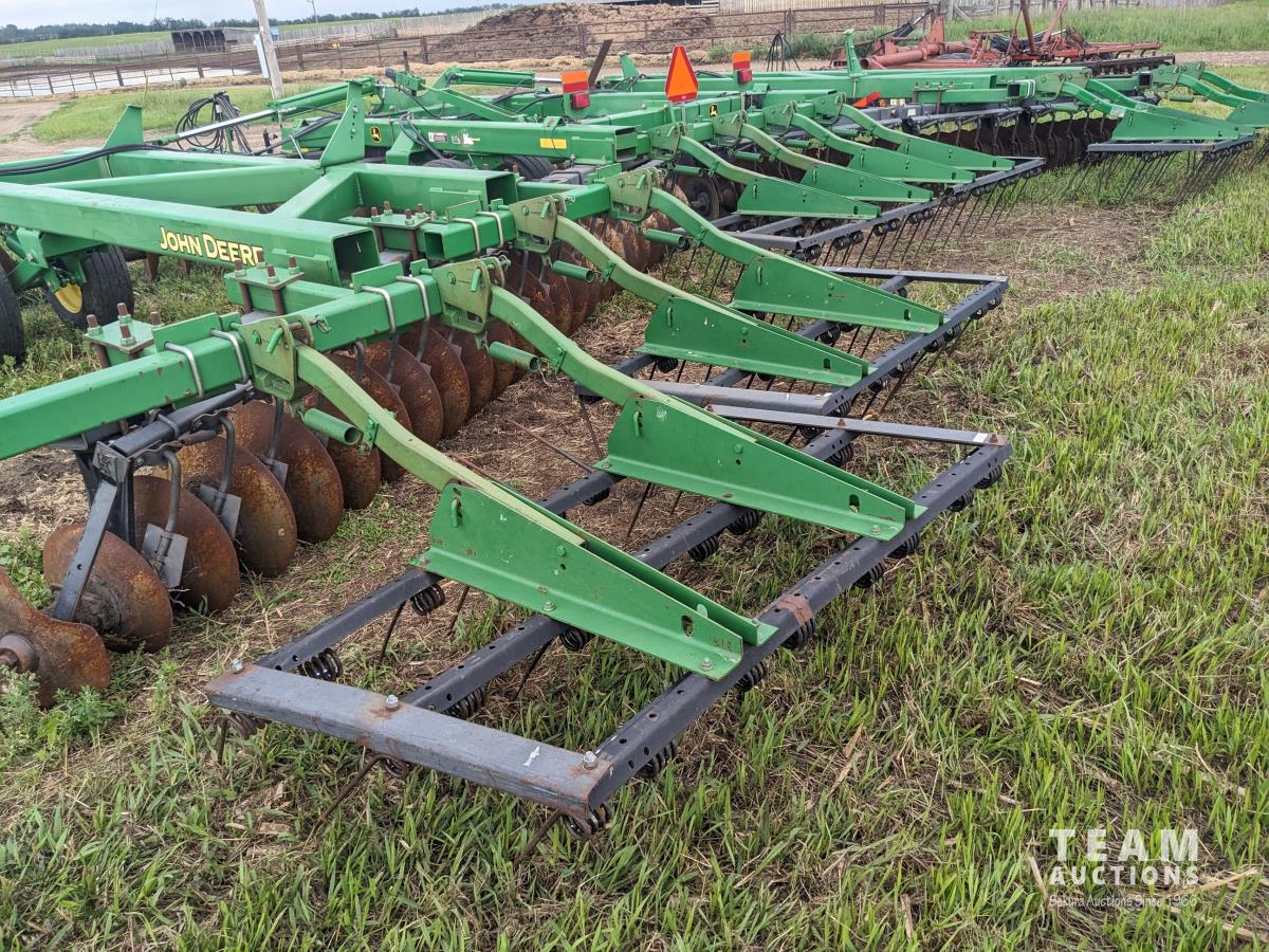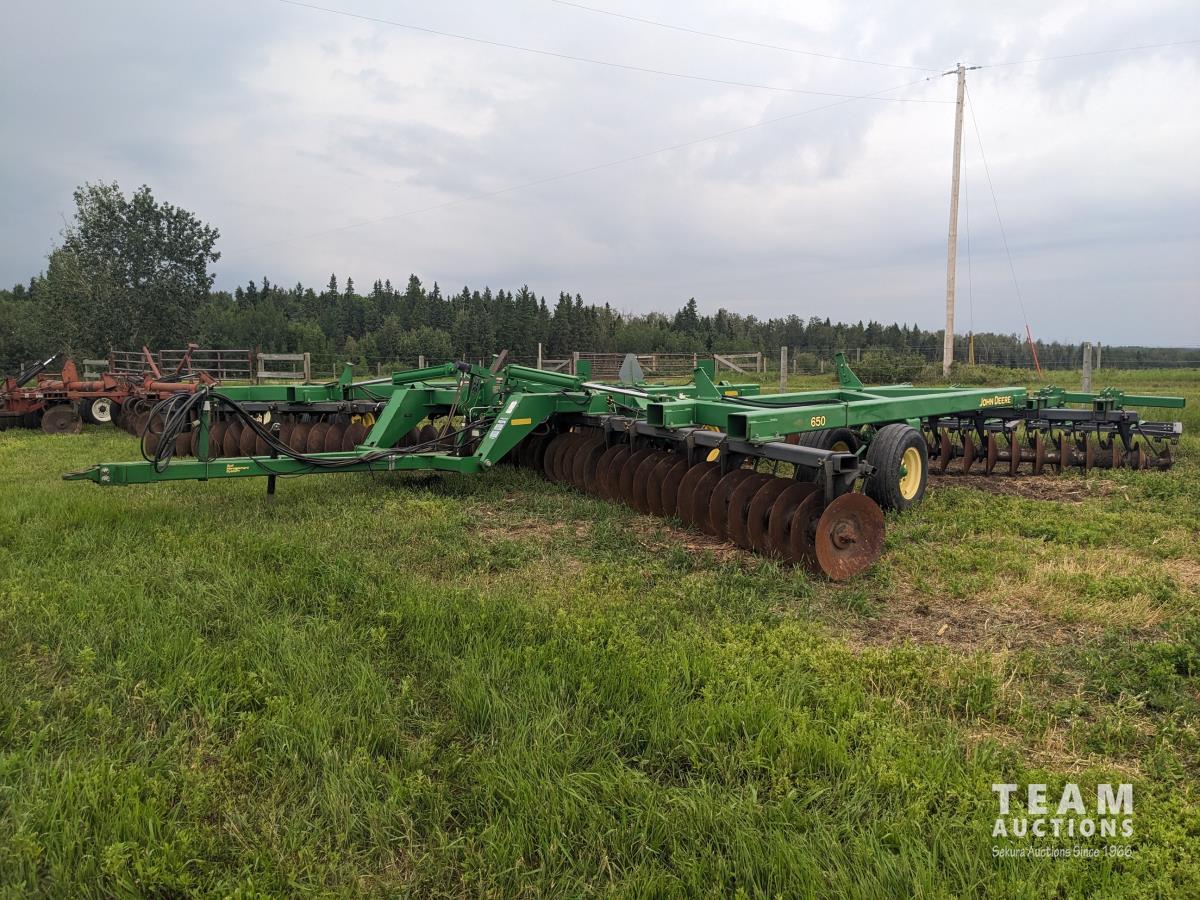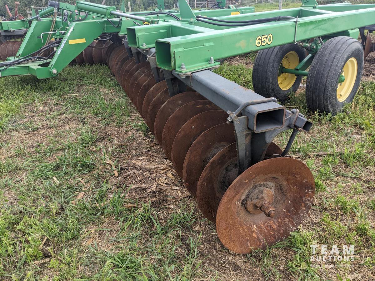 9 inch spacing, 22 ft discs front & rear, spring loaded scrapers, hydraulic leveling, 3 bar mounted harrows, 11L-15 duals on main frame and wings