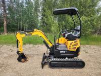 Open station, pilot controls, Briggs & Stratton gas engine, LED work lights, 14 inch Dig bucket, manual coupler, 1 auxiliary hydraulics, 2 Ft 7 inch stick, swing boom, backfill blade, thumb mount, 7 inch rubber tracks