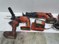 (1) impact driver, (1) reciprocating saw, (1) drill, (3) batteries, (1) charger, (1) carrying bag
