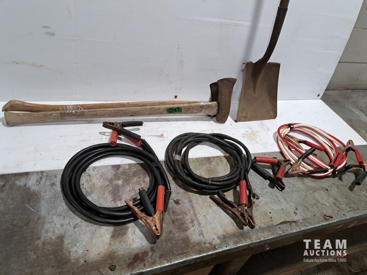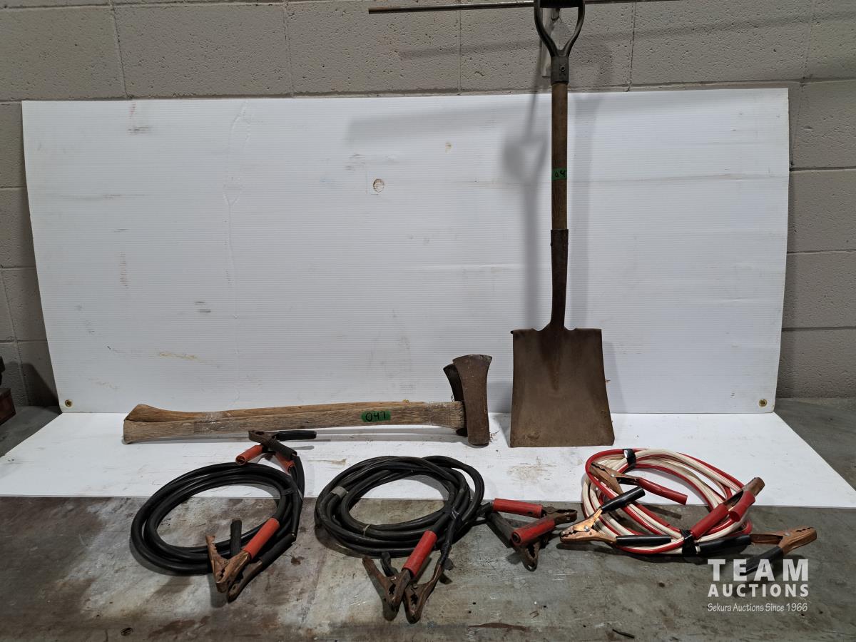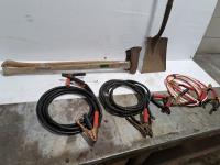 56 (3) Sets Booster Cables, (1) Shovel, (2) Axes