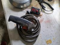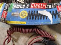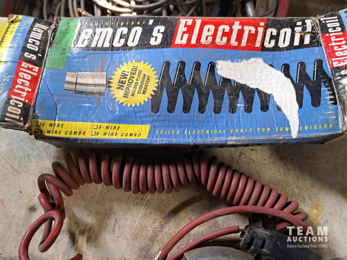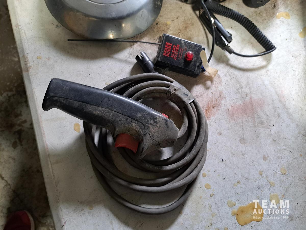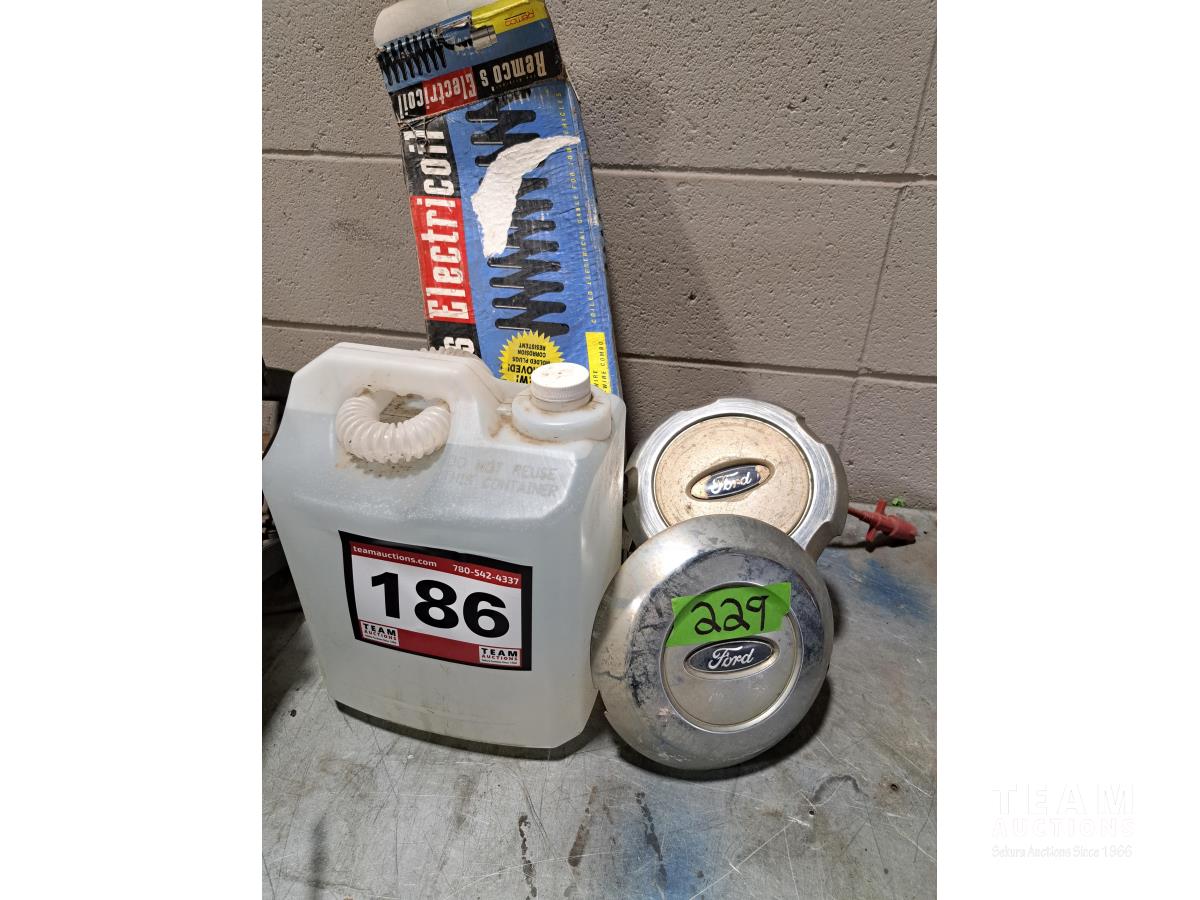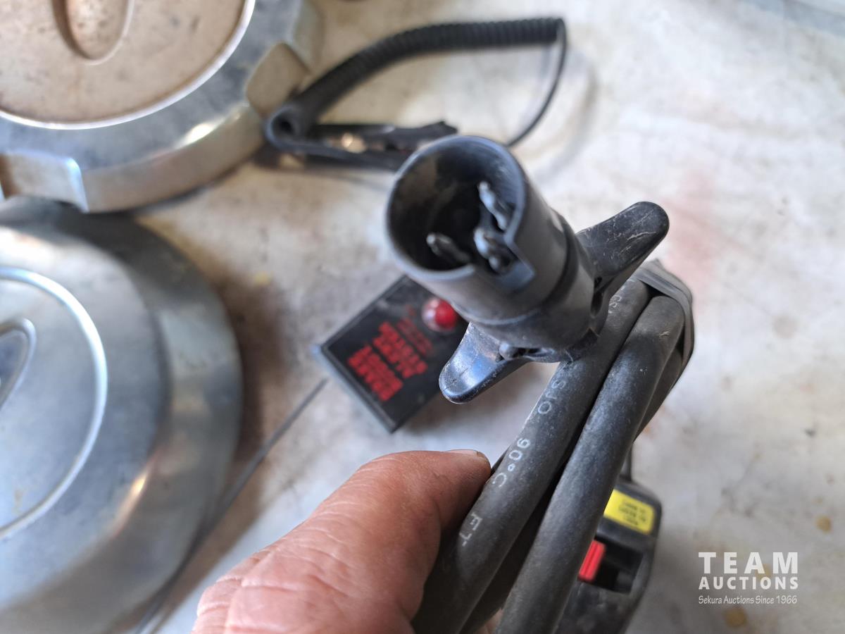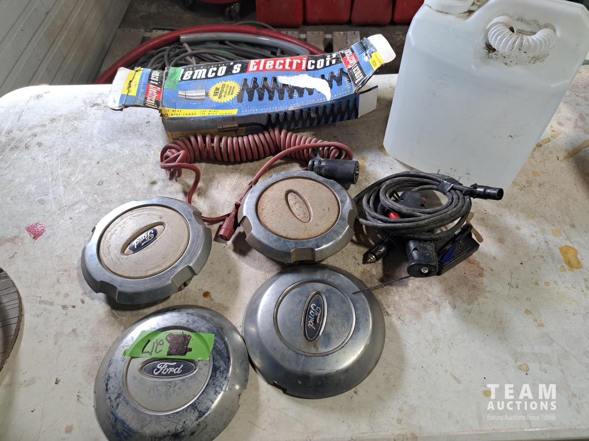 (4) Ford hub caps, 4 & 6 coiled wire electrical cable for tow vehicles, Buddy brake control system, jug of DEF fluid, electric winch control handle