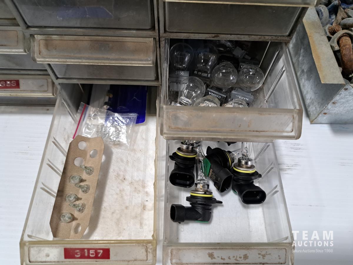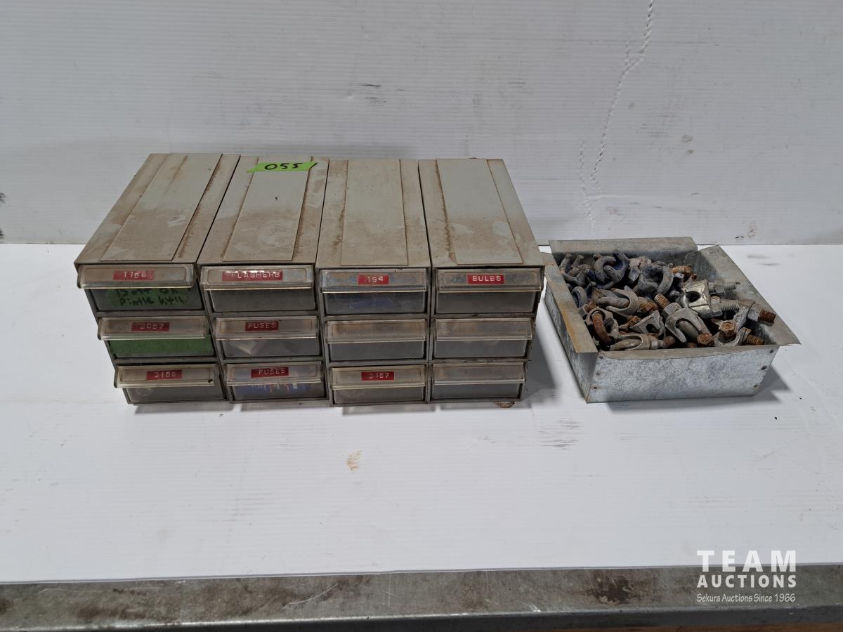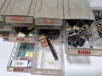 64 Small Cabinet with Contents & Box of Cable Clamps