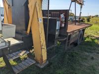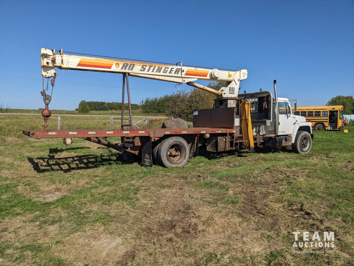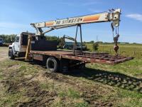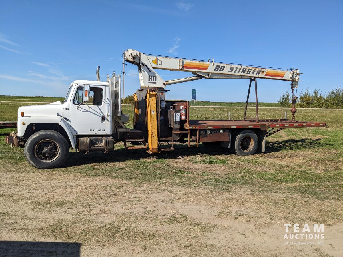 International DT466 7.6 L 6 cylinder diesel engine, 5&2 manual transmission, hydraulic wet kit, RO Stinger TC2057 3 section 57 ft straight boom front mount crane, outriggers, 102 ich wide 10.5 ft steel deck with 10 ft hydraulic beaver tail, spring suspension, 254 inch WB, 385/65R22.5 front tires, 11R22.5 rear tires
