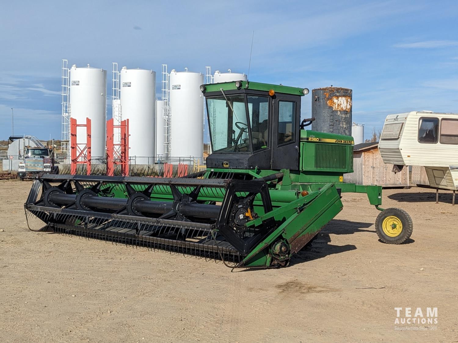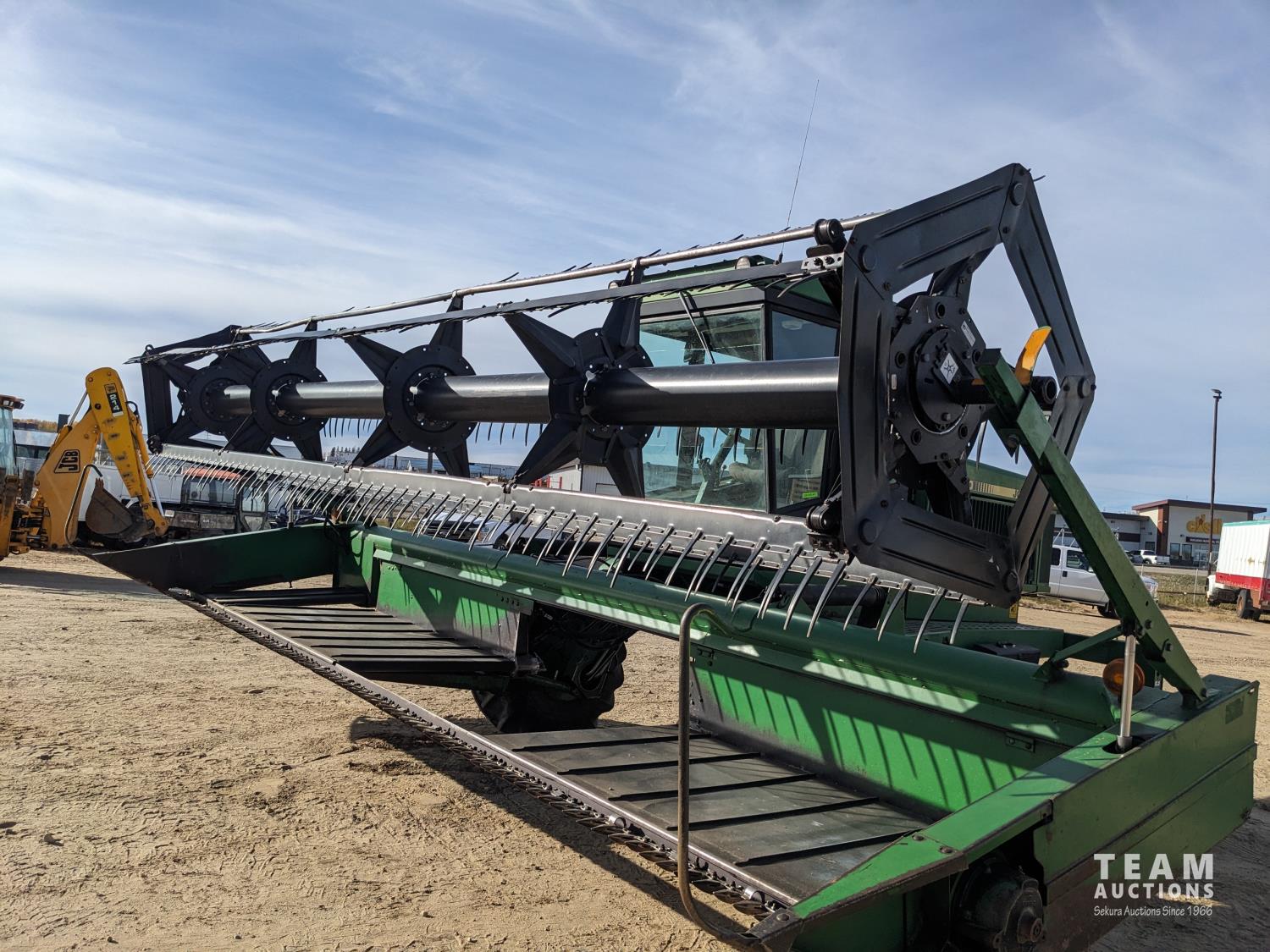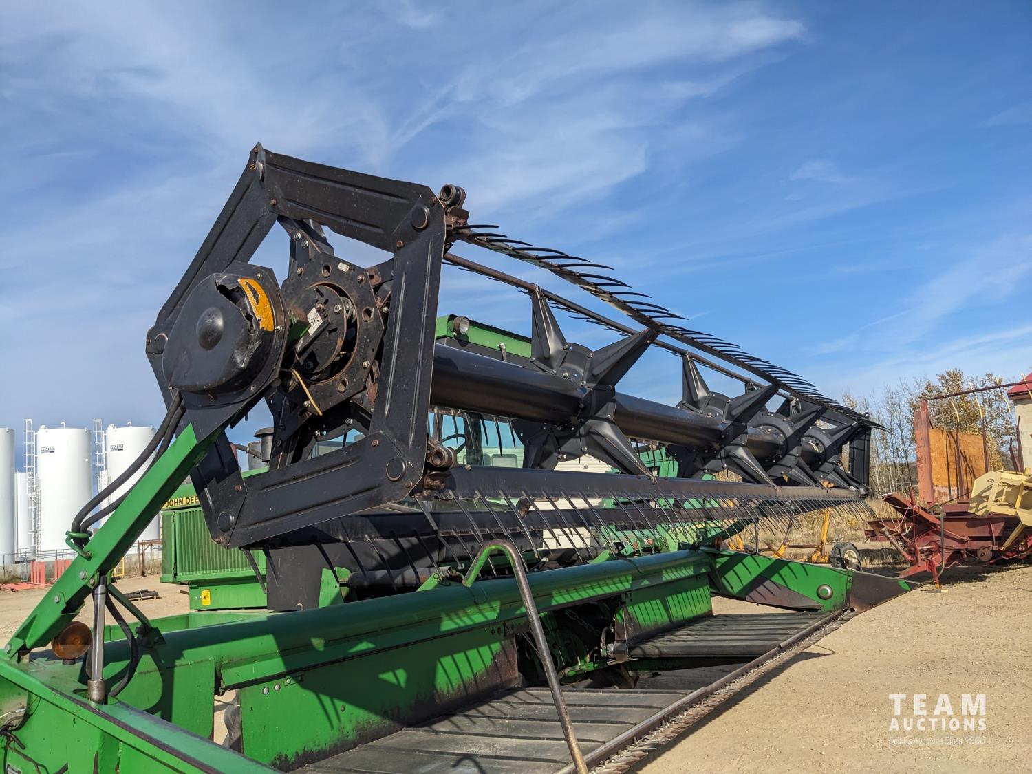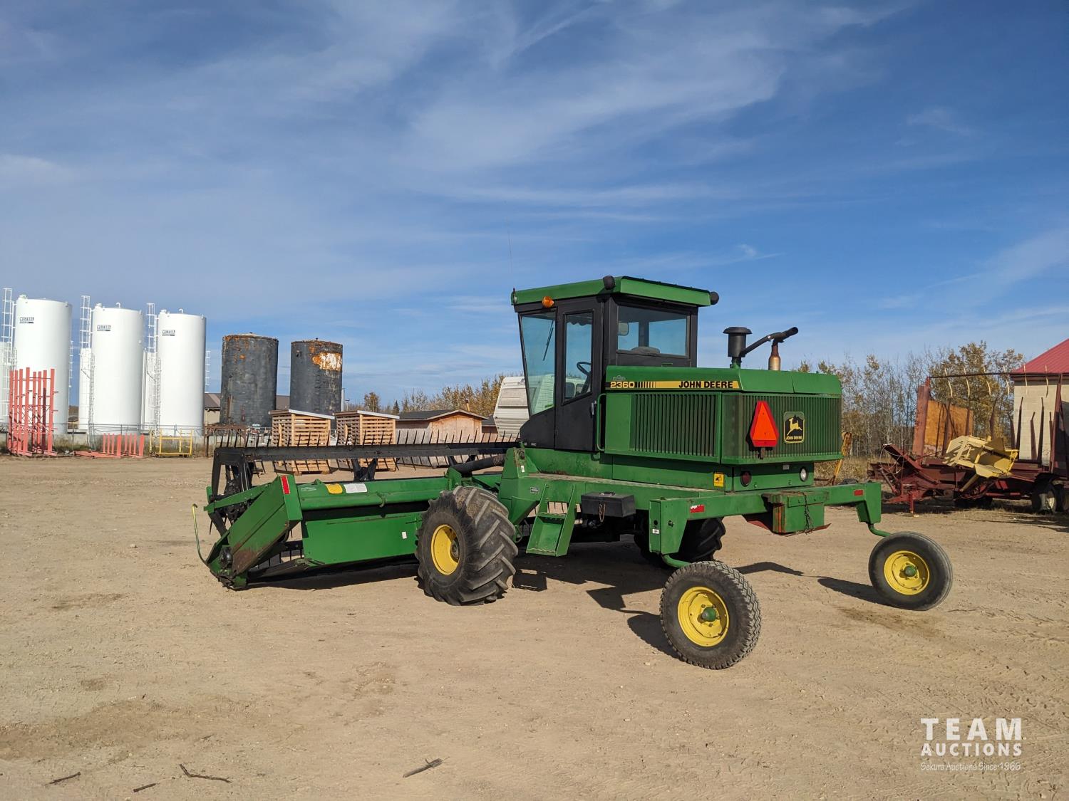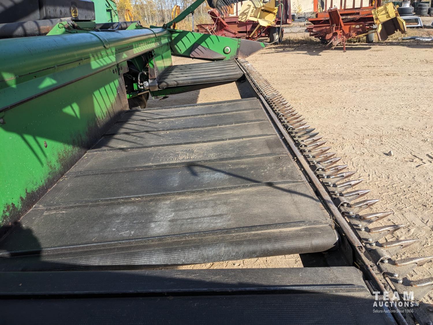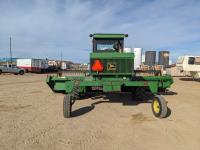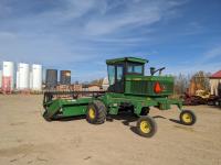John Deere 21 ft double delivery rigid draper header, pickup reel, John Deere 4 cylinder diesel engine, A/C, radio, 18.4-16.1 front tires, 8.5L-14 rear tires