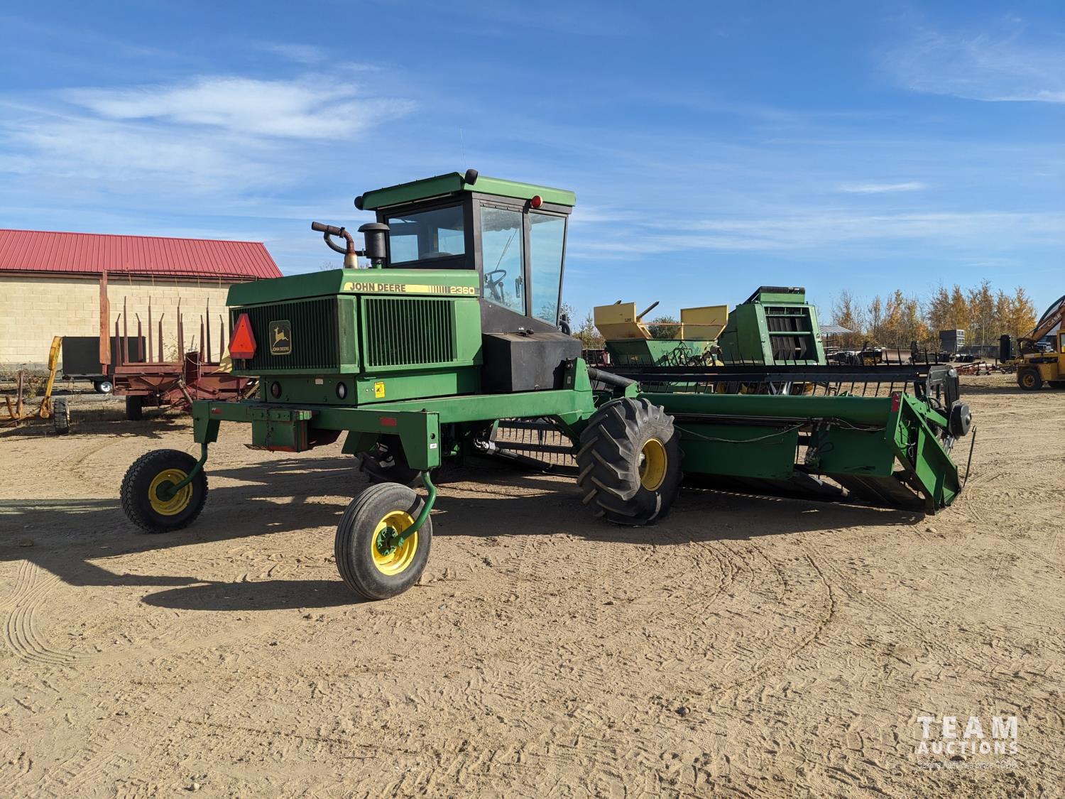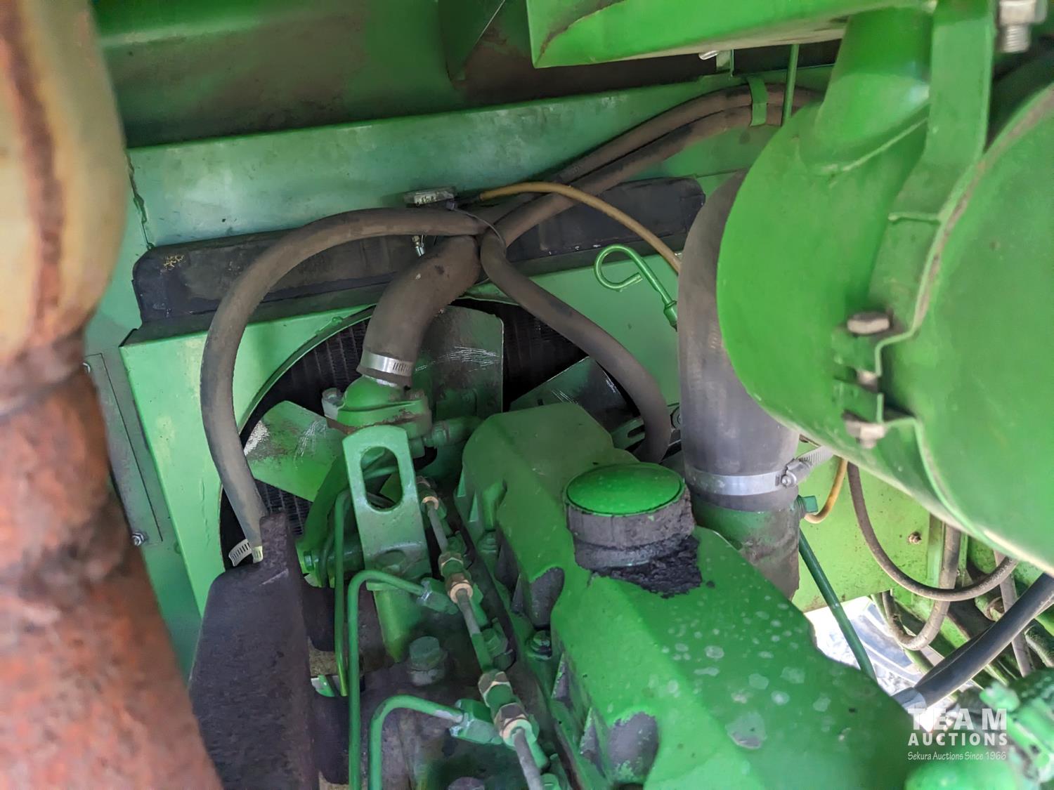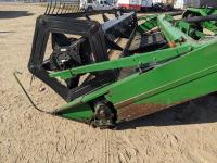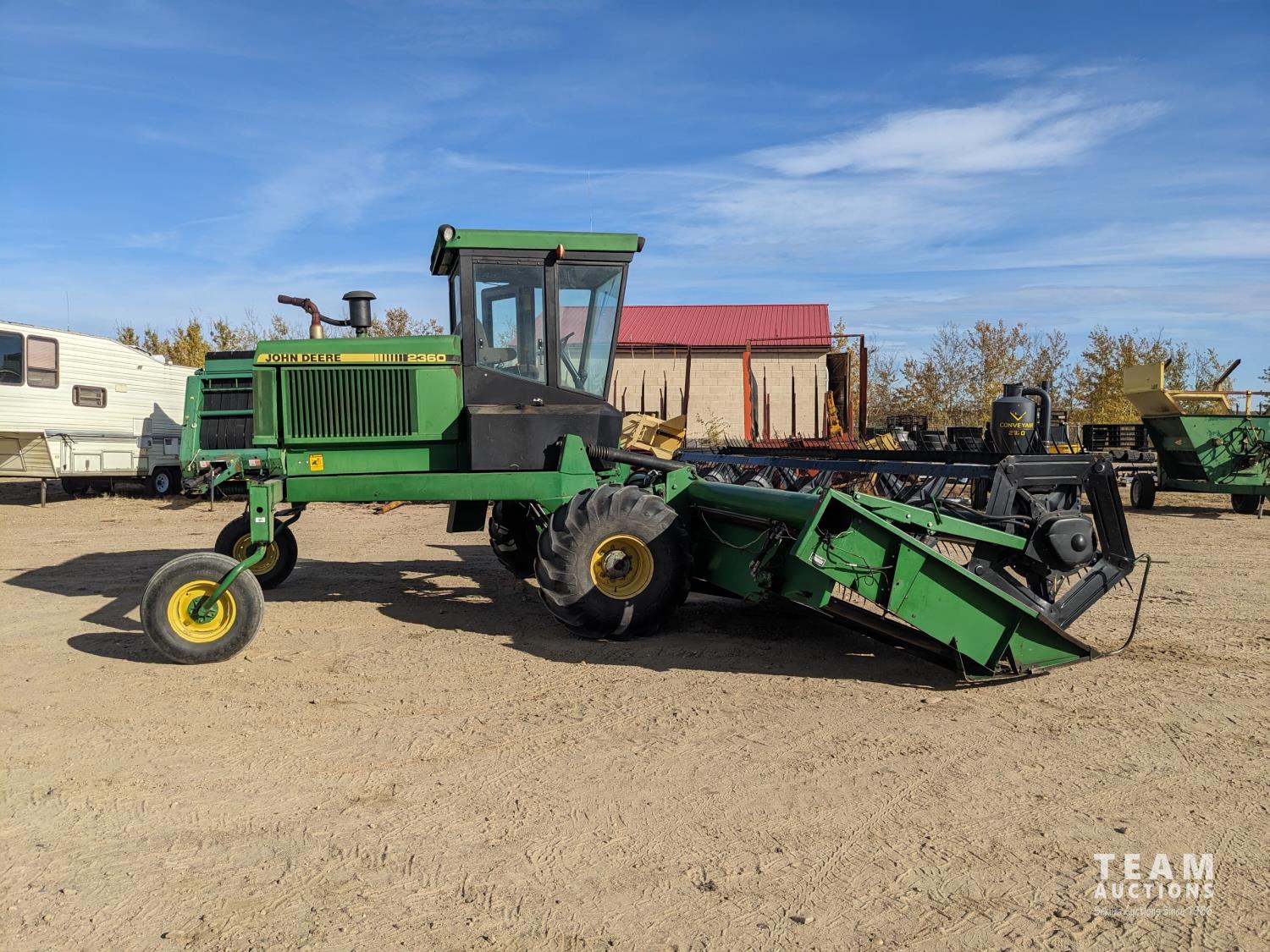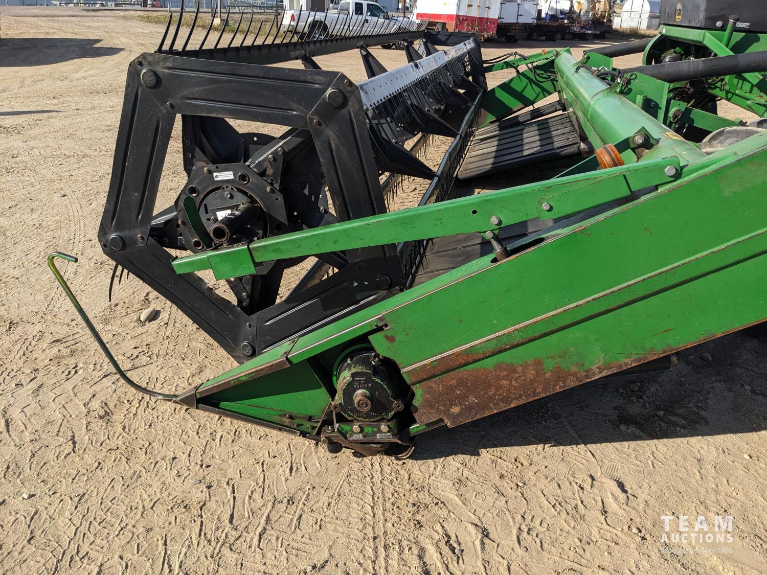 John Deere 21 ft double delivery rigid draper header, pickup reel, John Deere 4 cylinder diesel engine, A/C, radio, 18.4-16.1 front tires, 8.5L-14 rear tires
