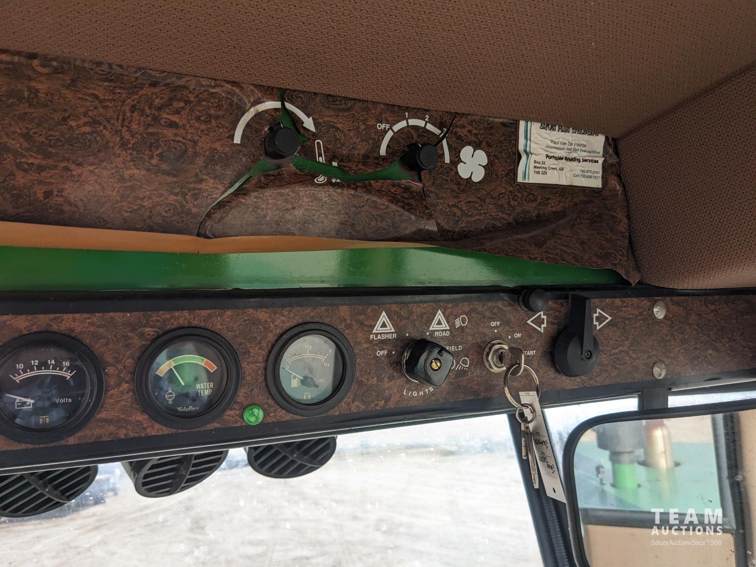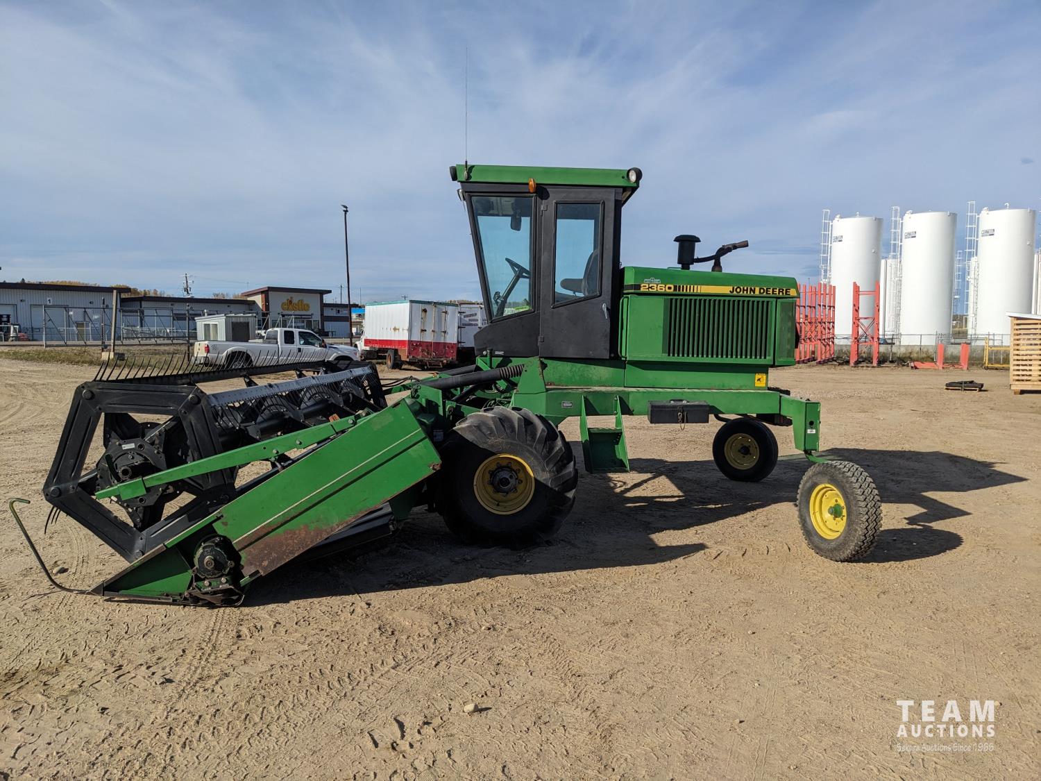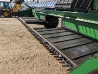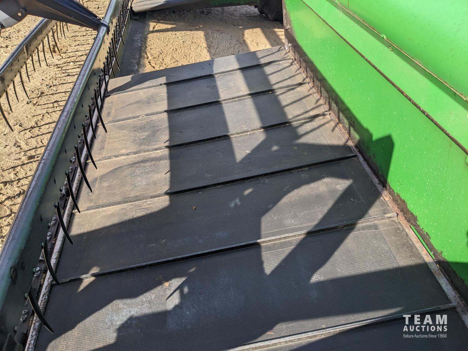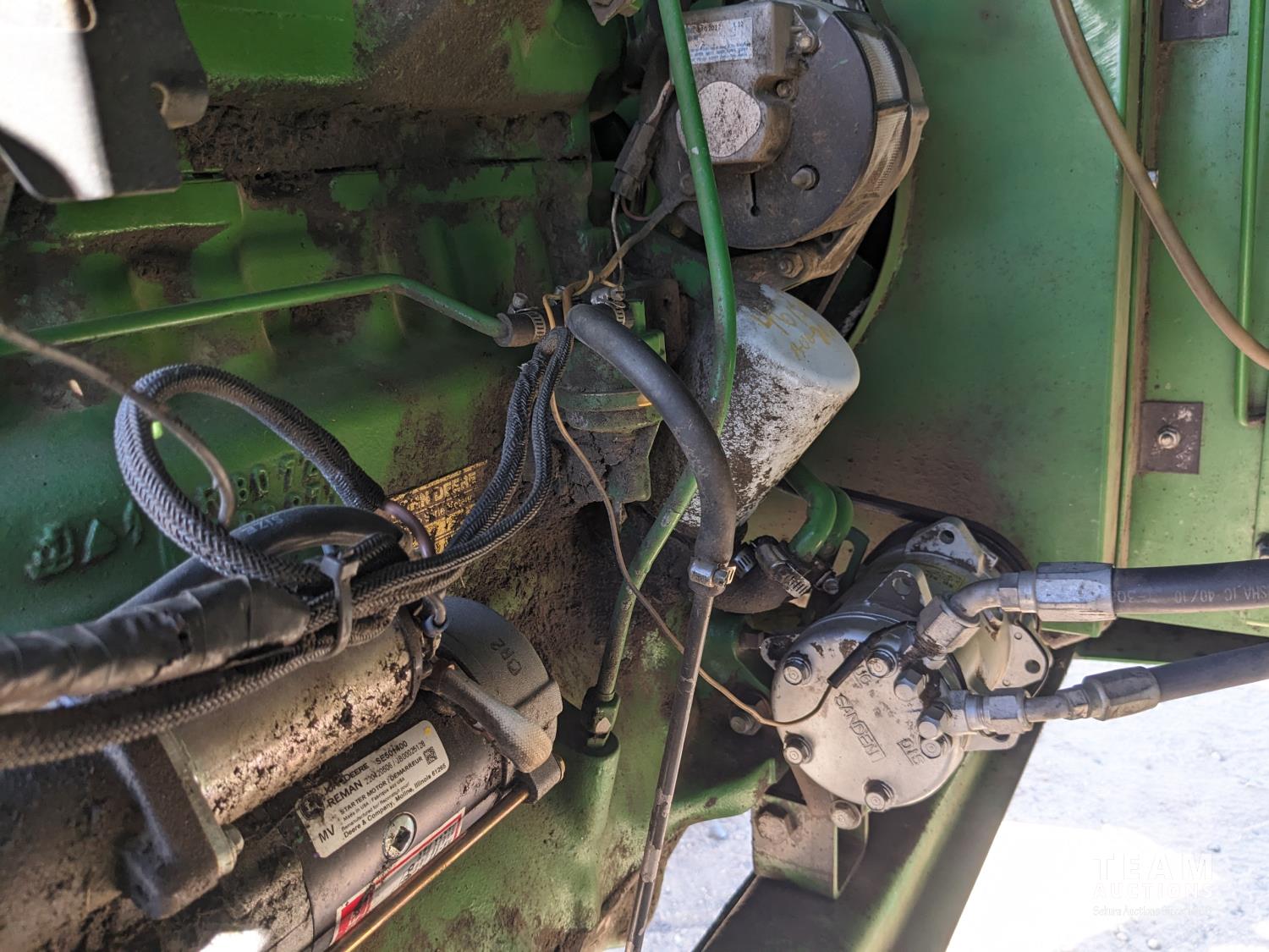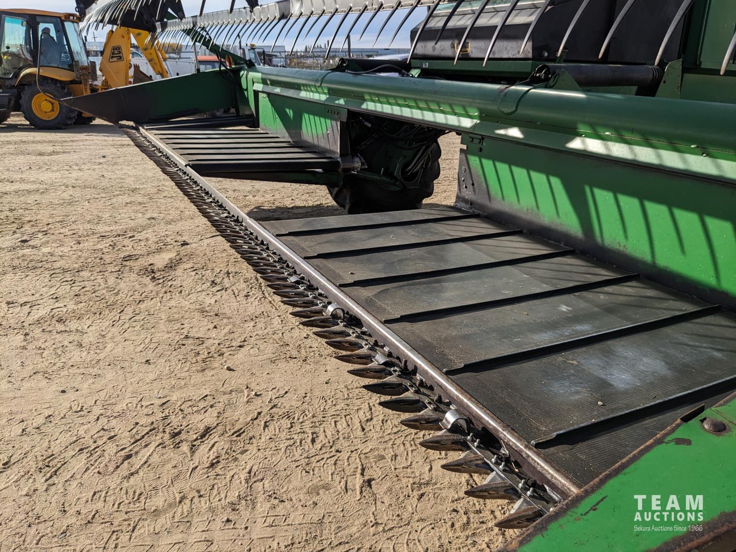 John Deere 21 ft double delivery rigid draper header, pickup reel, John Deere 4 cylinder diesel engine, A/C, radio, 18.4-16.1 front tires, 8.5L-14 rear tires