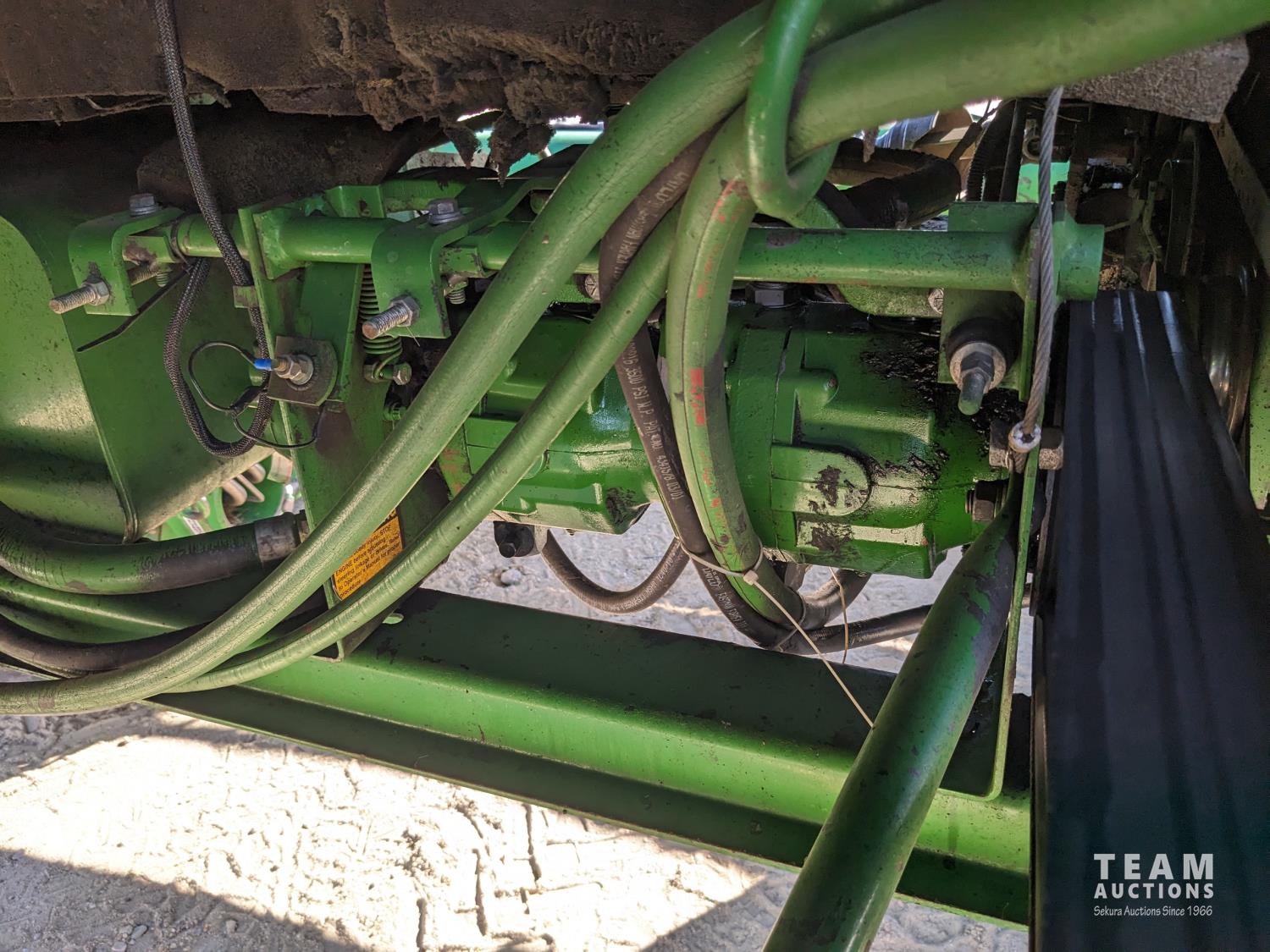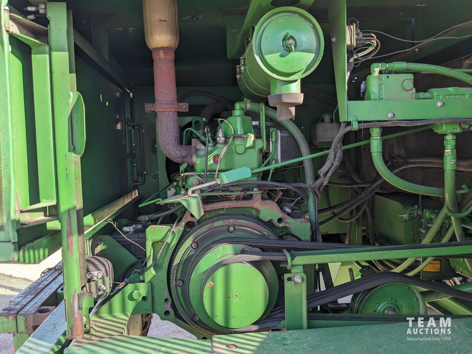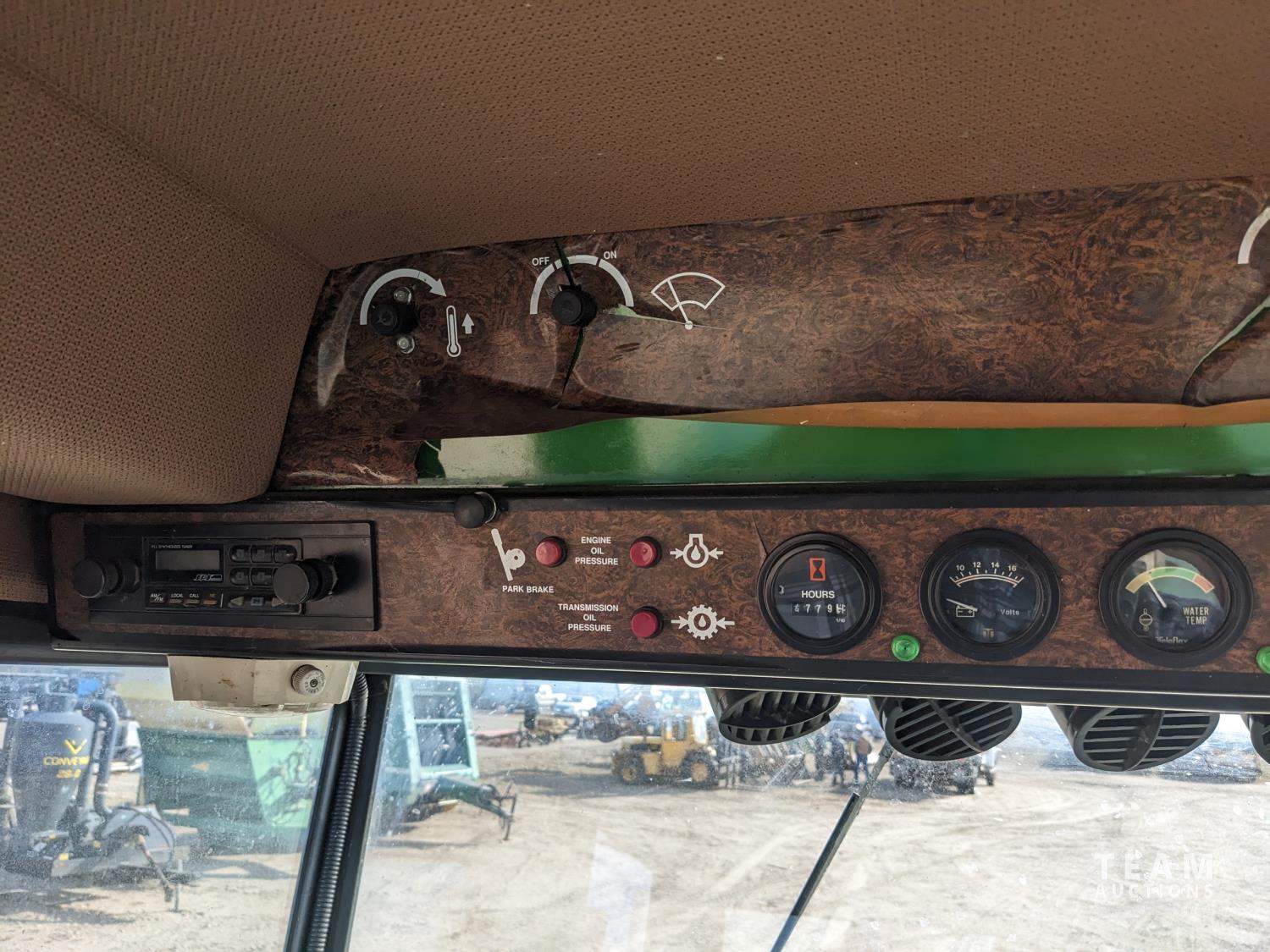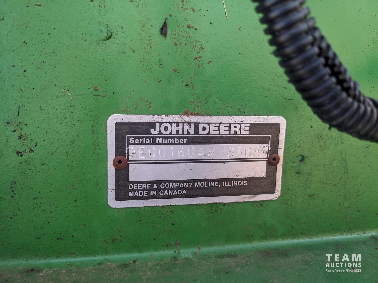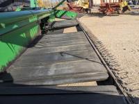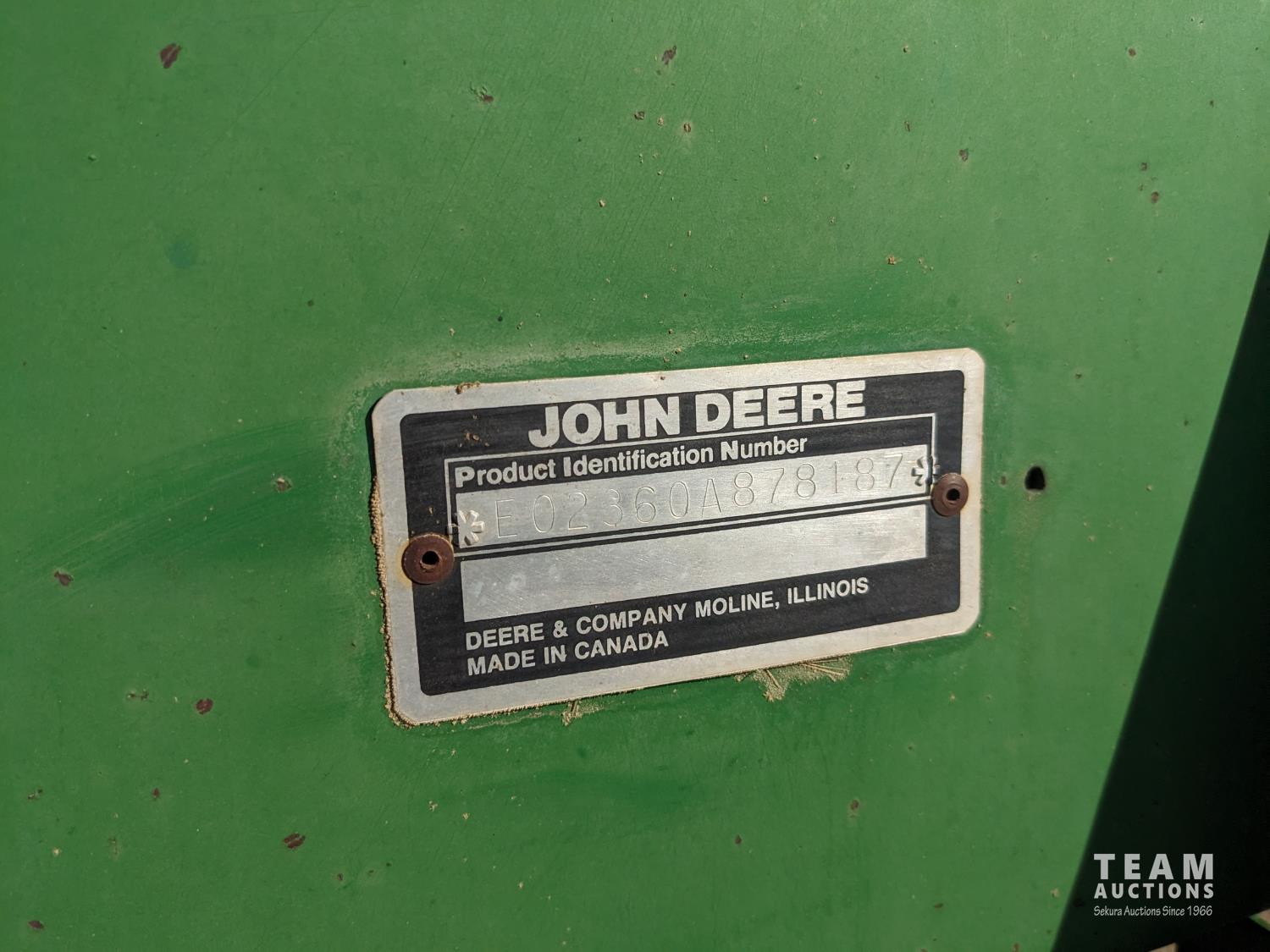 John Deere 21 ft double delivery rigid draper header, pickup reel, John Deere 4 cylinder diesel engine, A/C, radio, 18.4-16.1 front tires, 8.5L-14 rear tires