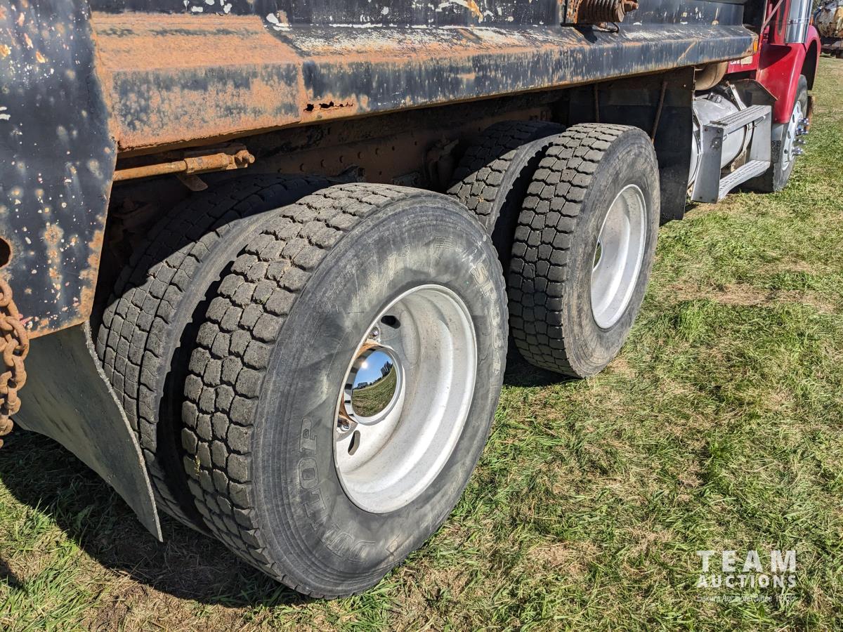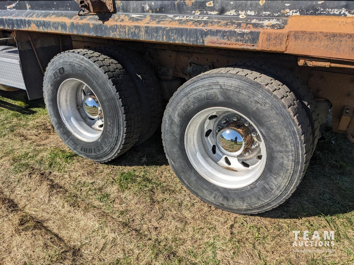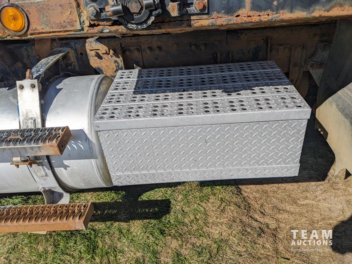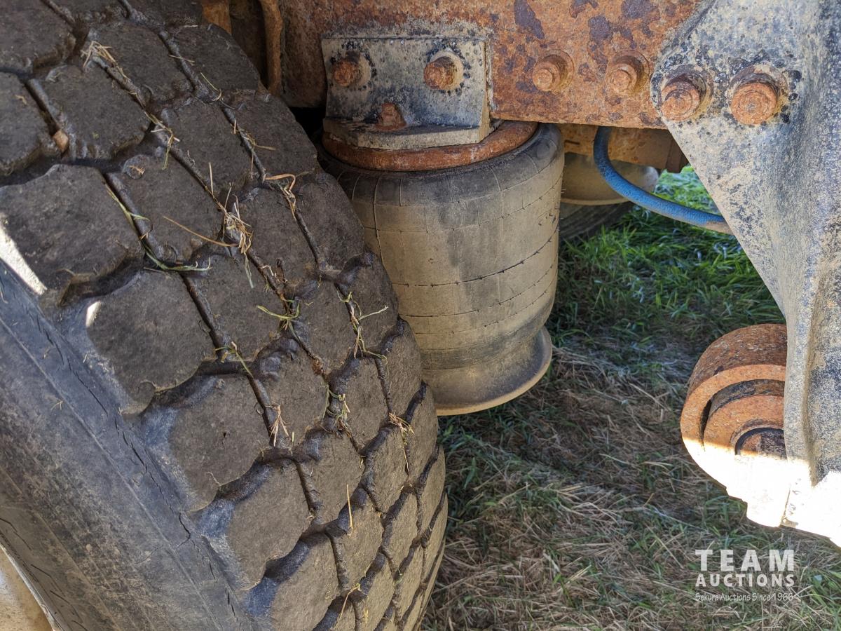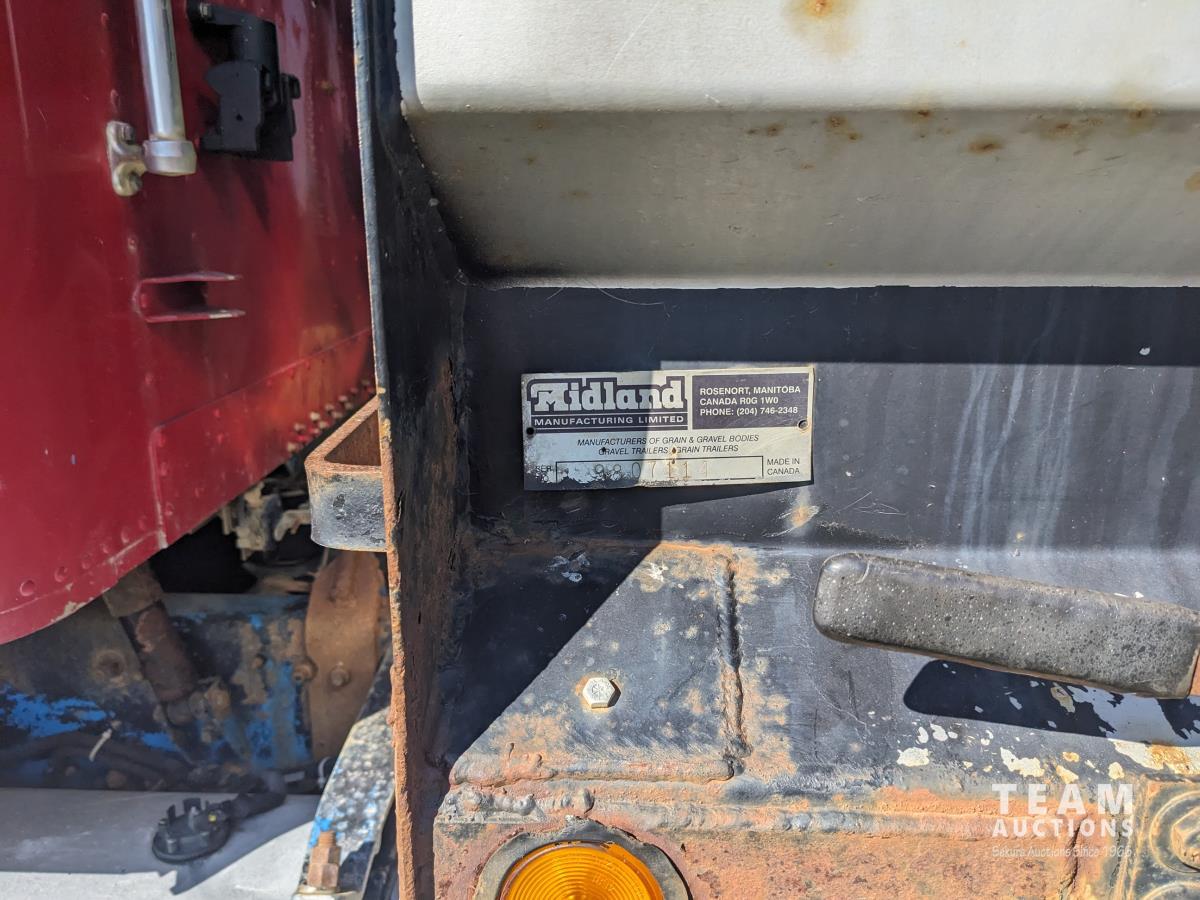 Cummins N14 14 L 6 cylinder diesel engine, Eaton Fuller 18 speed manual transmission, hydraulic wet kit, Midland 14 ft gravel box, tarp, air ride suspension, 12,000 lb front axle, 40,000 lb rear axles, 3 way diff locks, 196 inch WB, all aluminum wheels, 315/80R22.5 front tires, 11R22.5 rear tires