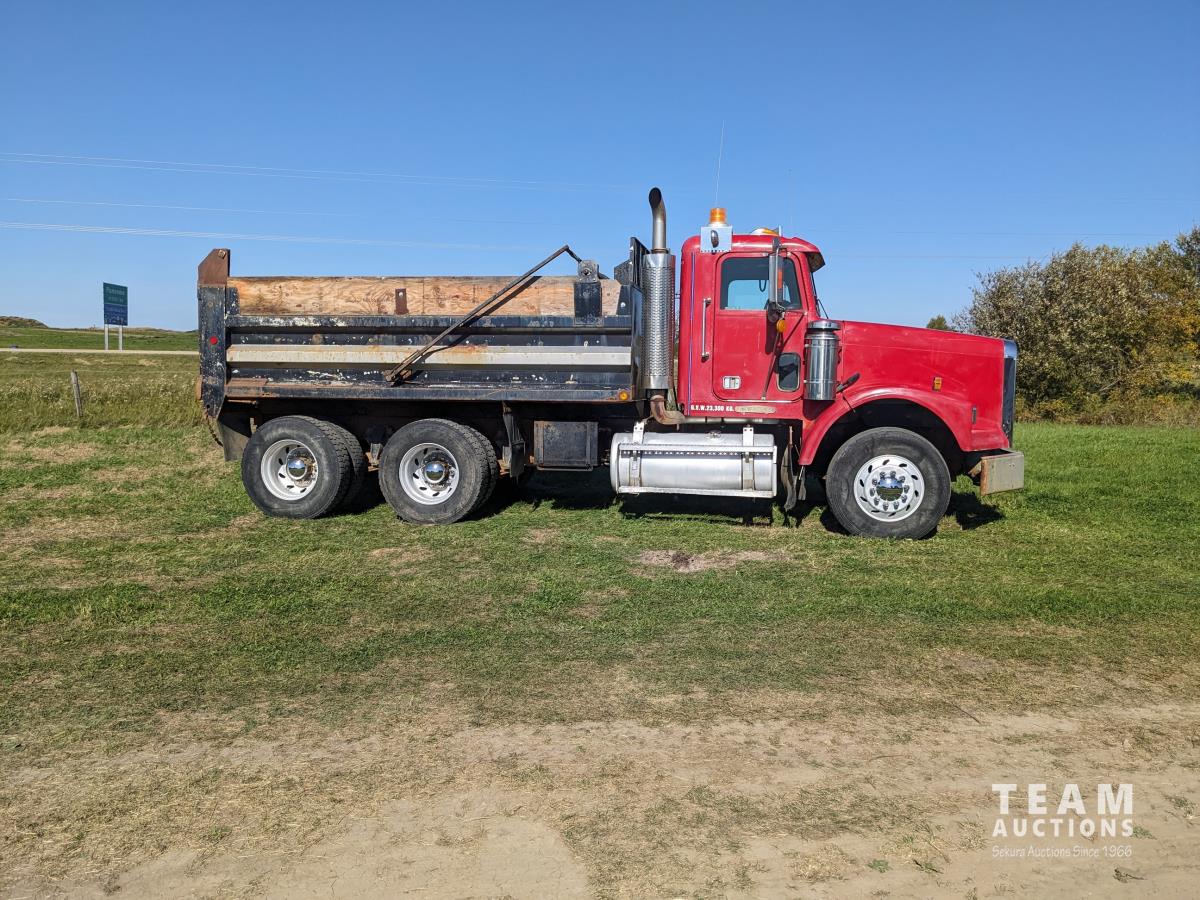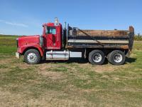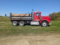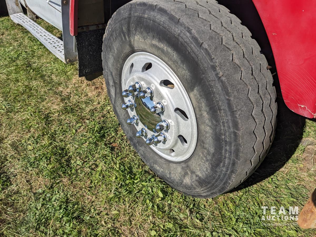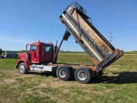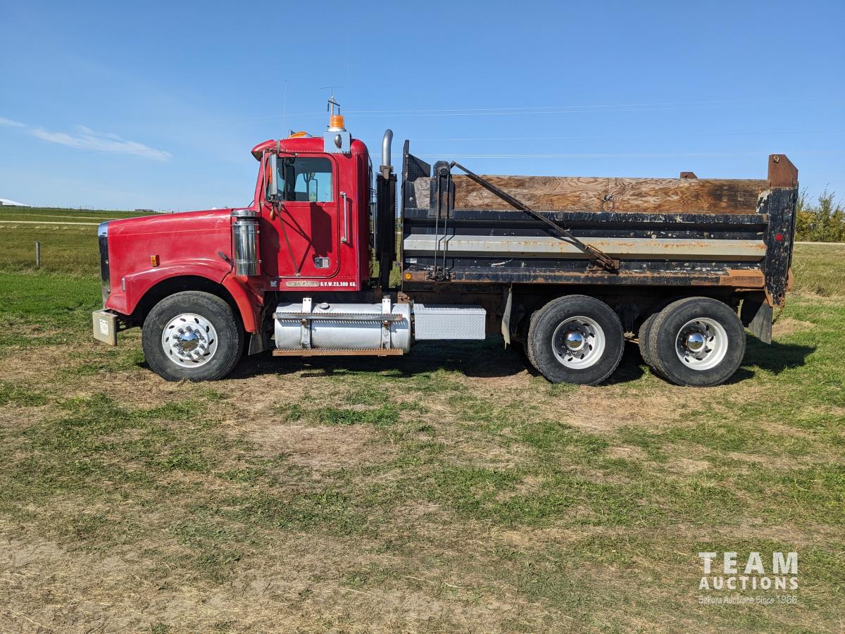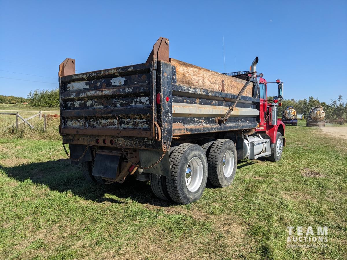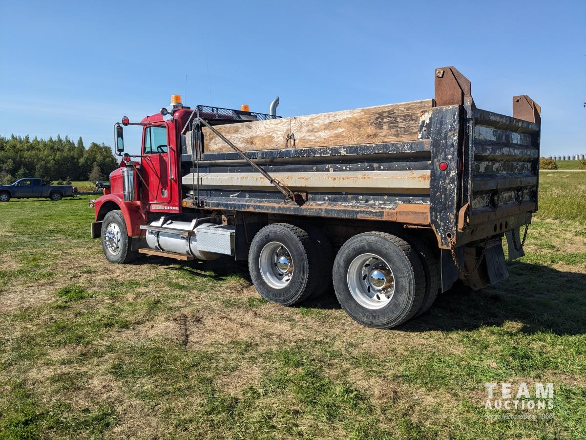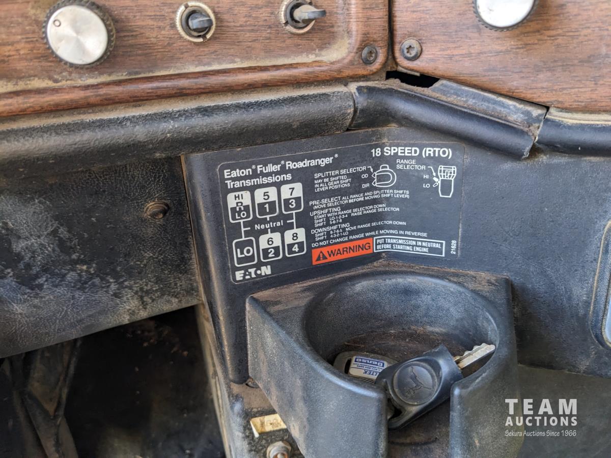 Cummins N14 14 L 6 cylinder diesel engine, Eaton Fuller 18 speed manual transmission, hydraulic wet kit, Midland 14 ft gravel box, tarp, air ride suspension, 12,000 lb front axle, 40,000 lb rear axles, 3 way diff locks, 196 inch WB, all aluminum wheels, 315/80R22.5 front tires, 11R22.5 rear tires