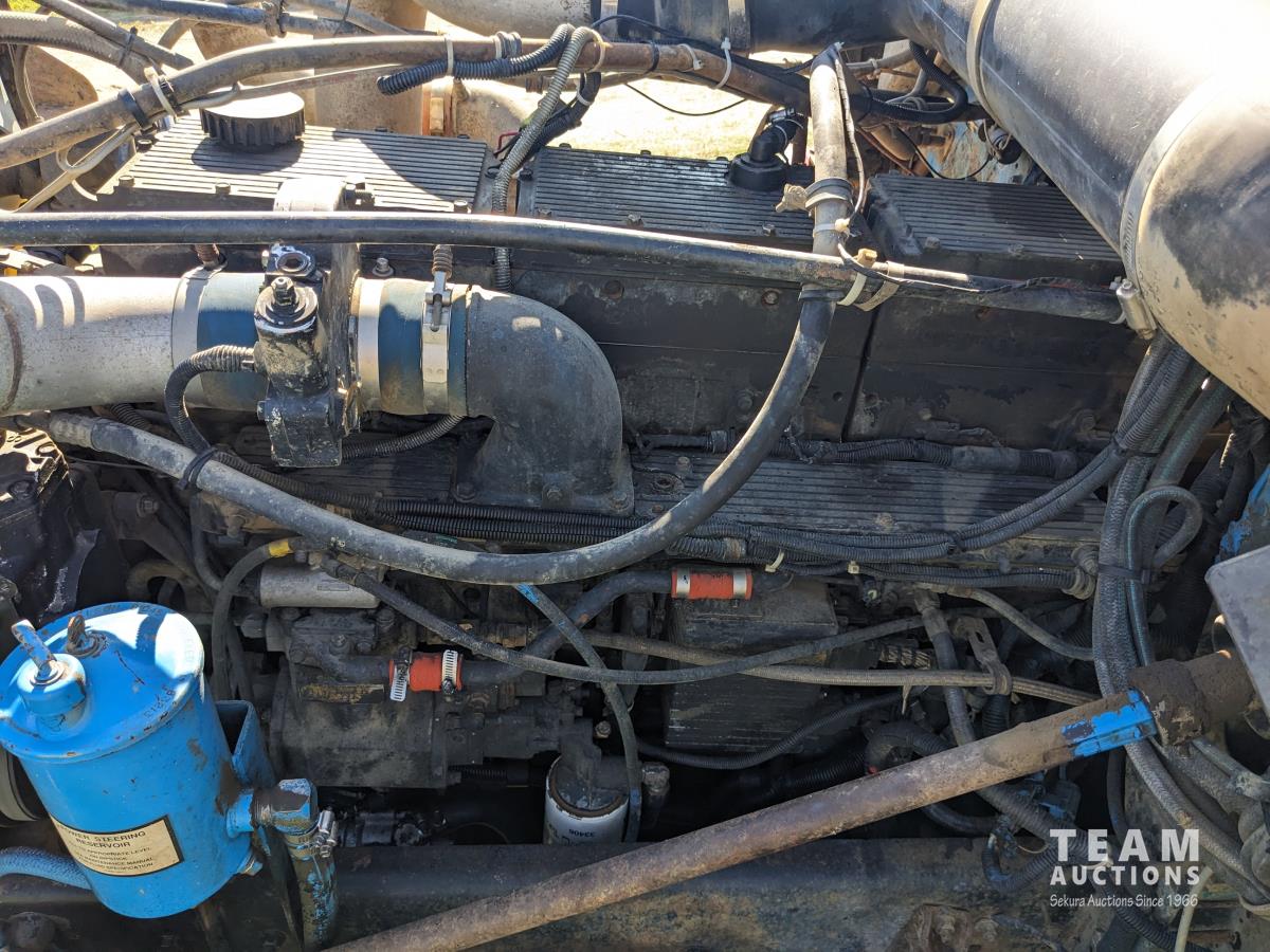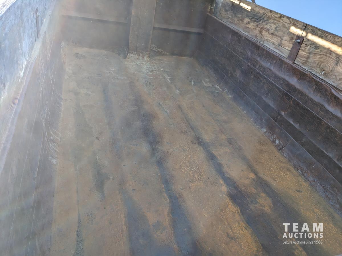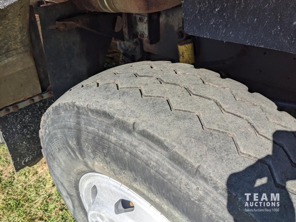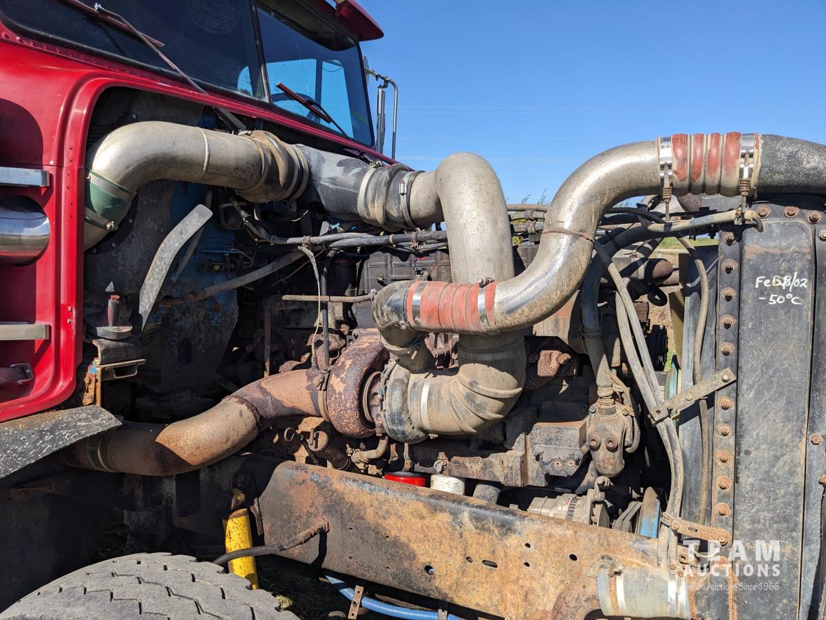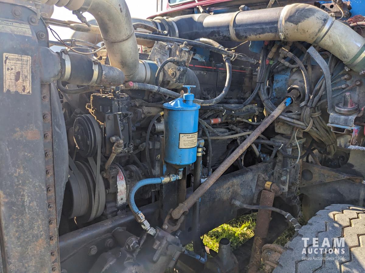 Cummins N14 14 L 6 cylinder diesel engine, Eaton Fuller 18 speed manual transmission, hydraulic wet kit, Midland 14 ft gravel box, tarp, air ride suspension, 12,000 lb front axle, 40,000 lb rear axles, 3 way diff locks, 196 inch WB, all aluminum wheels, 315/80R22.5 front tires, 11R22.5 rear tires
