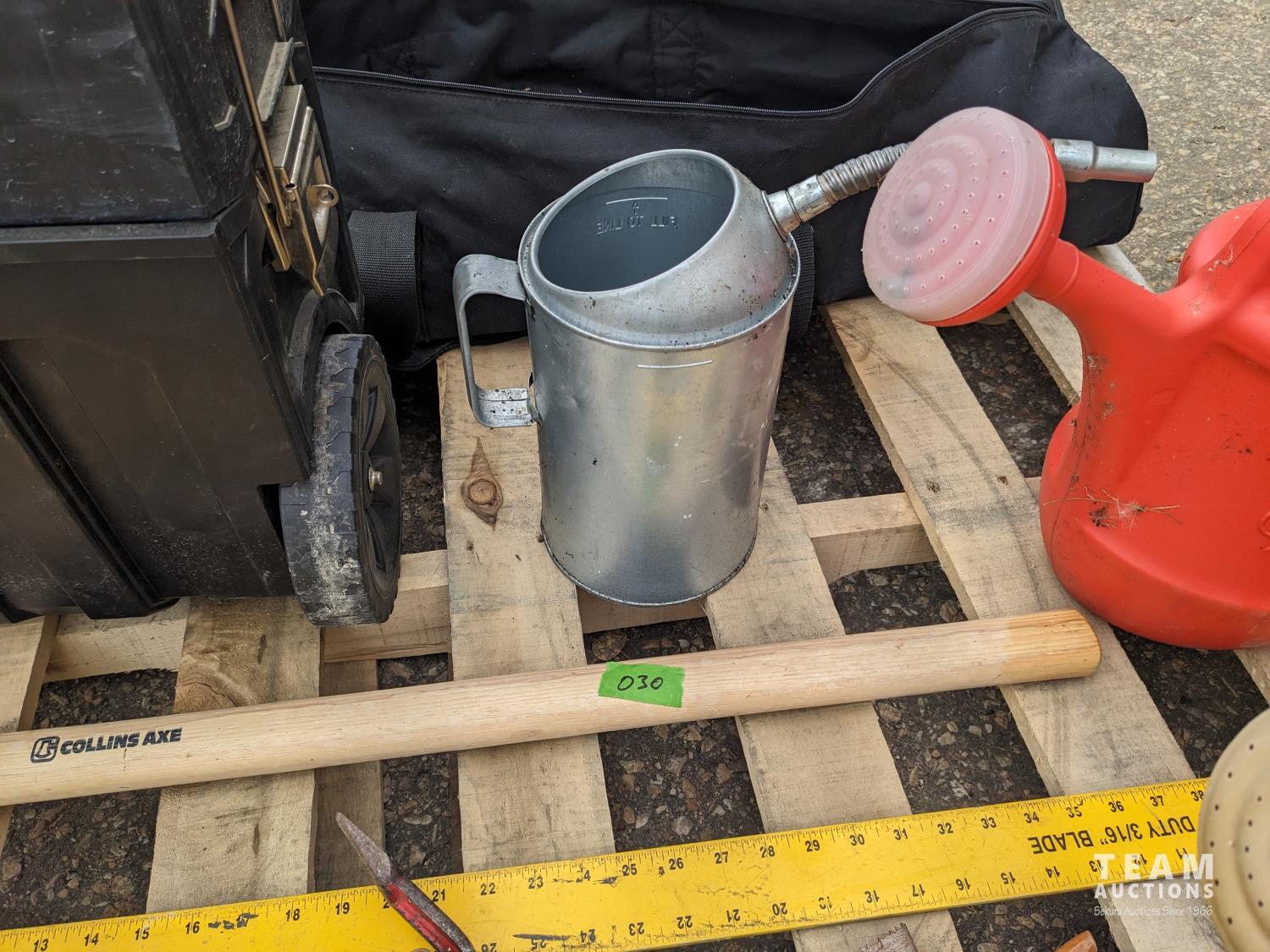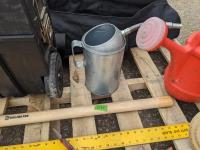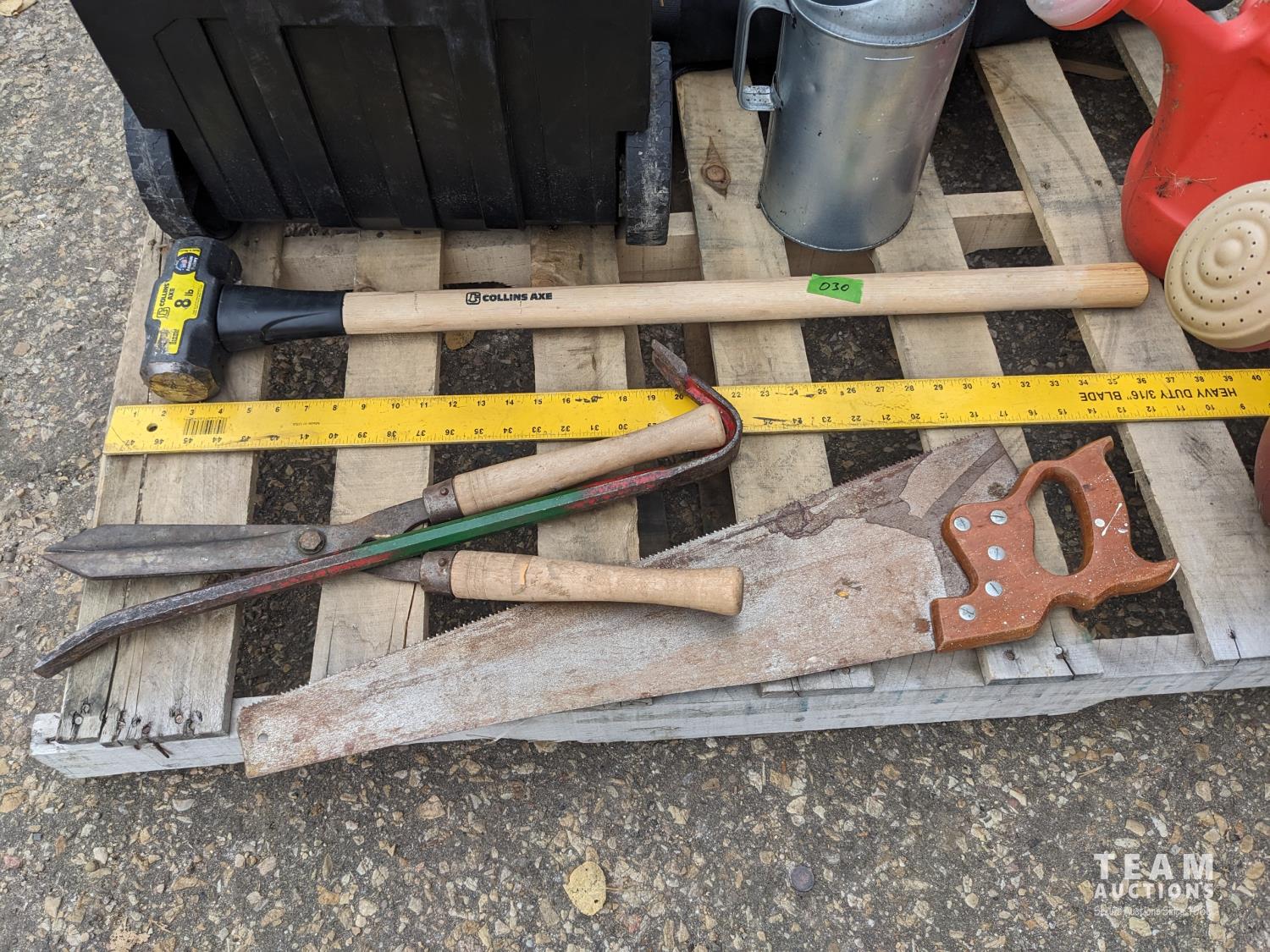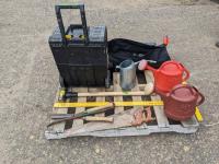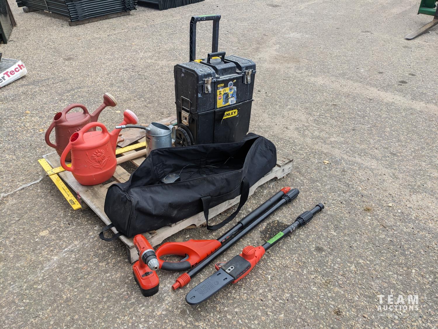 Black & Decker long reach cordless tree pruner, (2) watering cans, oil can, T square, 8 lb sledge hammer, hand saw, crow bar, Stanley tool box