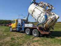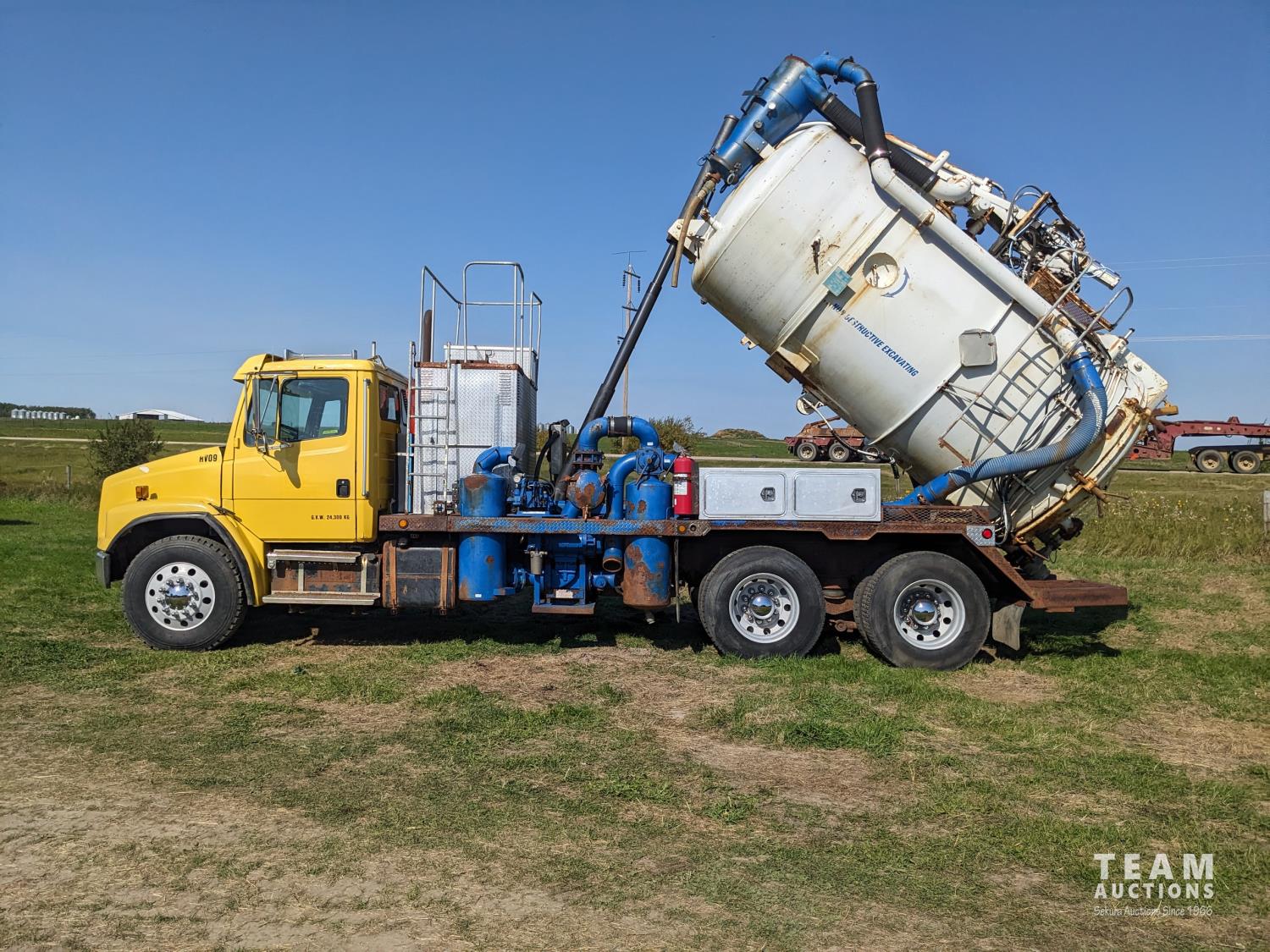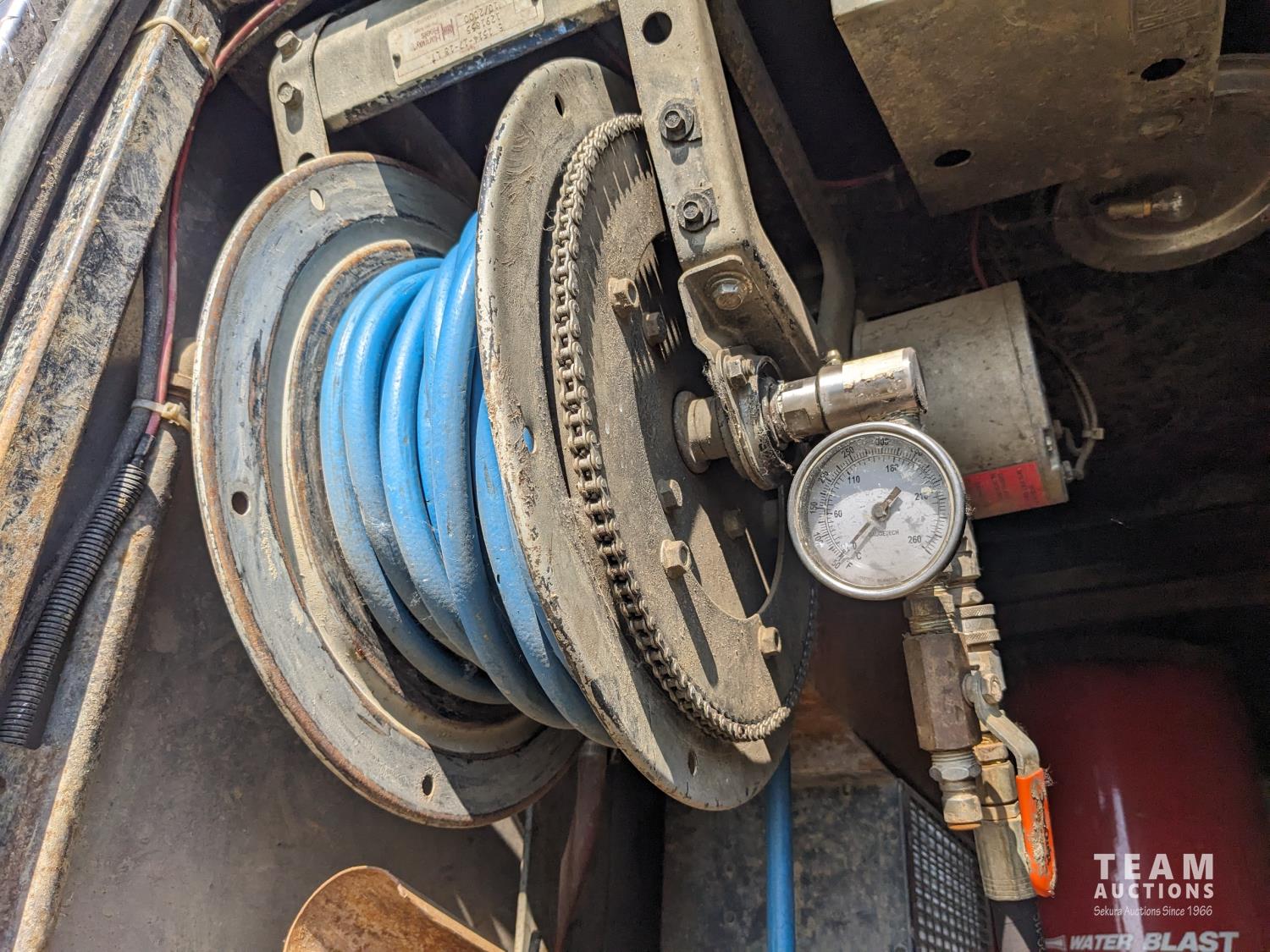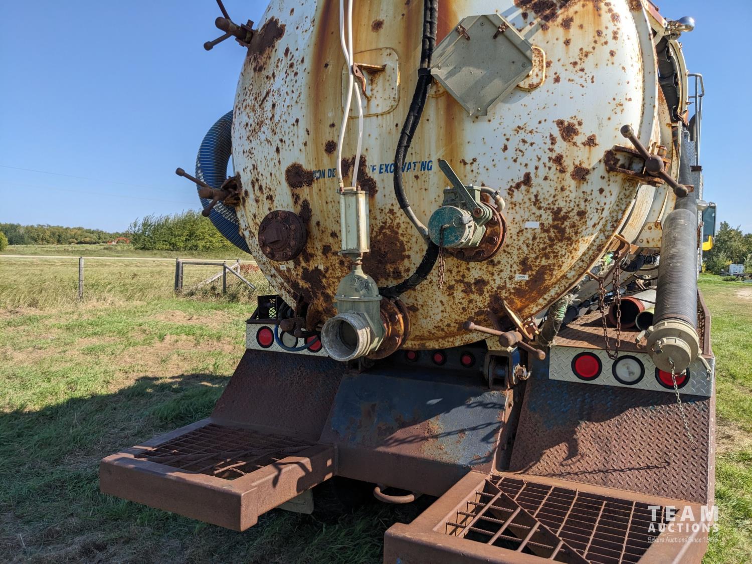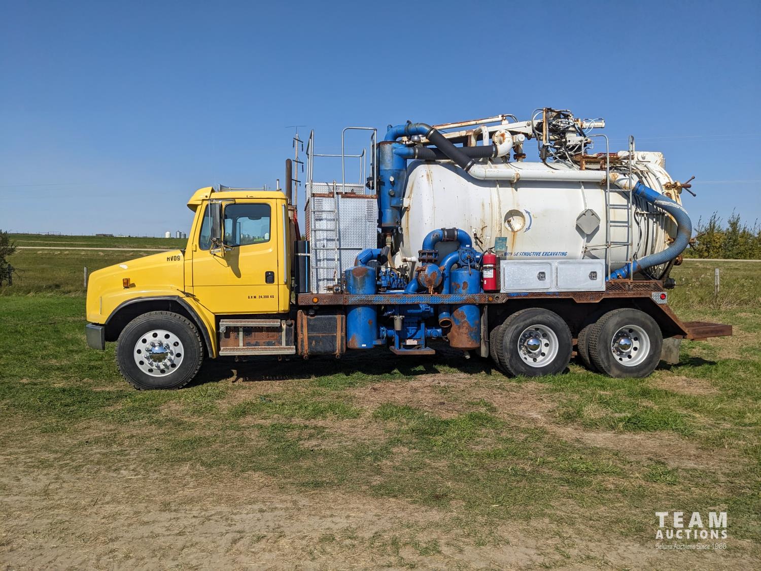 Caterpillar 3126 7.2 6 cylinder 300 HP diesel engine, Eaton Fuller 18 speed manual transmission, TC350 PTO pump, Westech 12.5 cube 2 compartment tank, 10 cube debris, 2.5 cube water, Cat 650 hot water pump, Hbion 820 blower, hoist, opening end gate, wireless remote Cusco 6 inch boom, 420,000 boiler, Chalmers rubber block suspension, 12,000 lb front axle, 40,000 lb rear axles, 3 way diff locks, aluminum outer wheels, 11R22.5 tires