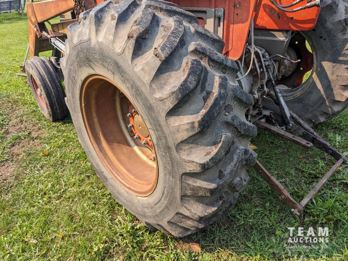 Loader, bale forks, Perkins 4 cylinder 58 HP, diesel engine, 51 PTO HP, 12 speed partial power shift transmission, open station platform, 540 PTO, 3 point hitch, 1 rear hydraulic outlets, 9.5L-15 front tires, 16.9-28 rear tires