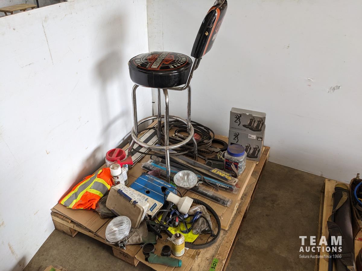 Harley Davidson Bar Stool, crowbar, seat covers, spot lights, (3) 22 inch wiper blades, (2) 20 inch wiper blades, miscellaneous
