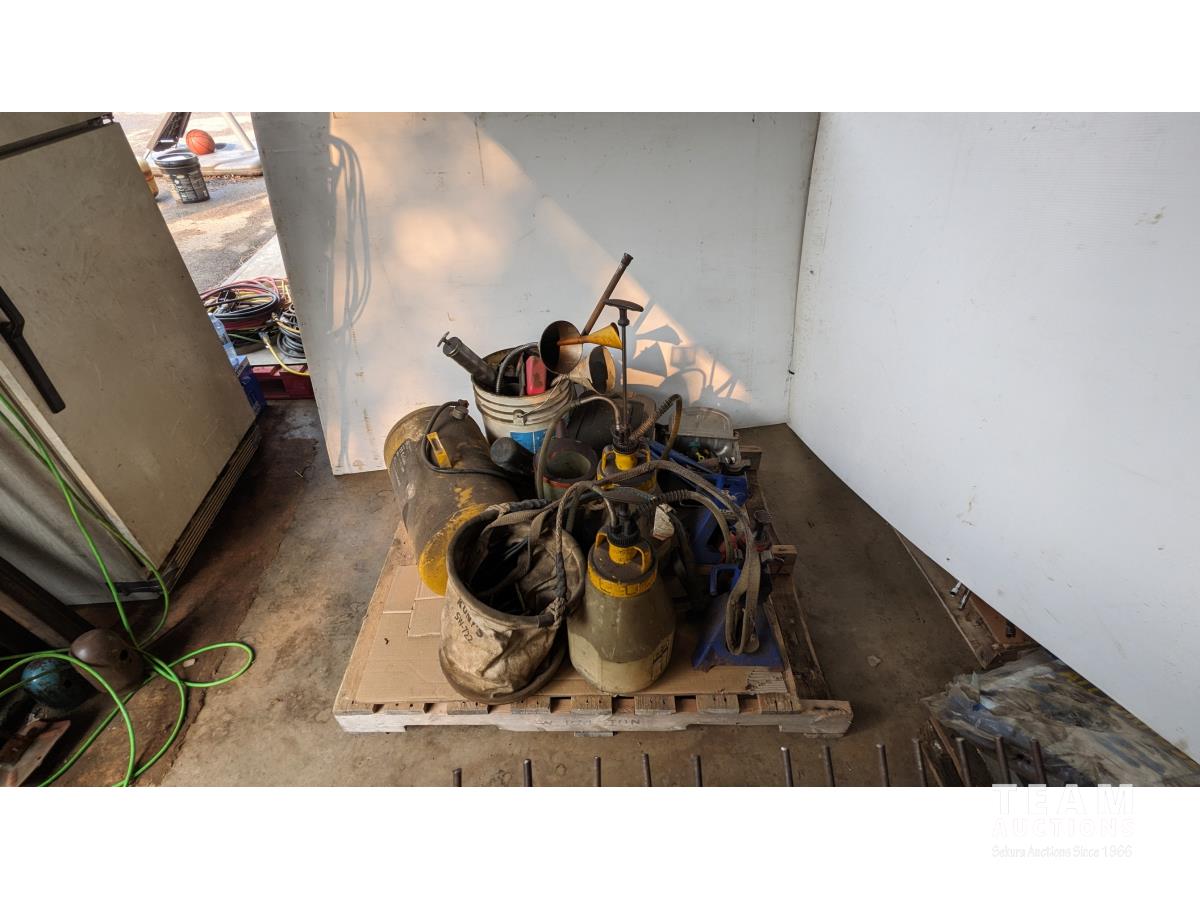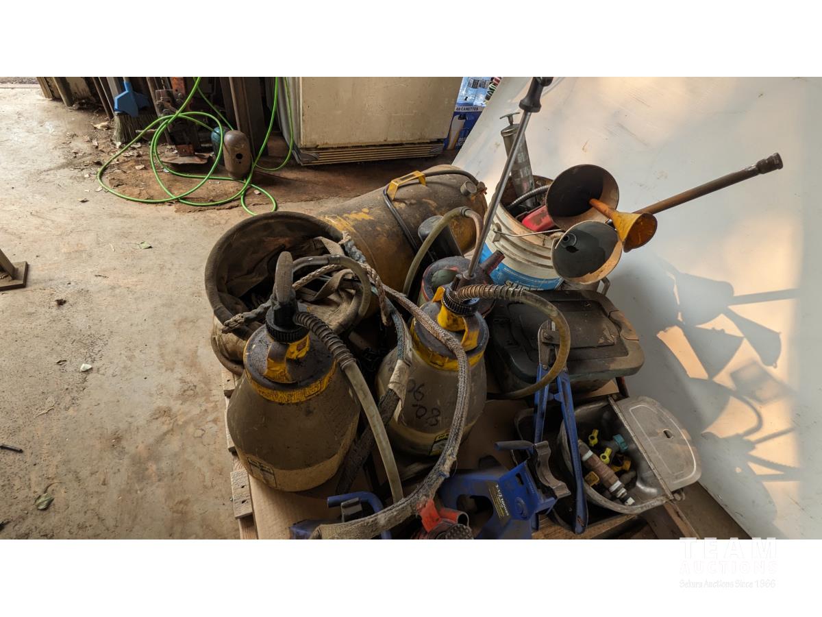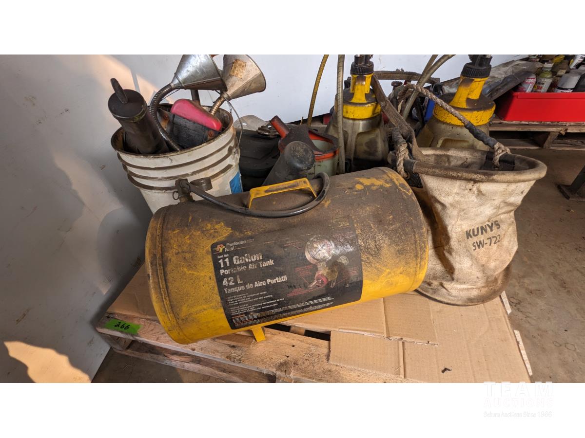 11 Gallon portable air tank, bottle jack, (2) sprayers, funnels, qty of miscellaneous