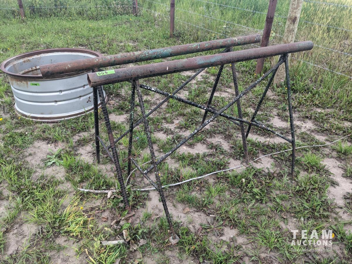 94 inch wood box containing roller chain and metal pegs, poly tank with steel stand, (2) metal saw horses, 38 inch diameter rim