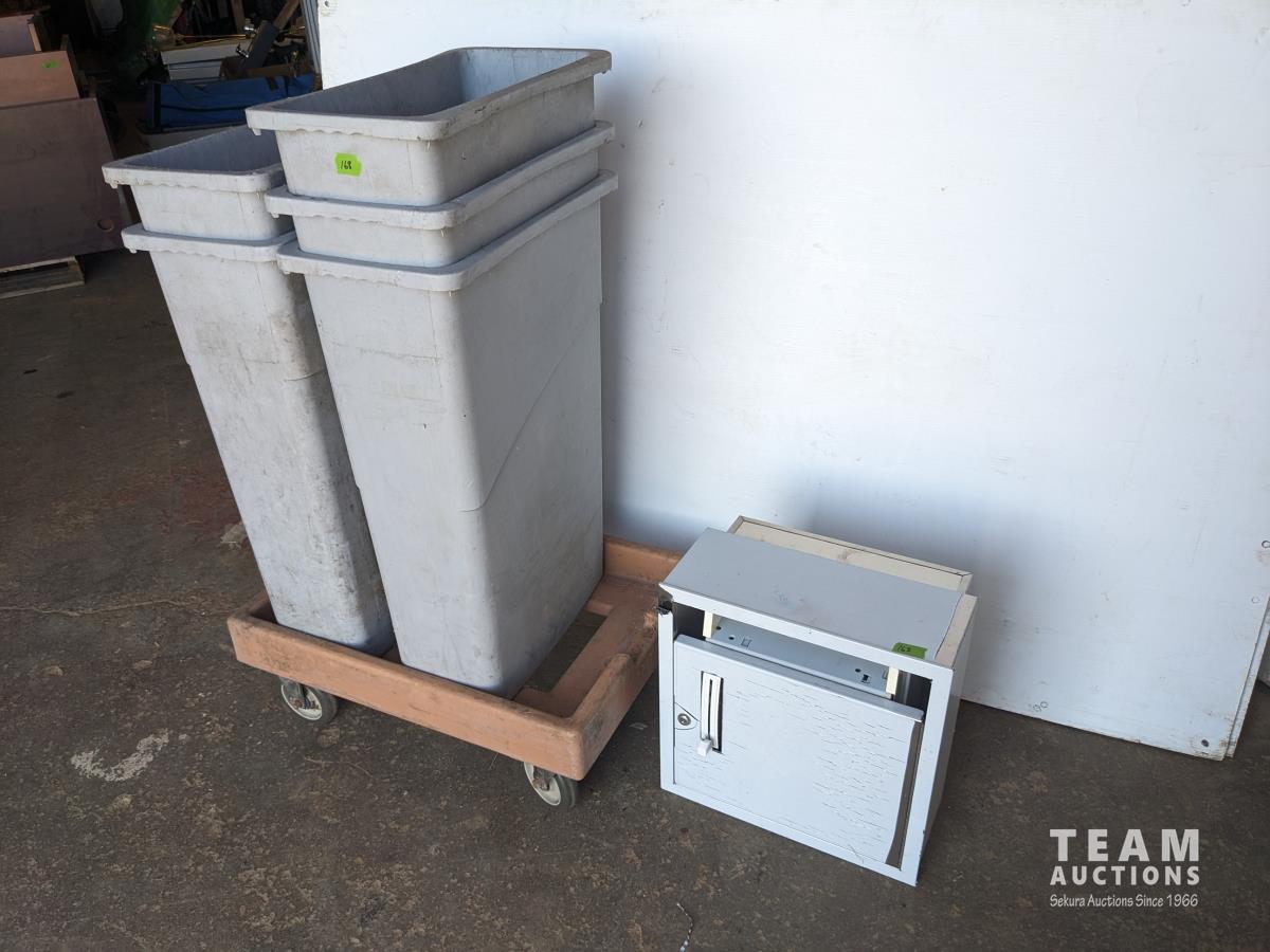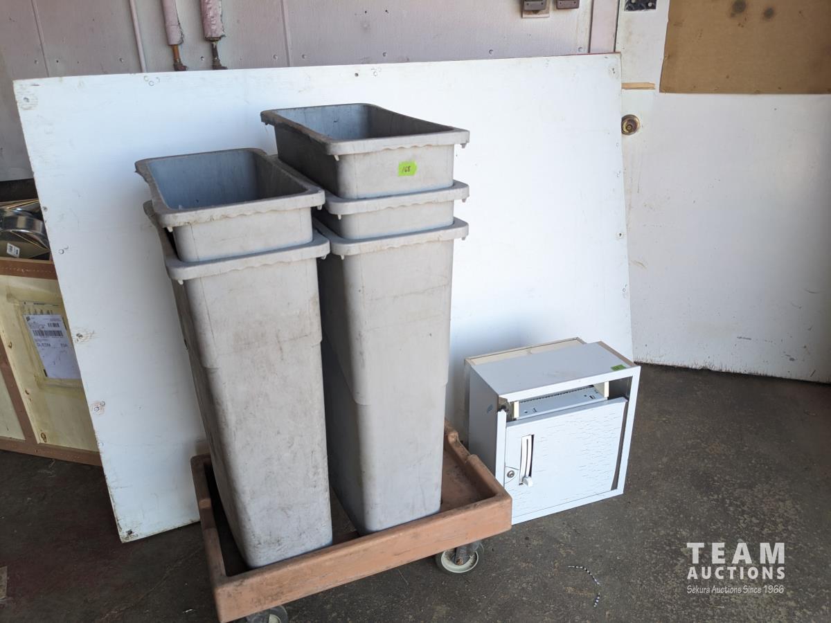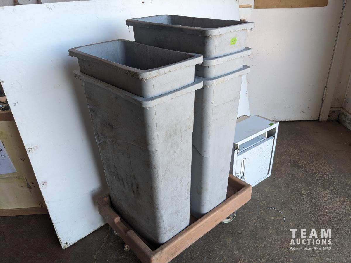 139 Hand Towel Dispenser, (5) Poly Garbage Cans, 4 Wheel Dolly