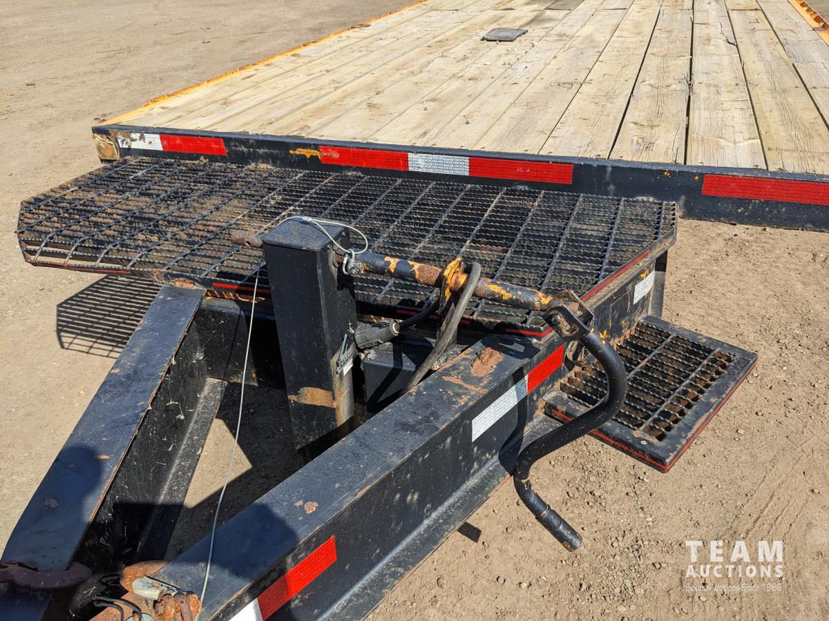 96 inch wide deck, 24 ft tilt deck, 72 inch beaver tails, wood deck, flip over ramps, electric brakes, spring suspension, rub rails, stake pockets, pintle hitch, 10000 lb axles, 235/80R16 tires