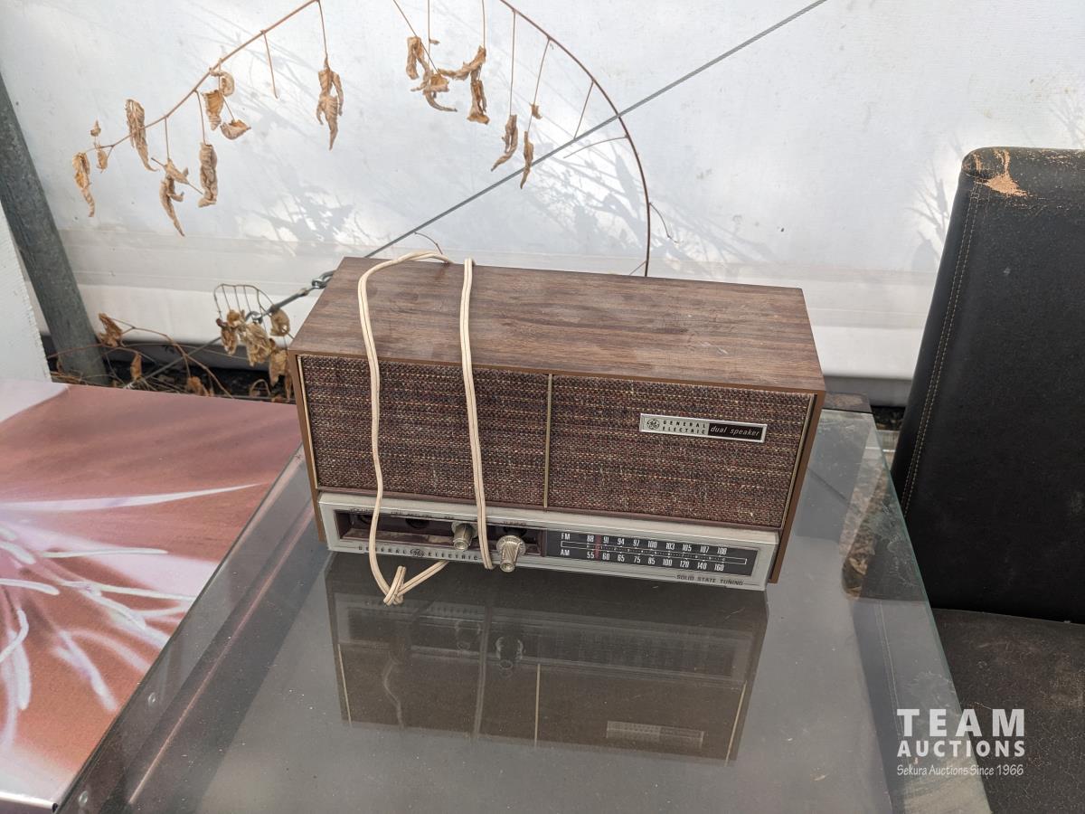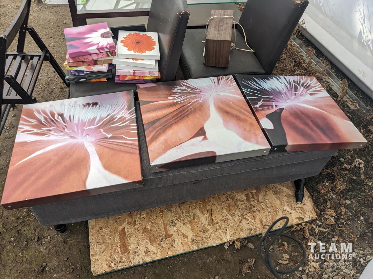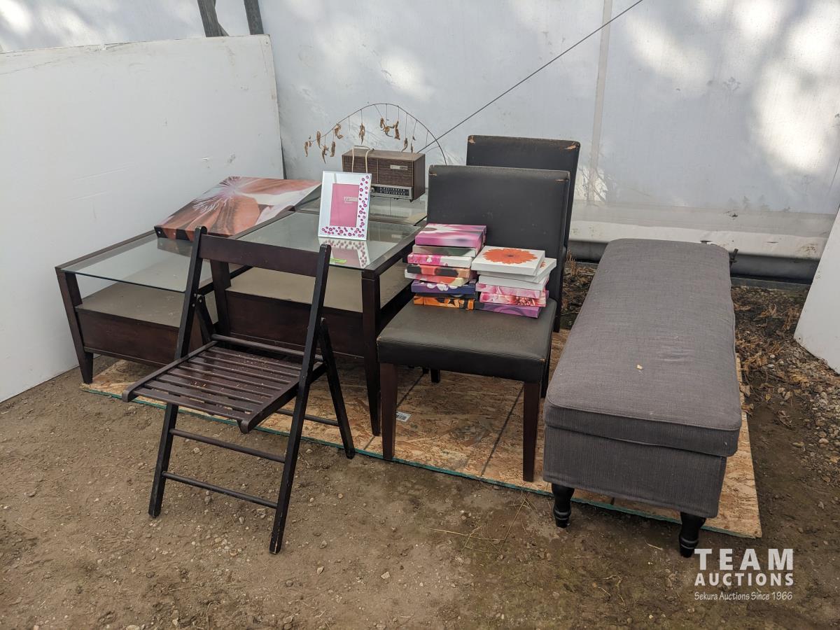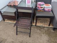 (2) chairs, folding chair, (2) side tables, 24 inch wide X 20 inch deep X 24 inch high, (1) side table 64 inch wide X 24 inch deep X 19 inch high, ottoman, qty of pictures, picture frame and radio