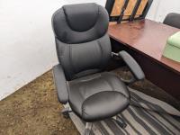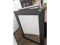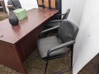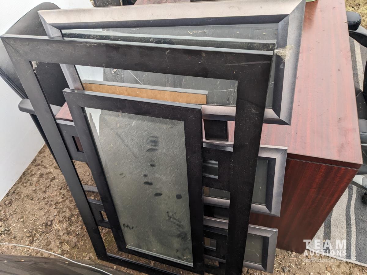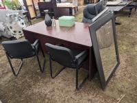 Desk 71 inch wide X 35.5 inch wide X 29.5 inch high, (3) chairs, (3) mirrors, set of tins, picture, rug, misc