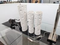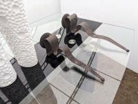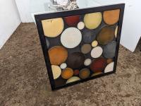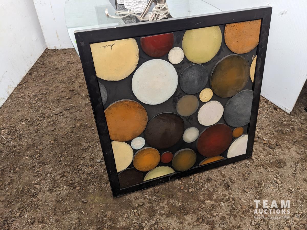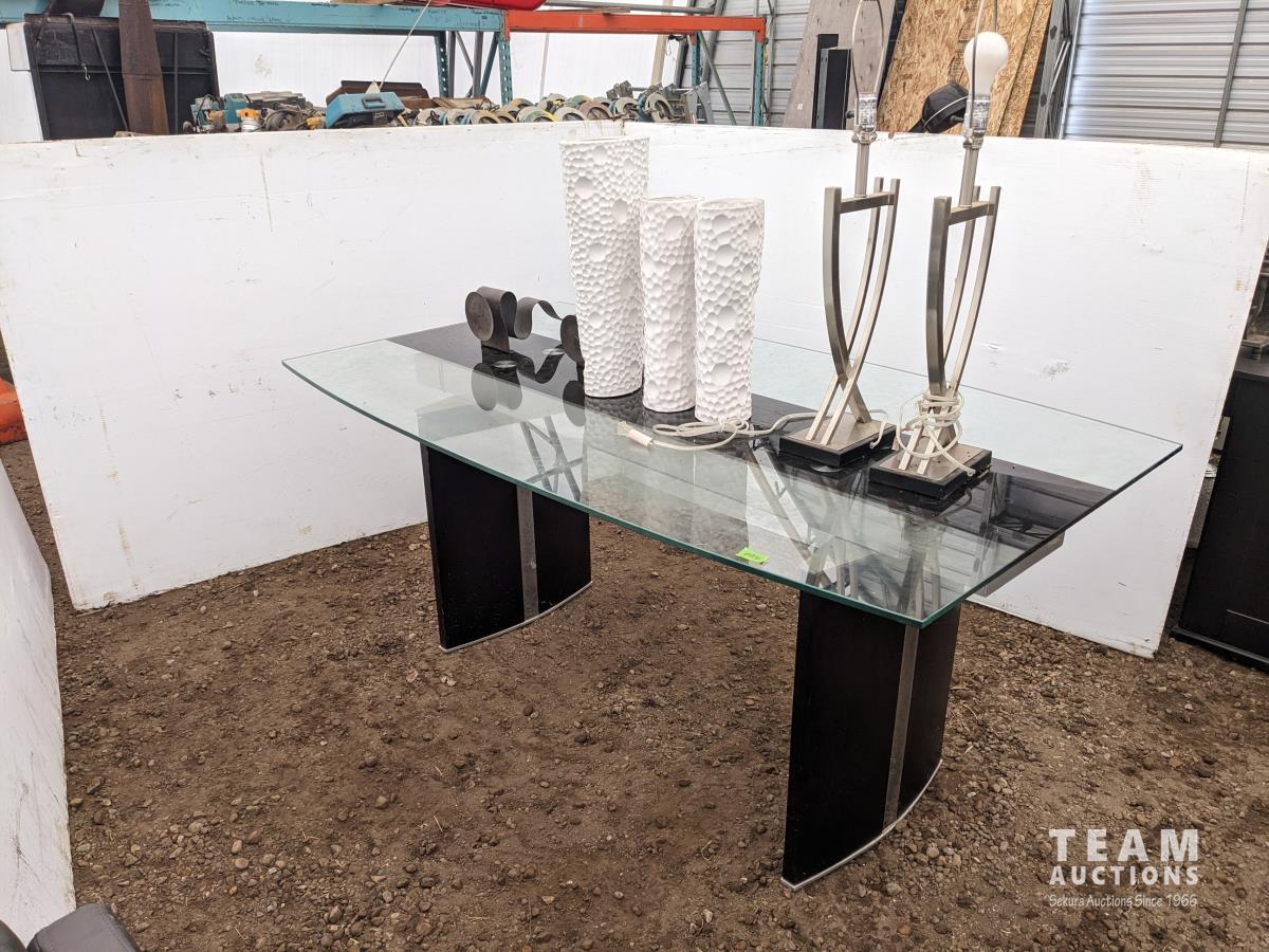 Glass top table 67 inch long X 39.5 inch wide X 30 inch high, framed picture, (2) table lamps, (3) vases, (2) candle holders