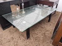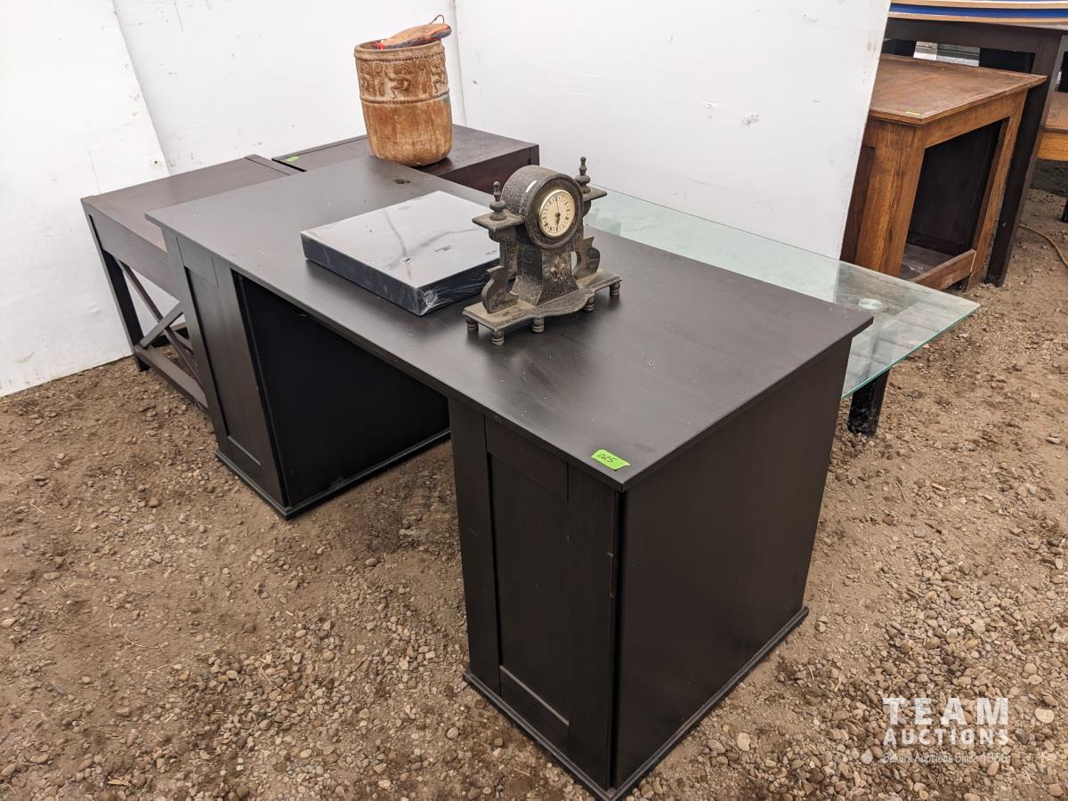 Desk 60 inch wide X 26 inch deep X 29 inch high, table 55 inch long X 31.5 inch wide X 17 inch high, clock, (2) table lamps, plant pot