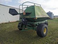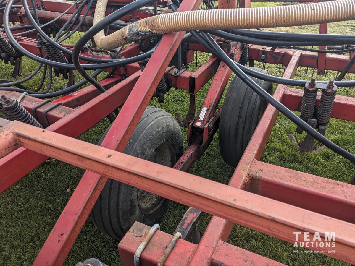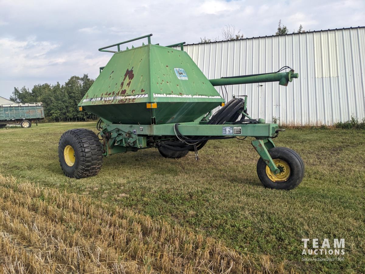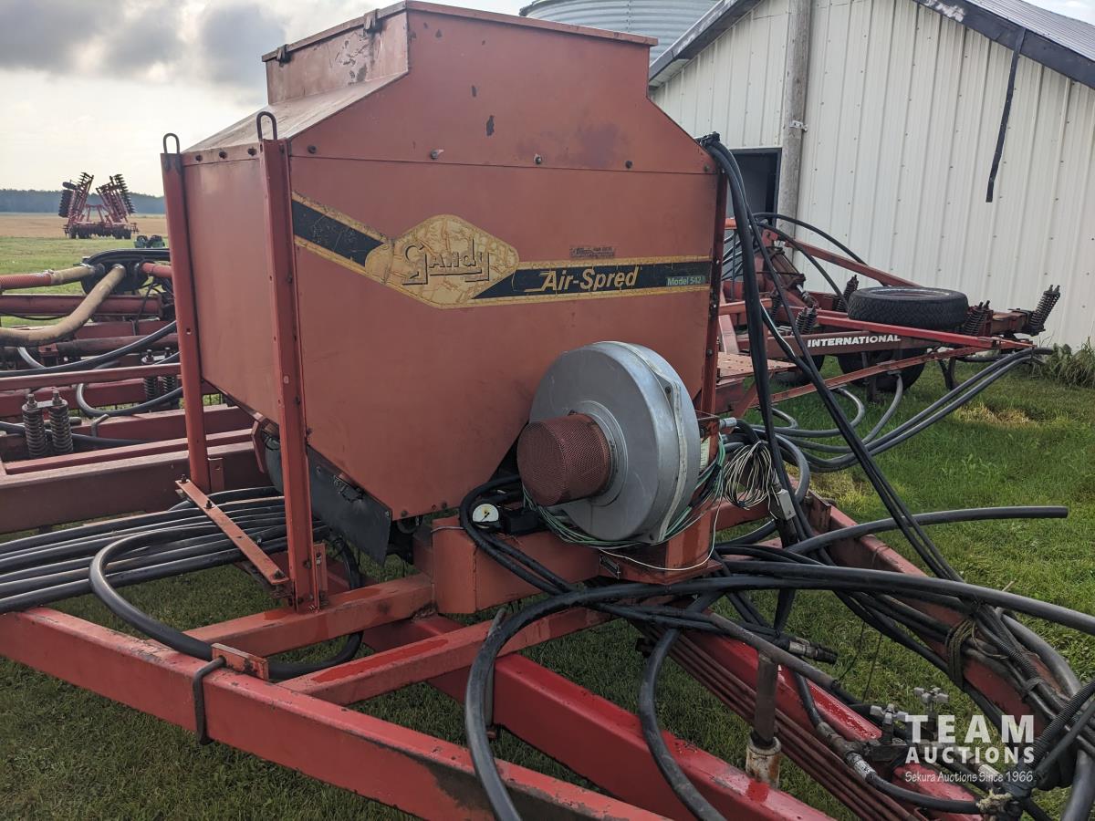 12 inch spacing, sweeps, Degelman 3 bar harrows, Gandy 5424 hydraulic drive applicator, walking axles on main frame and wings, John Deere 777 dual compartment air cart, course and fine feed rolls, single hydraulic fan, 21.5-16 tires