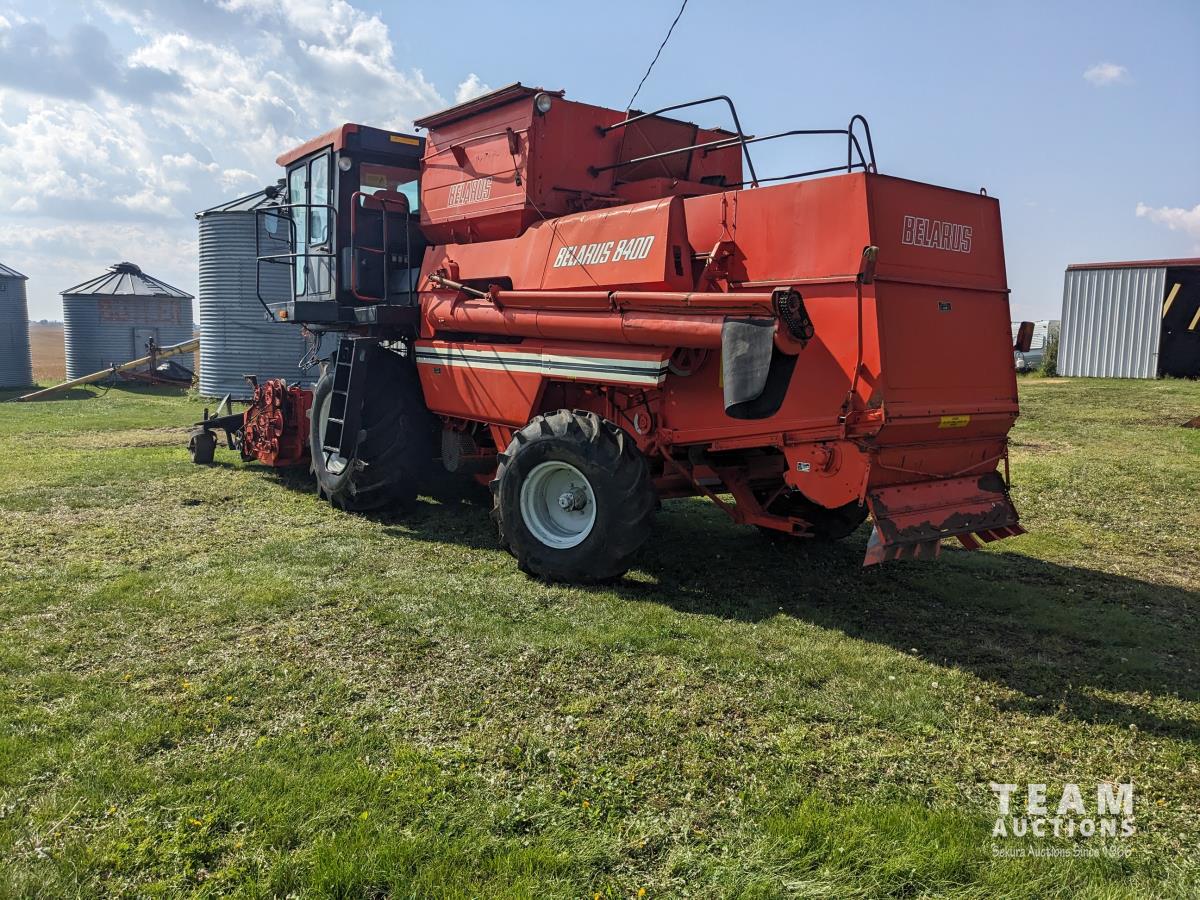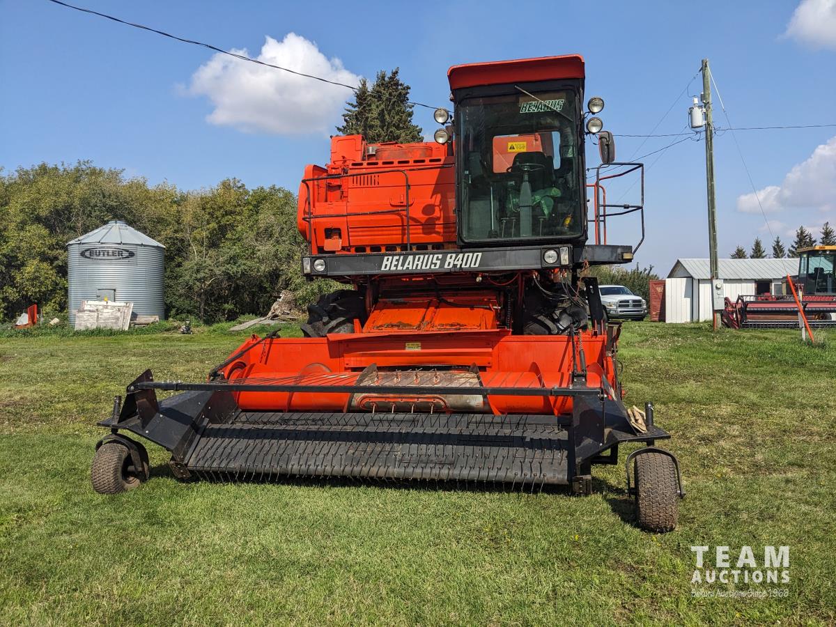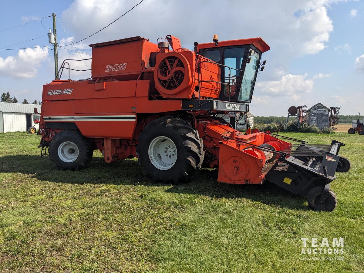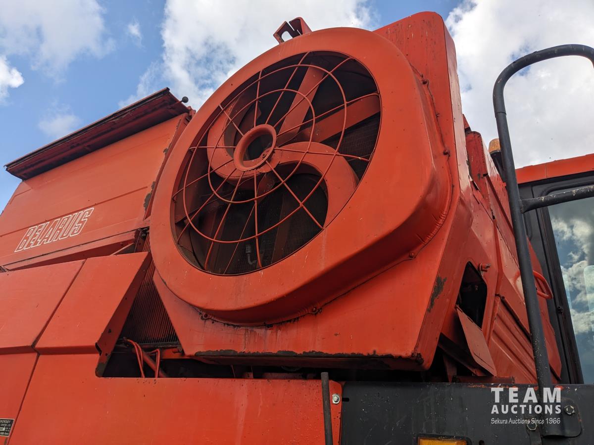 1994 Belarus 12 ft pick-up header, Super 7 pickup, reverser, chopper, 6 cylinder diesel engine, 3 spd transmission, 60" cylinder, 240 bu grain tank, A/C, radio, 30.5L-32 front tires, 18.4-24 rear tires