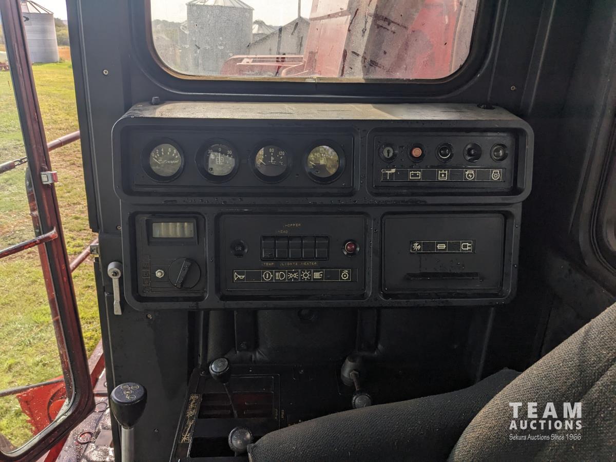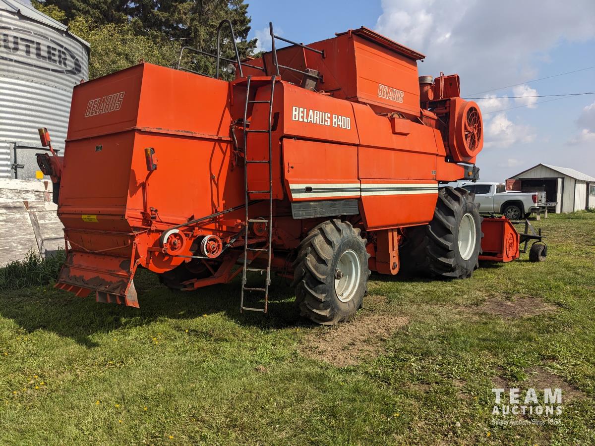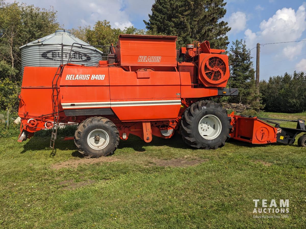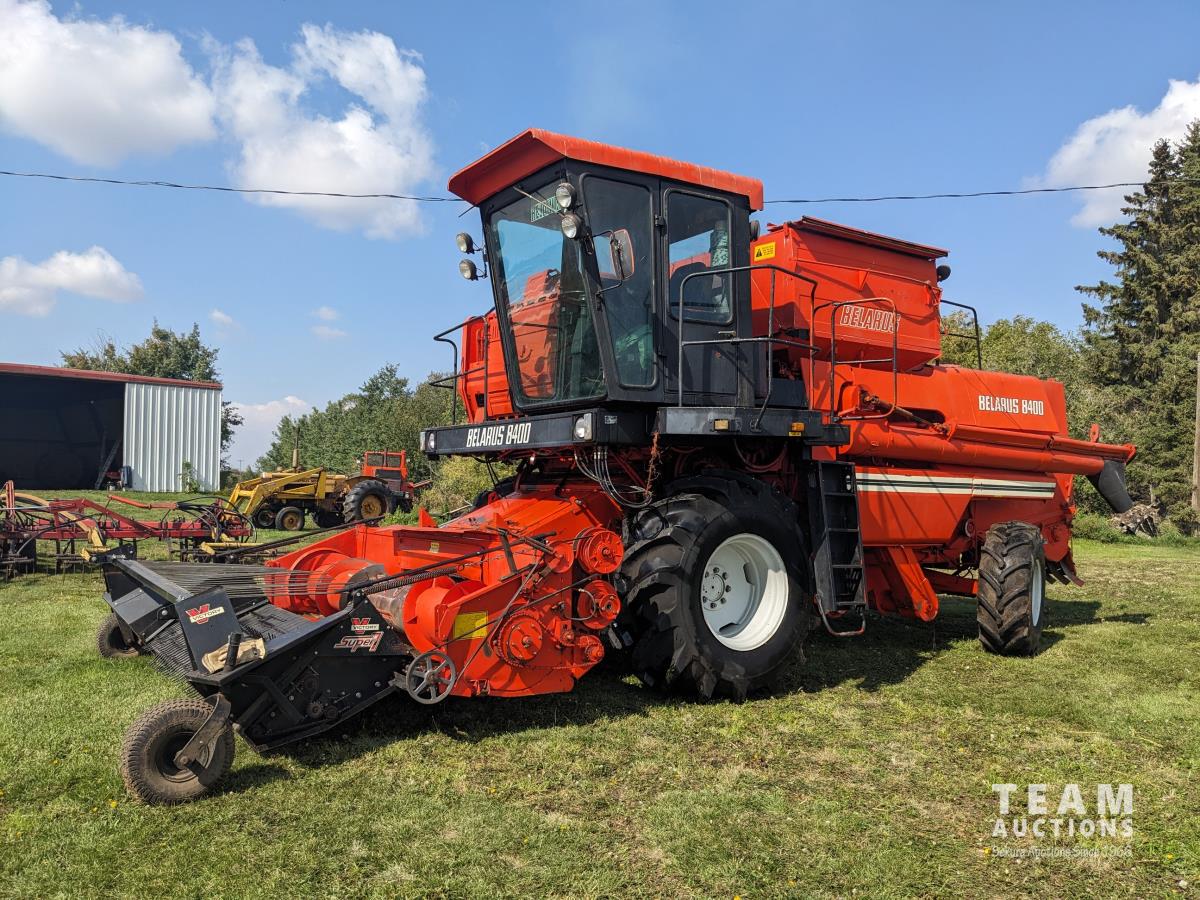 1994 Belarus 12 ft pick-up header, Super 7 pickup, reverser, chopper, 6 cylinder diesel engine, 3 spd transmission, 60" cylinder, 240 bu grain tank, A/C, radio, 30.5L-32 front tires, 18.4-24 rear tires