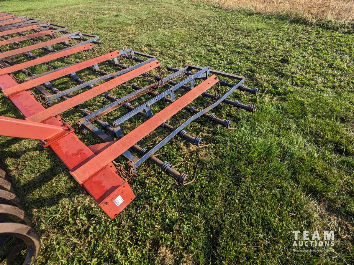 P30 packers, 5 bar spring tooth harrows, 11L-15 tires on main frame, 7.60-15 tires on wings