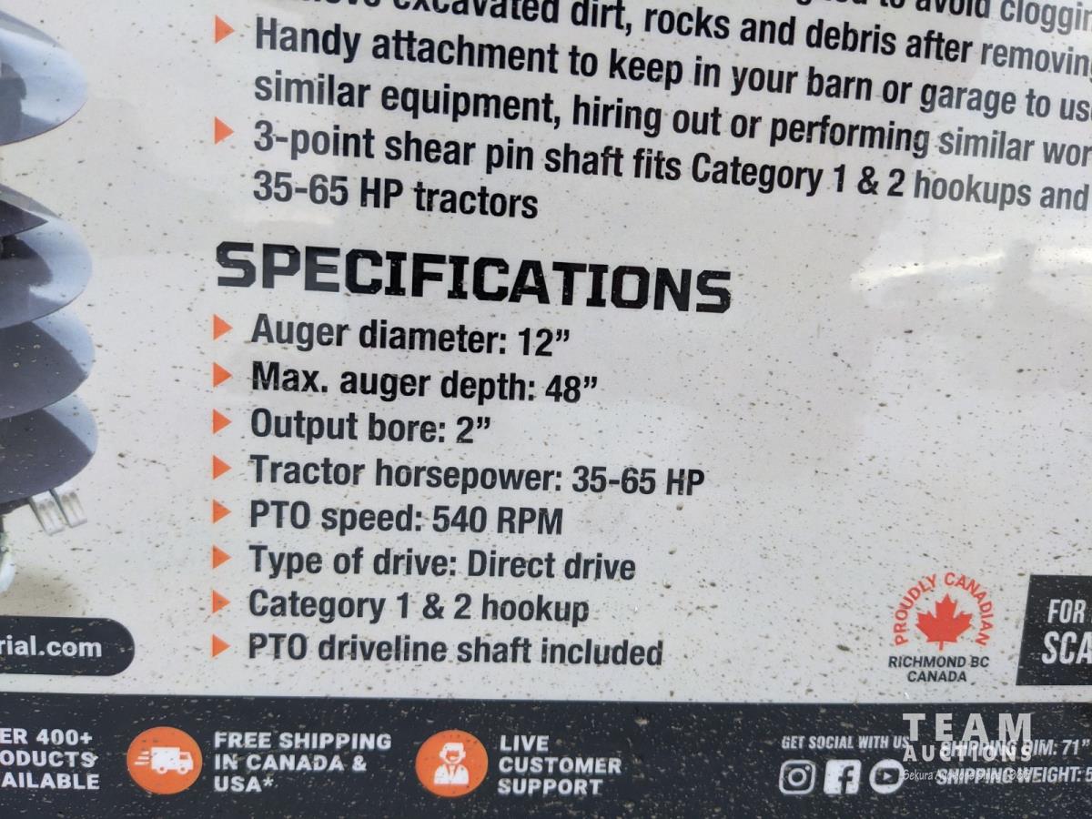 12 inch Auger, Category 1 & 2, PTO Shaft Included