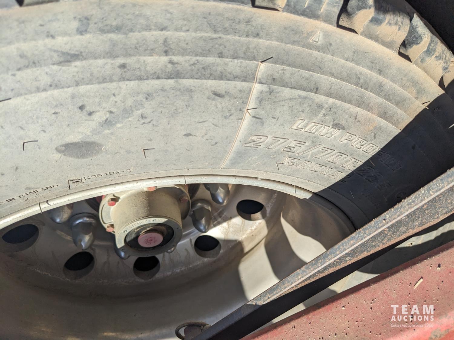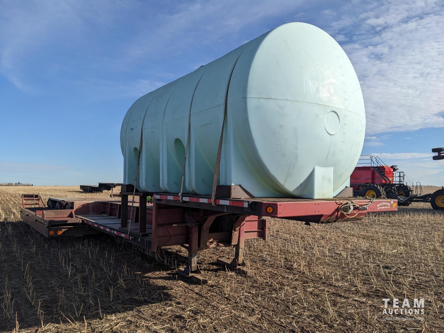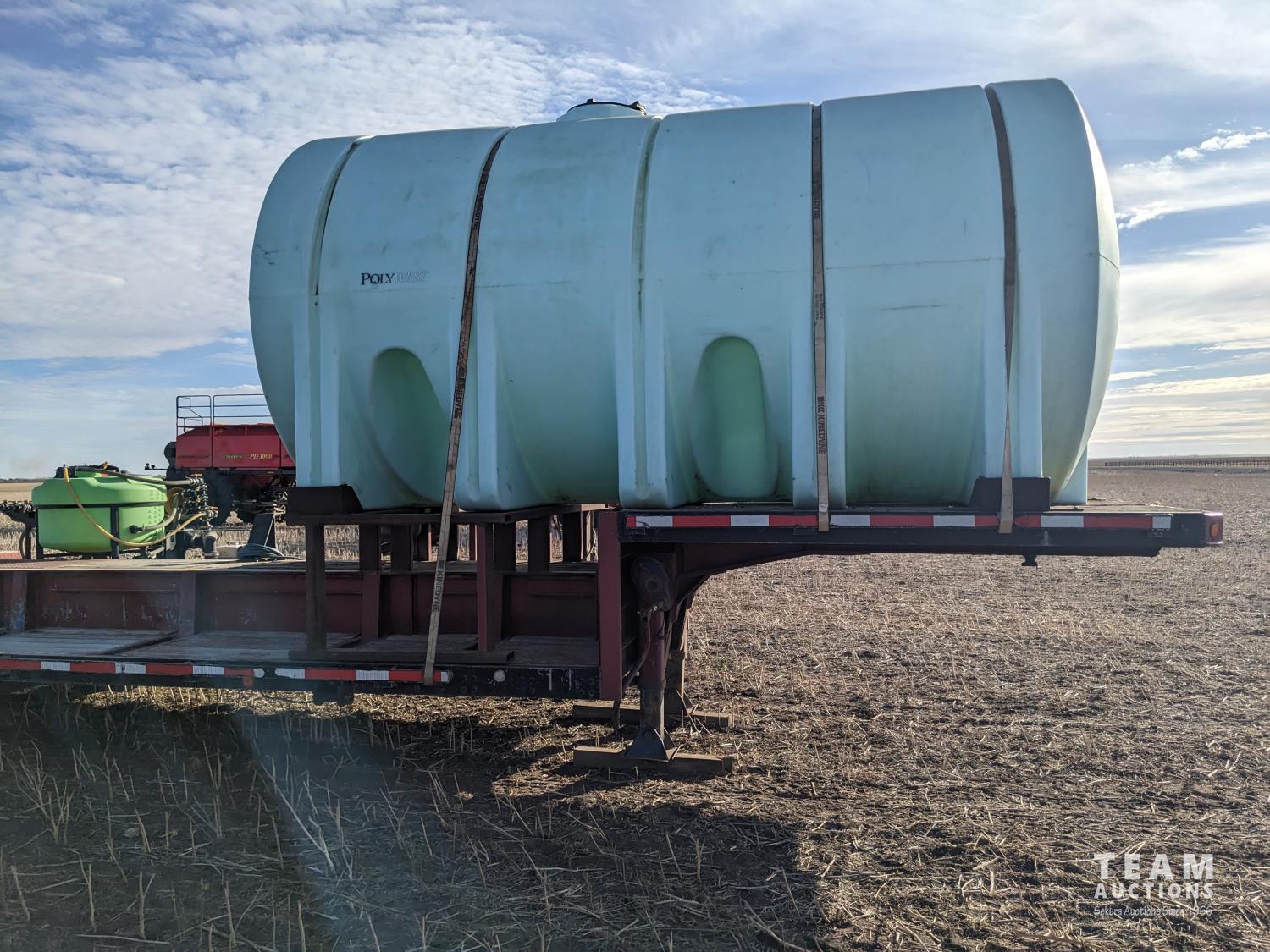 12 ft wide, 5000 gallon poly tank, Chembine chemical handler, Honda 13 HP electric start pump motor, air ride suspension, flip up ramps, aluminum rims, 275/70R22.5 tires