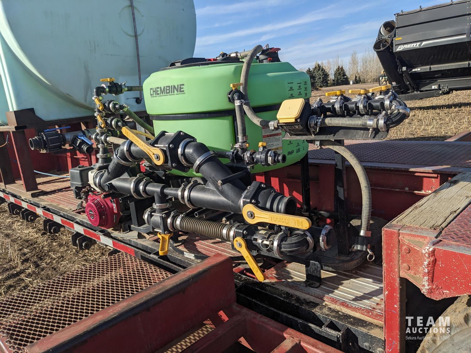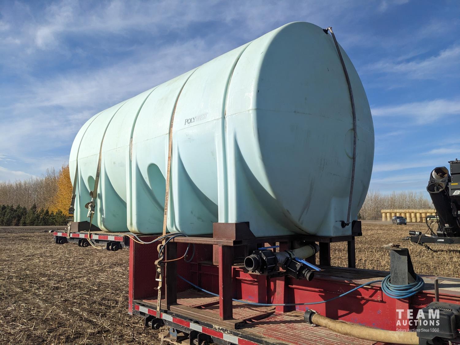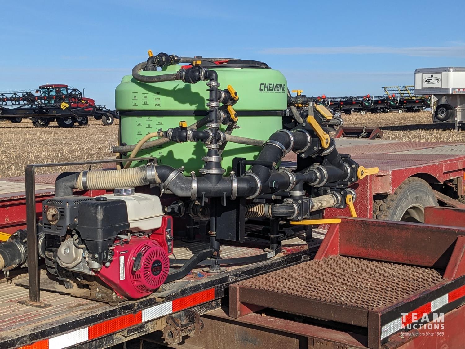 12 ft wide, 5000 gallon poly tank, Chembine chemical handler, Honda 13 HP electric start pump motor, air ride suspension, flip up ramps, aluminum rims, 275/70R22.5 tires