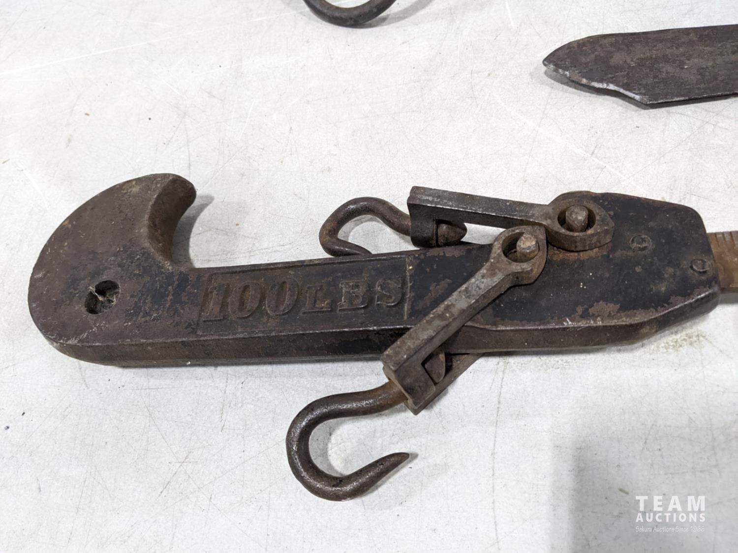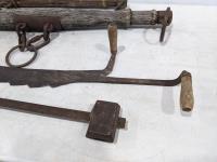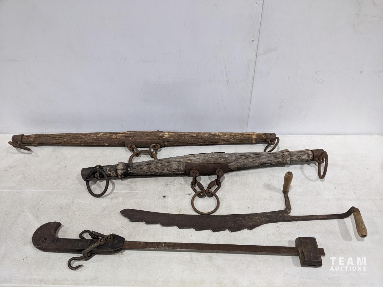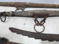 (2) wooden yokes, hay knife and 100 lb beam scale